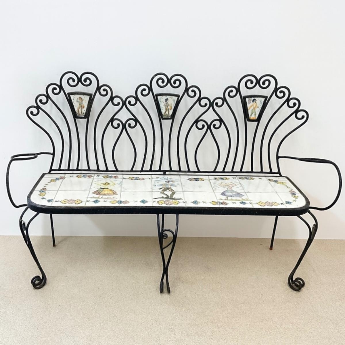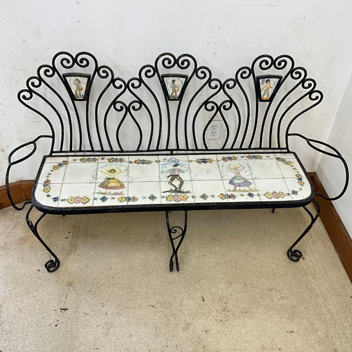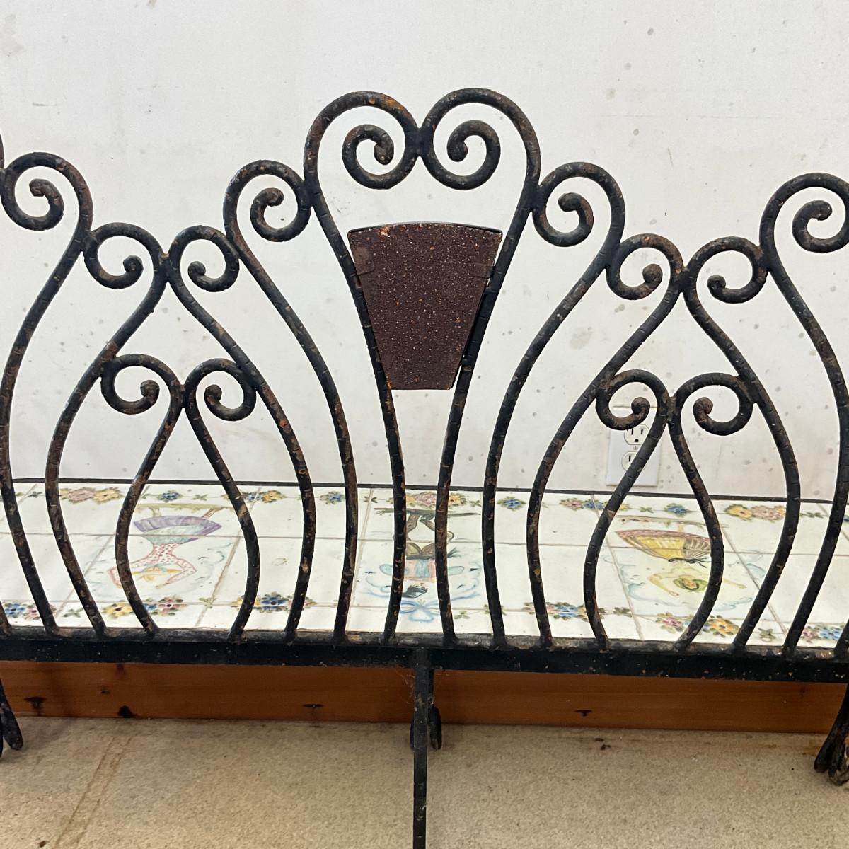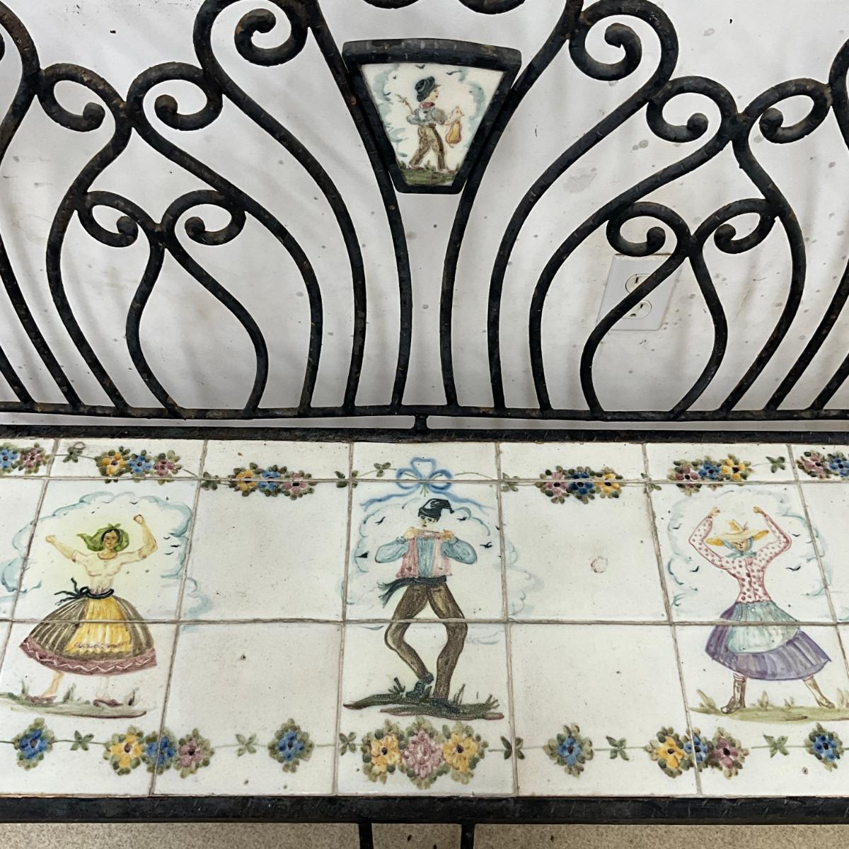 801 Antique Portuguese Wrought Iron Tile Garden Bench