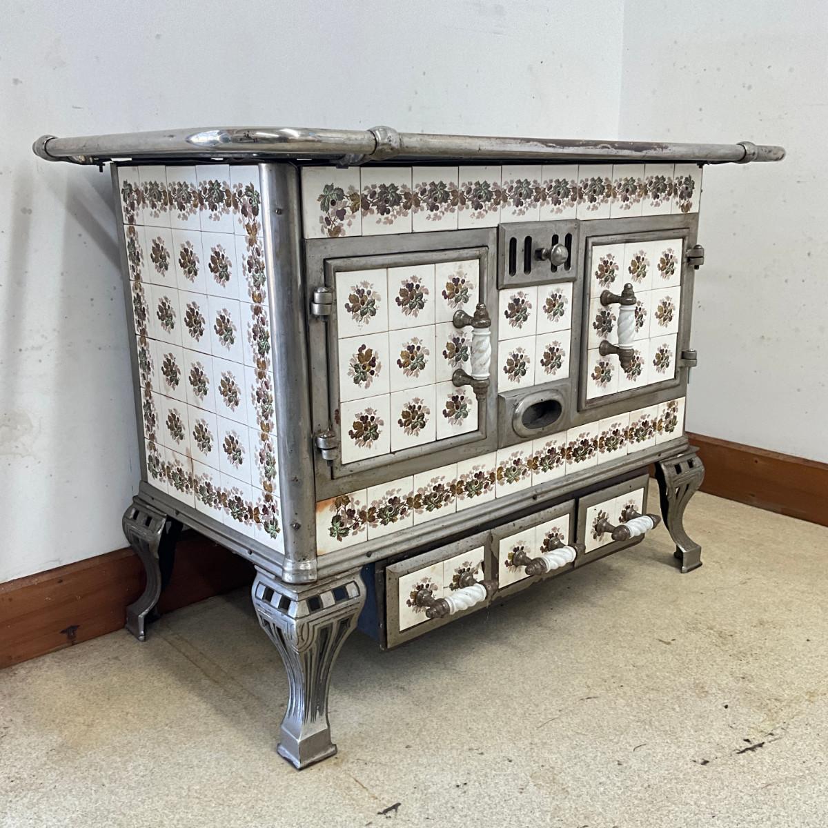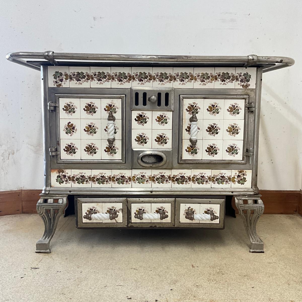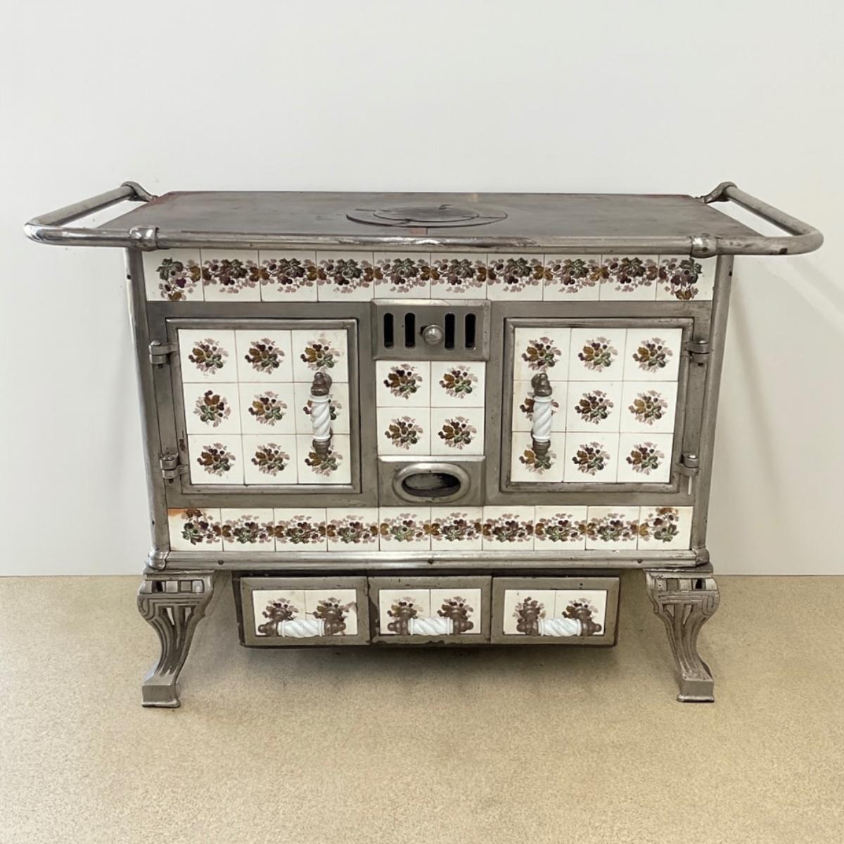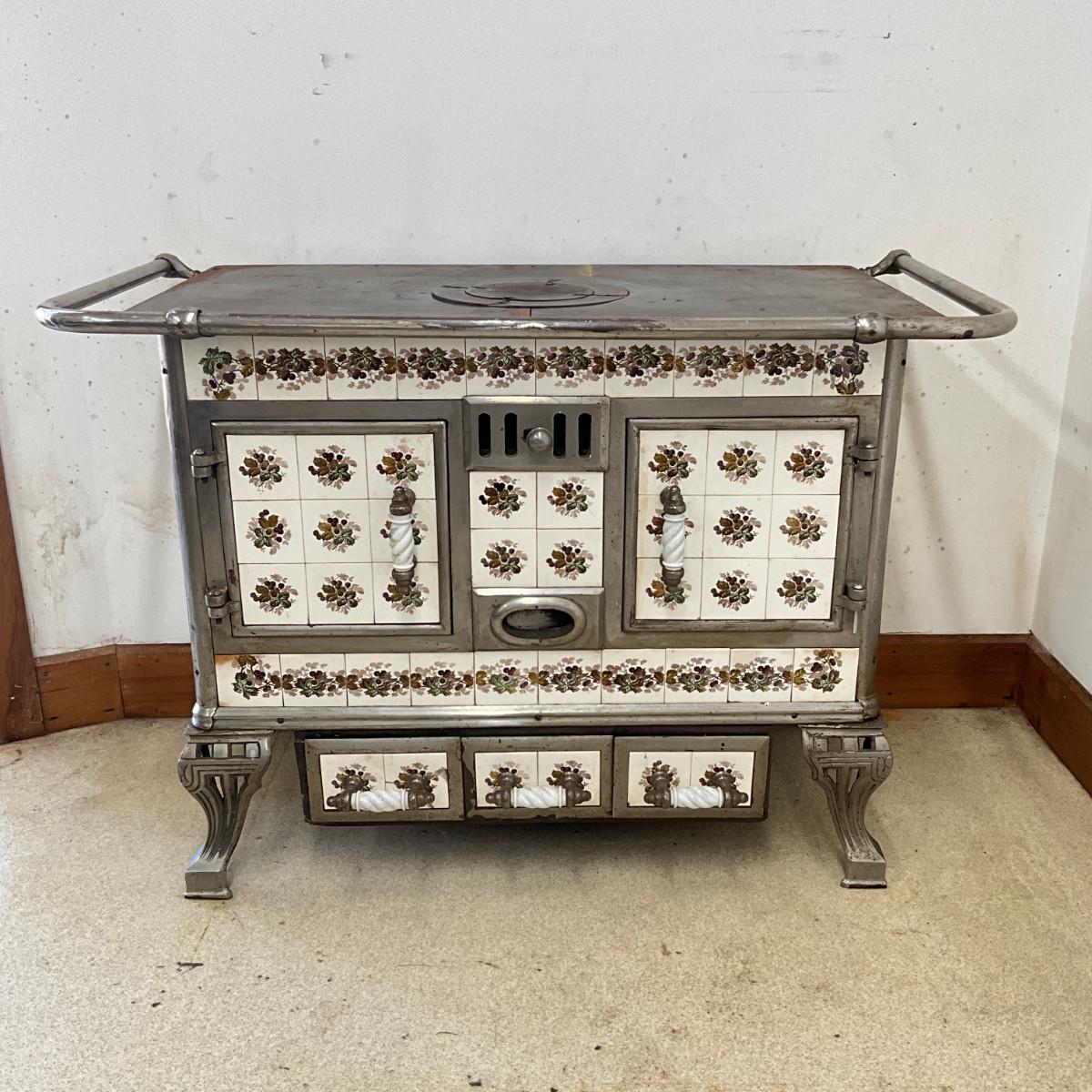 803 Vintage Chrome & French Porcelain Inset Tile Wood Stove