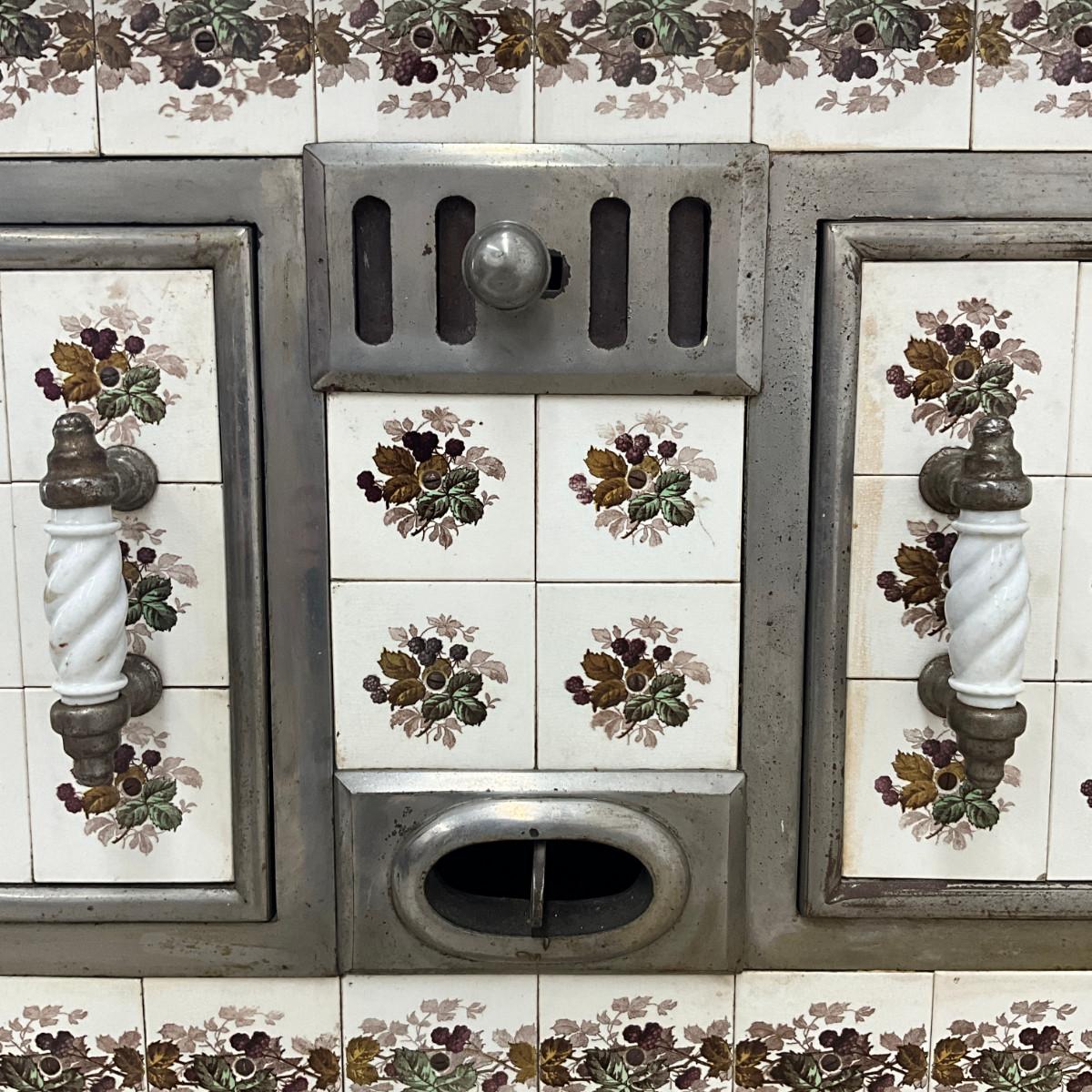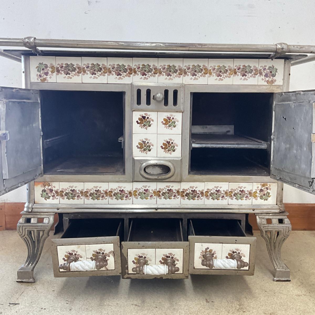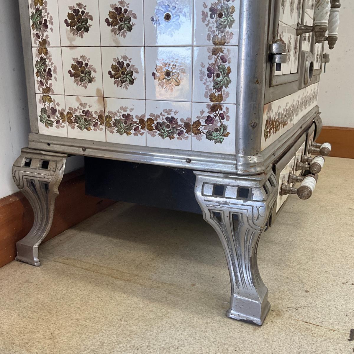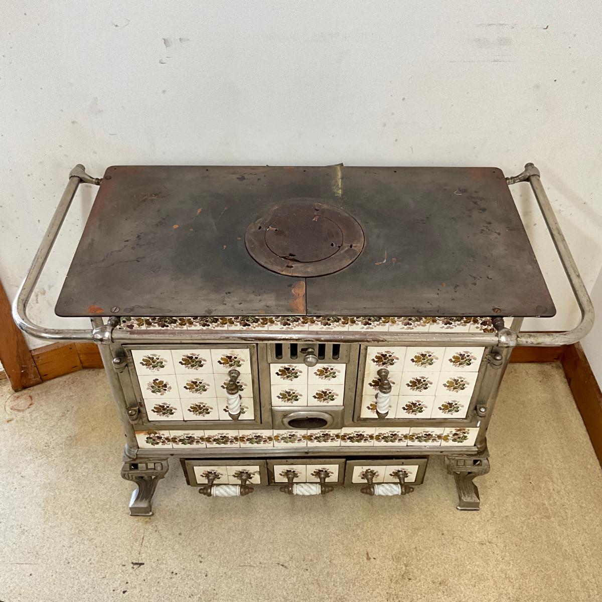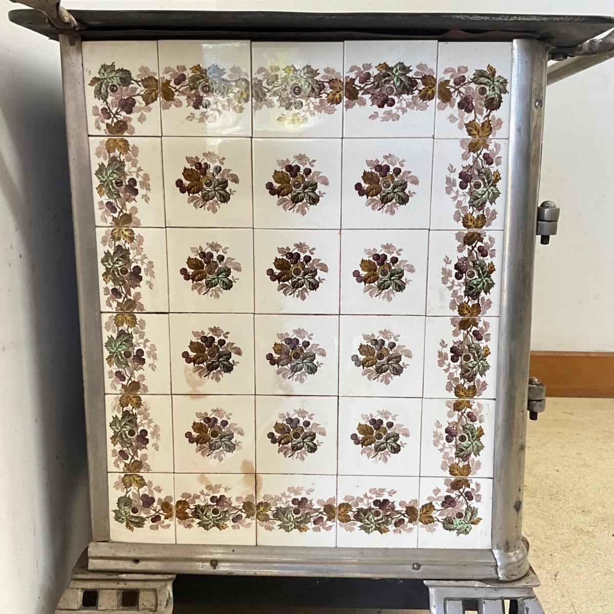 803 Vintage Chrome & French Porcelain Inset Tile Wood Stove