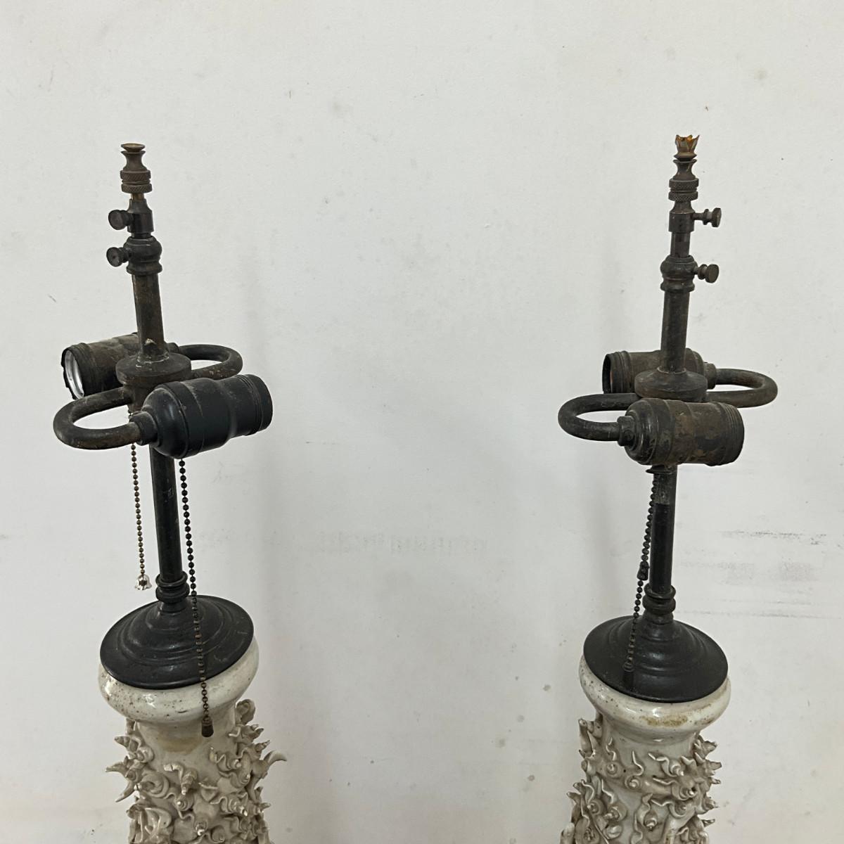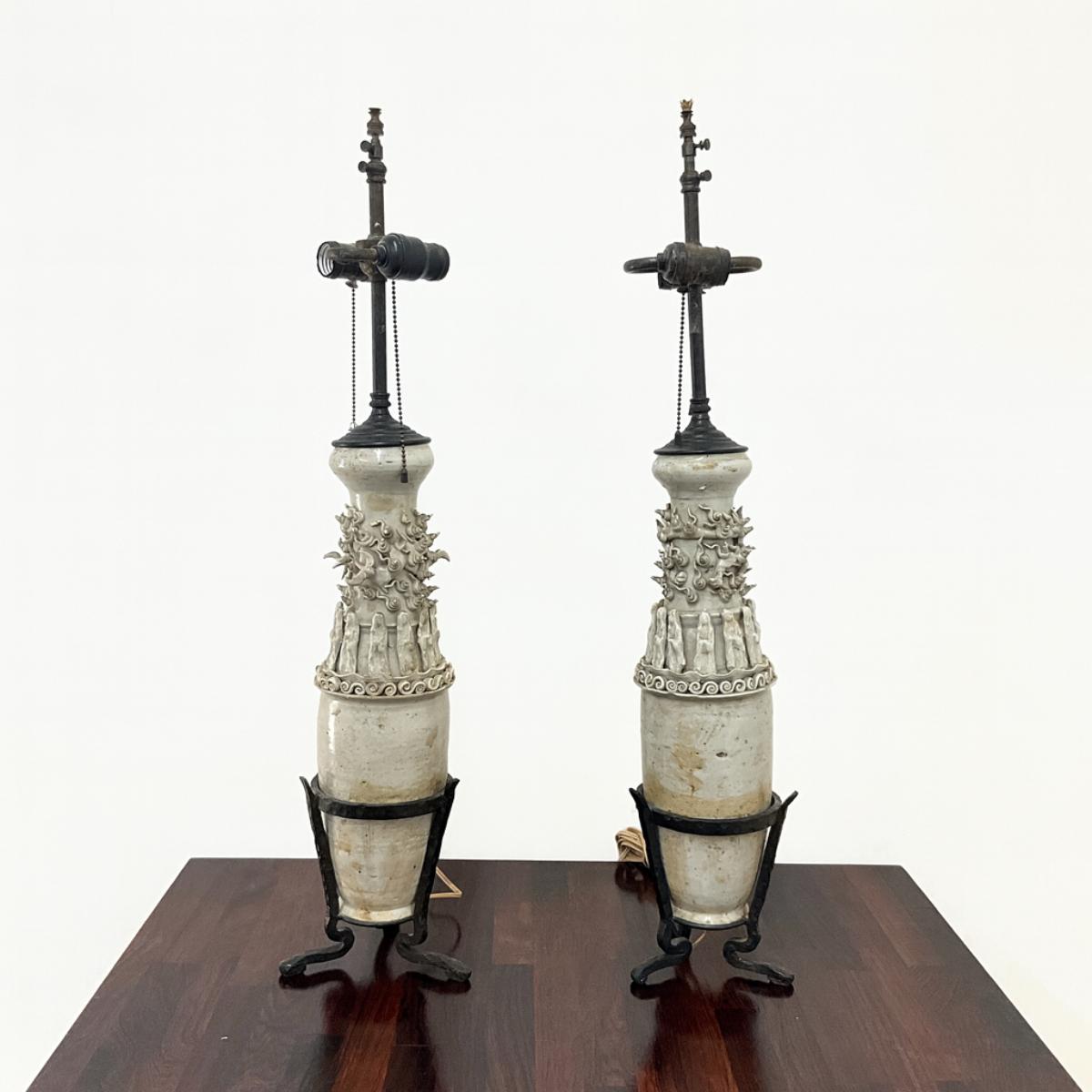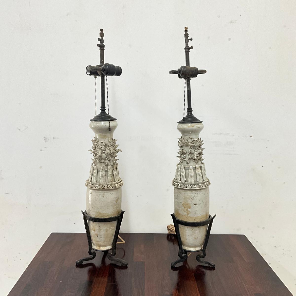 809 Antique Funerary Stoneware & Wrought Iron Table Lamps