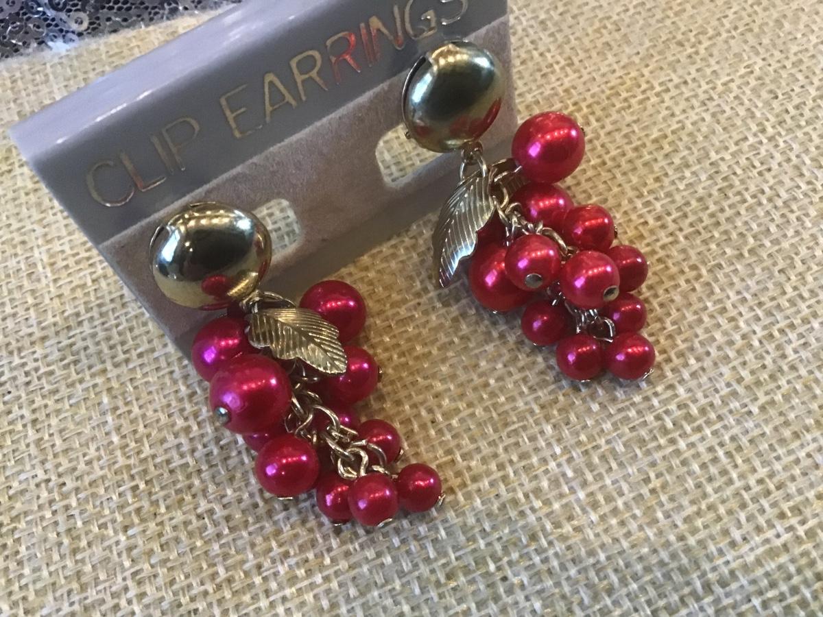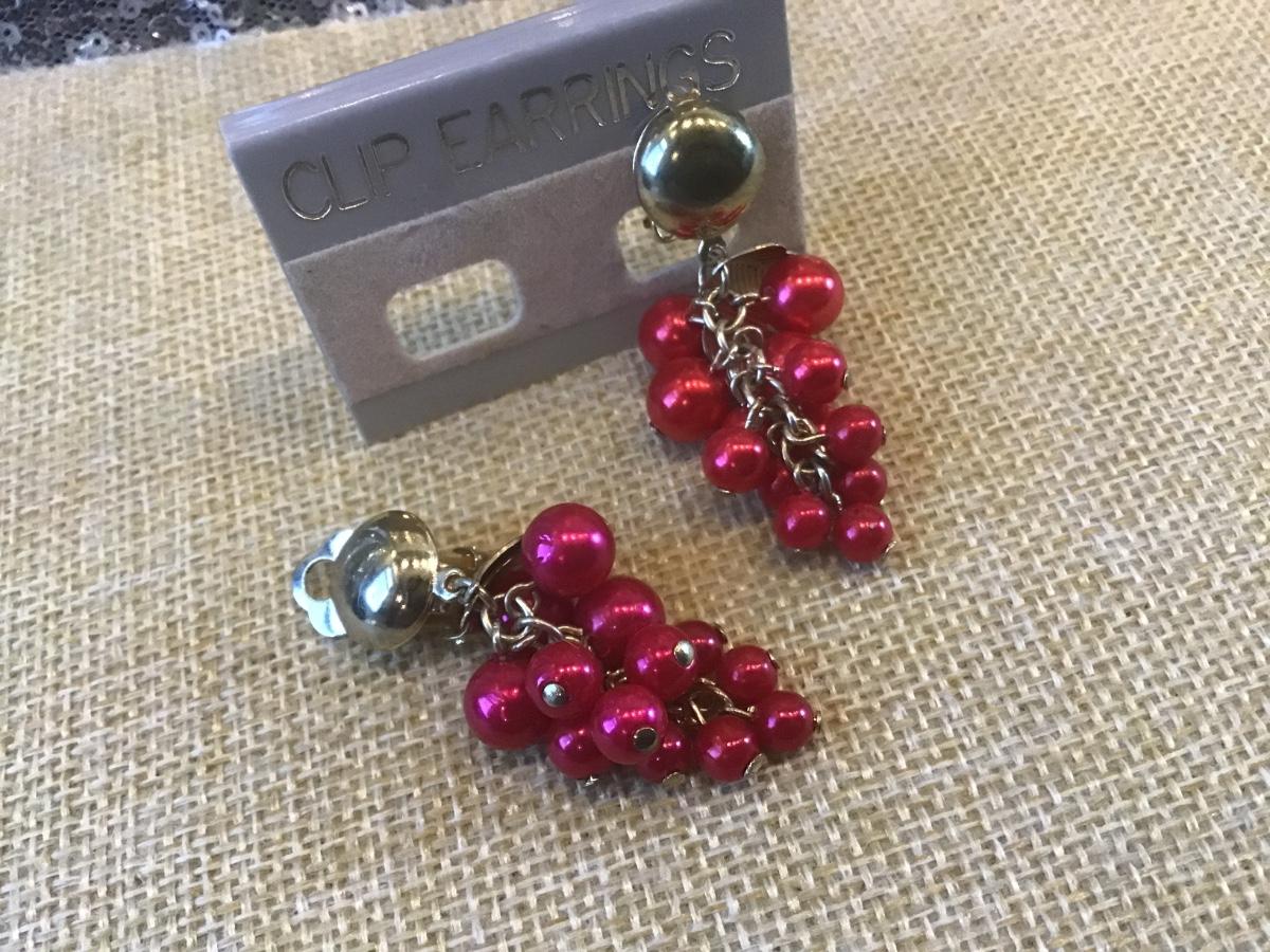 80's-90's Vintage Cranberry Red Bead Cluster Drop Dangle Clip onEarrings