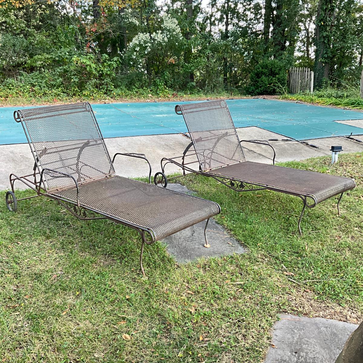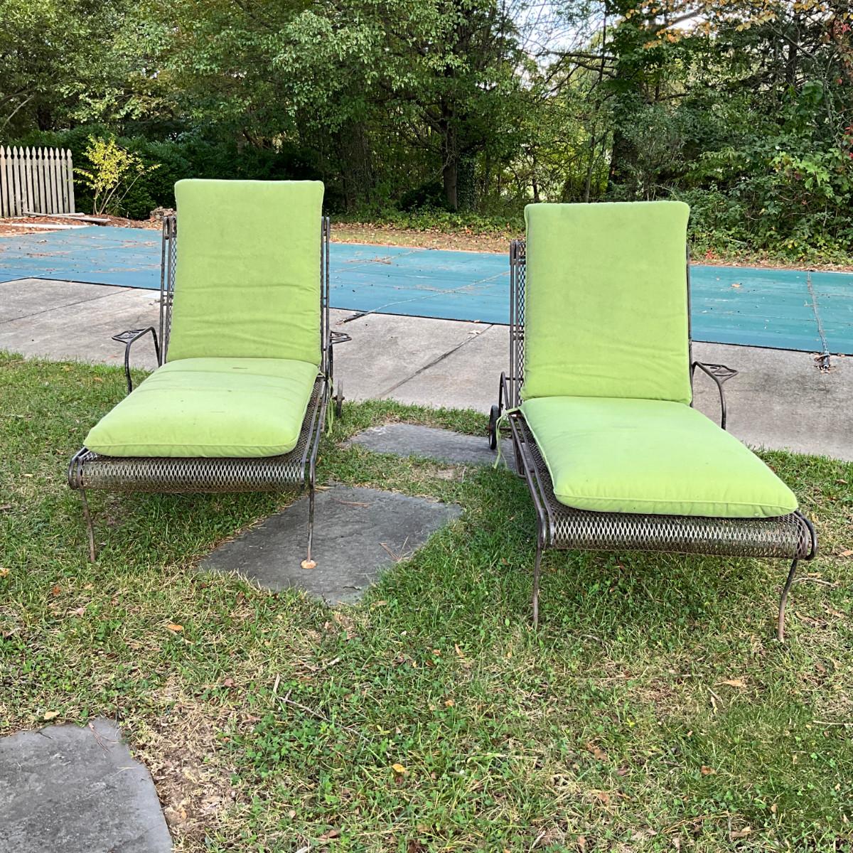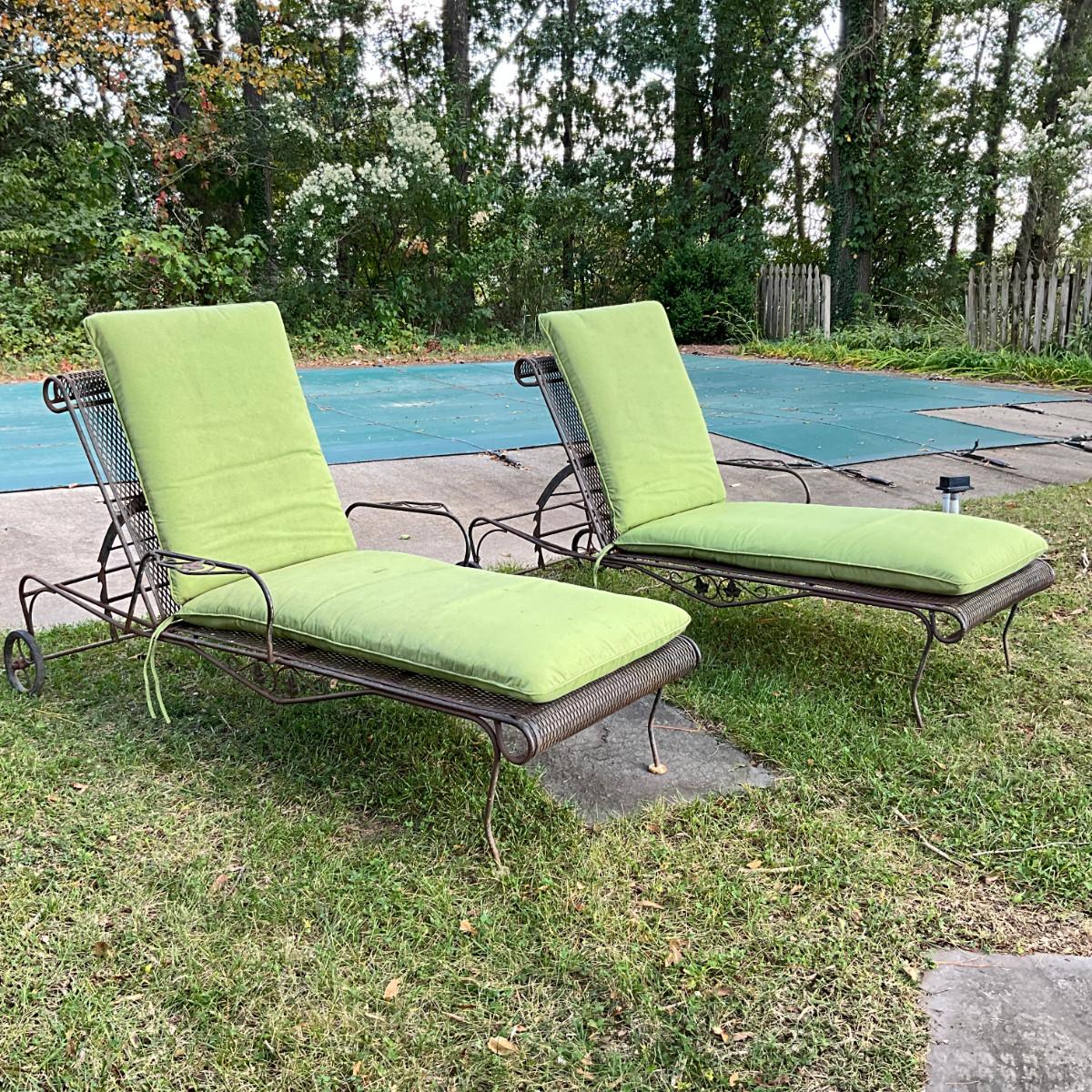 986 Pair Of Vintage Woodard Wrought Iron Chaise Lounge Chairs With Green Cushions