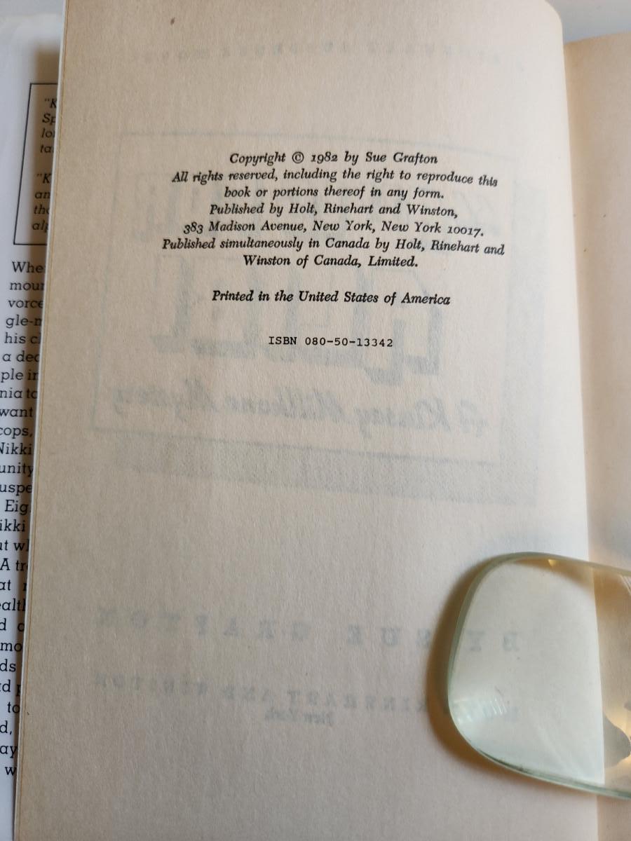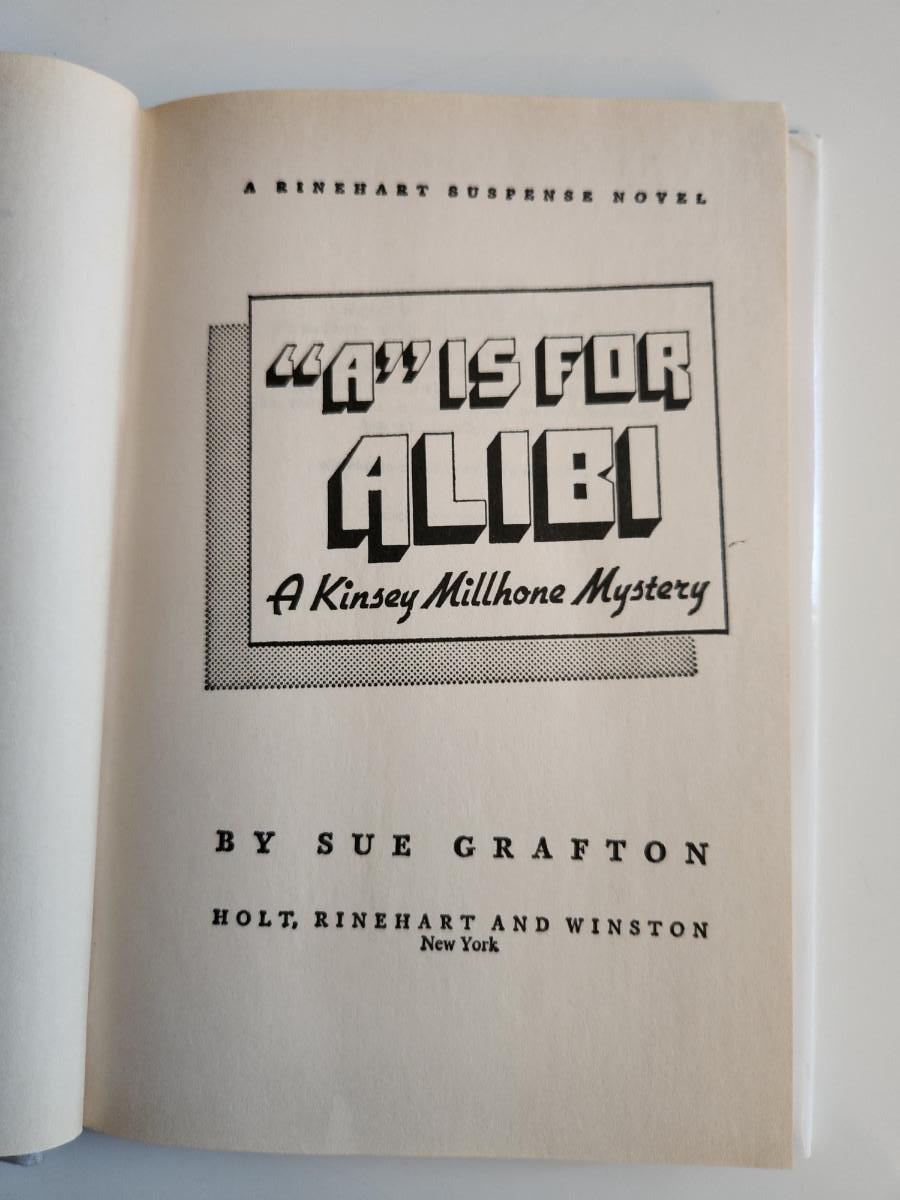 This auction lot is for a copy of the book A is For Alibi by Sue Grafton. This is a 1st Edition copy with dust jacket in good condition with minor shelf wear and a few small tears in the dust jacket. The book was published by Holt, Reinhard 1982. 209 pages. This is the book that introduced the world to Kinsey Millhone - who would eventually work her way in novels alphabetically from A to Y, with Grafton passing before the Z book was written. This book is not autographed but still quite a find for those looking to amass her collection. NOTE: This book is NOT a 1st Printing - which are extremely rare.