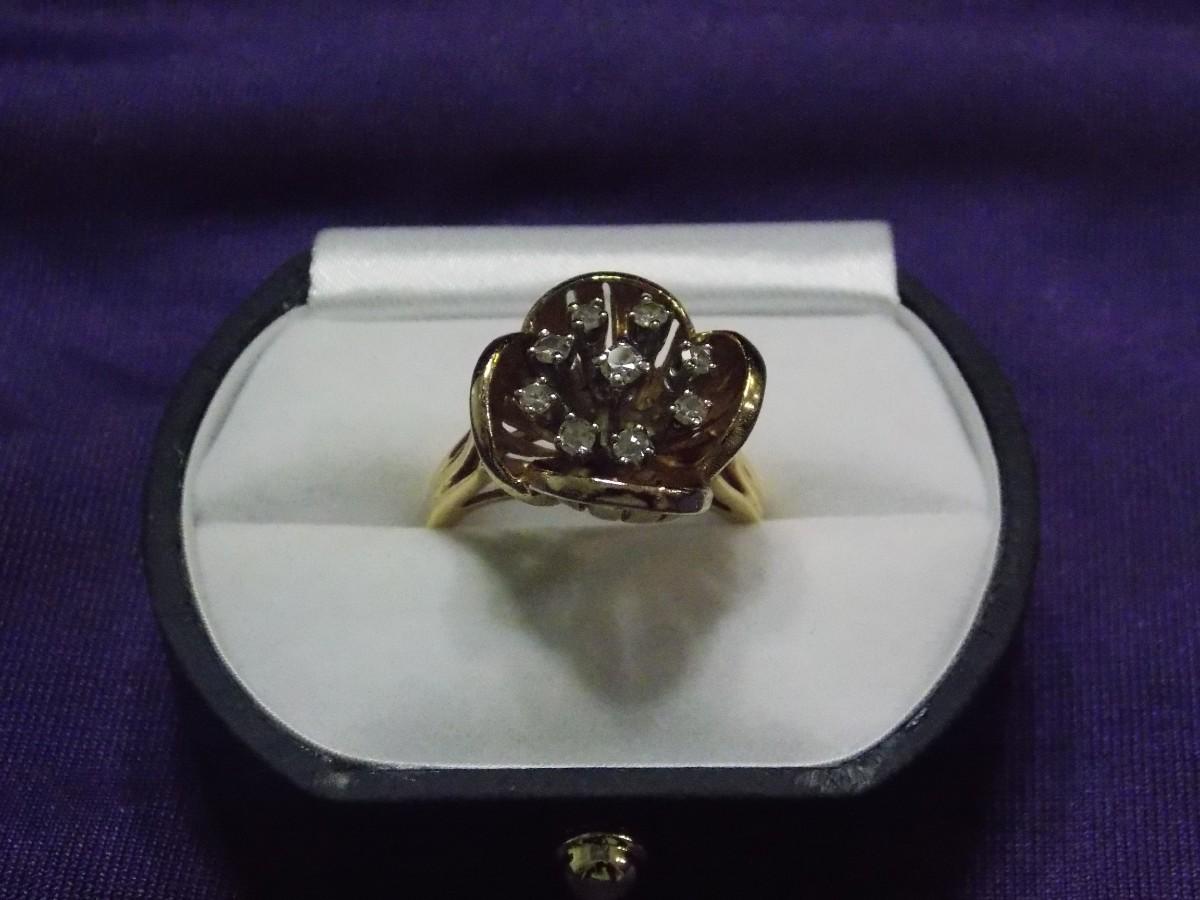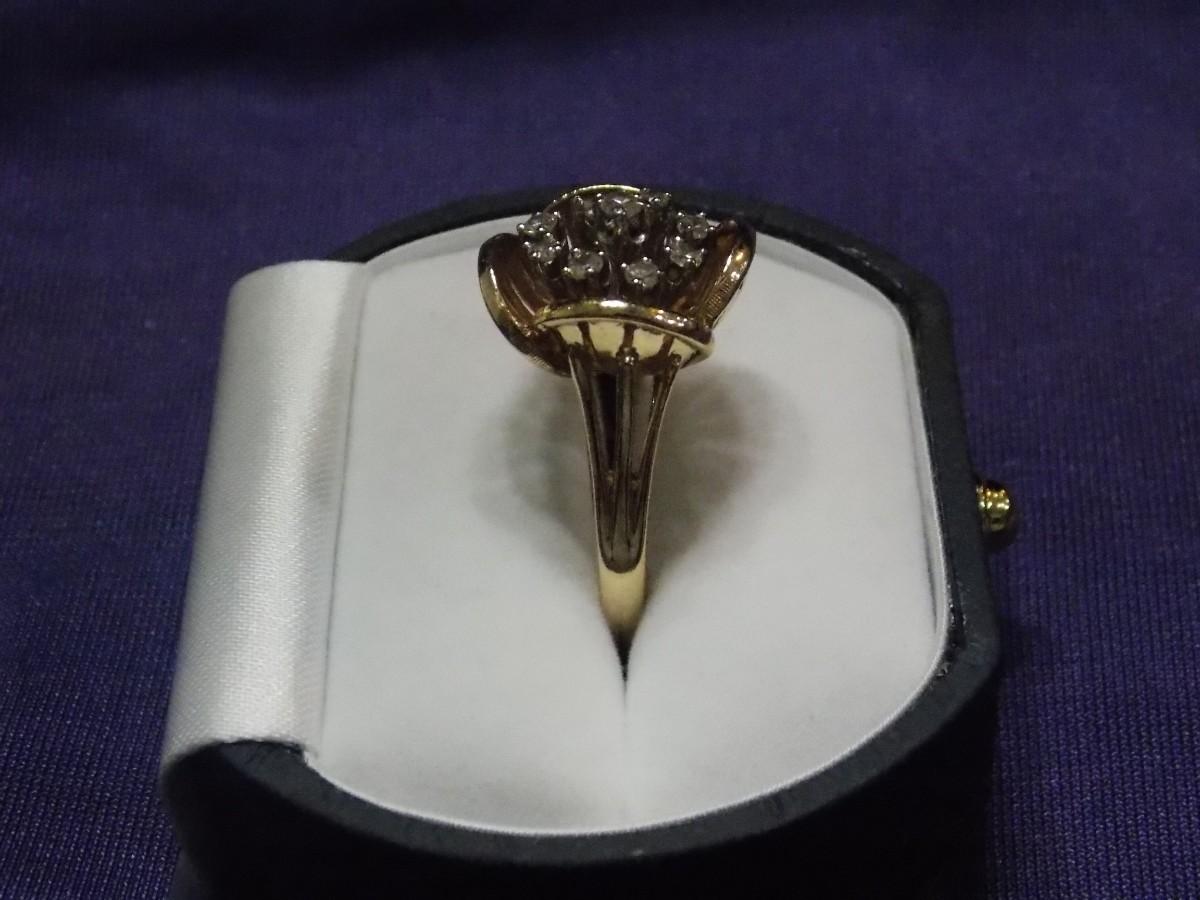 A ladies cocktail style ring in 14kt gold. It has 9 single cut diamonds w/ the total weight of .30 carats.