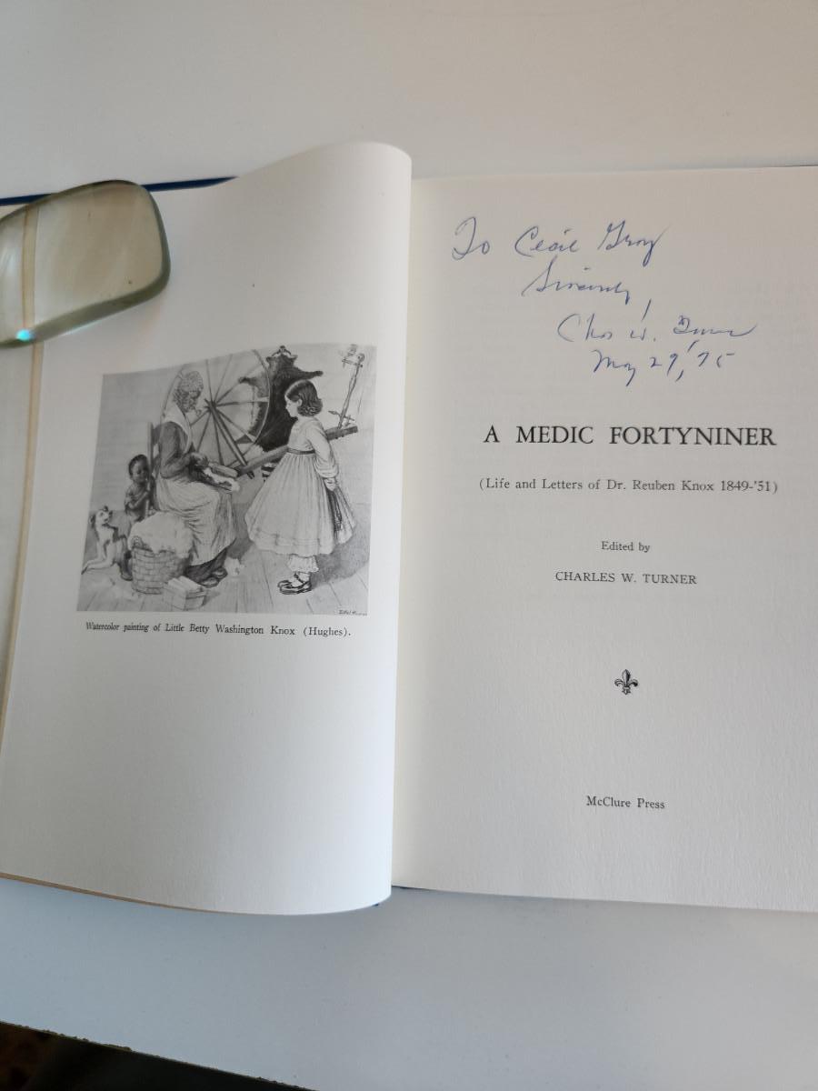 This auction lot is for a copy of the book A Medic Fortyniner by Charles W. Turner - Autographed by the author with a personal inscription dated in 1975. This hard bound book was published by McClure Press in 1974. The book contains 86 pages of letters and stories of a doctor from Missouri goes West to find his fortune in California gold. The book is crisp and clean, with a blue cloth cover and no dust jacket.