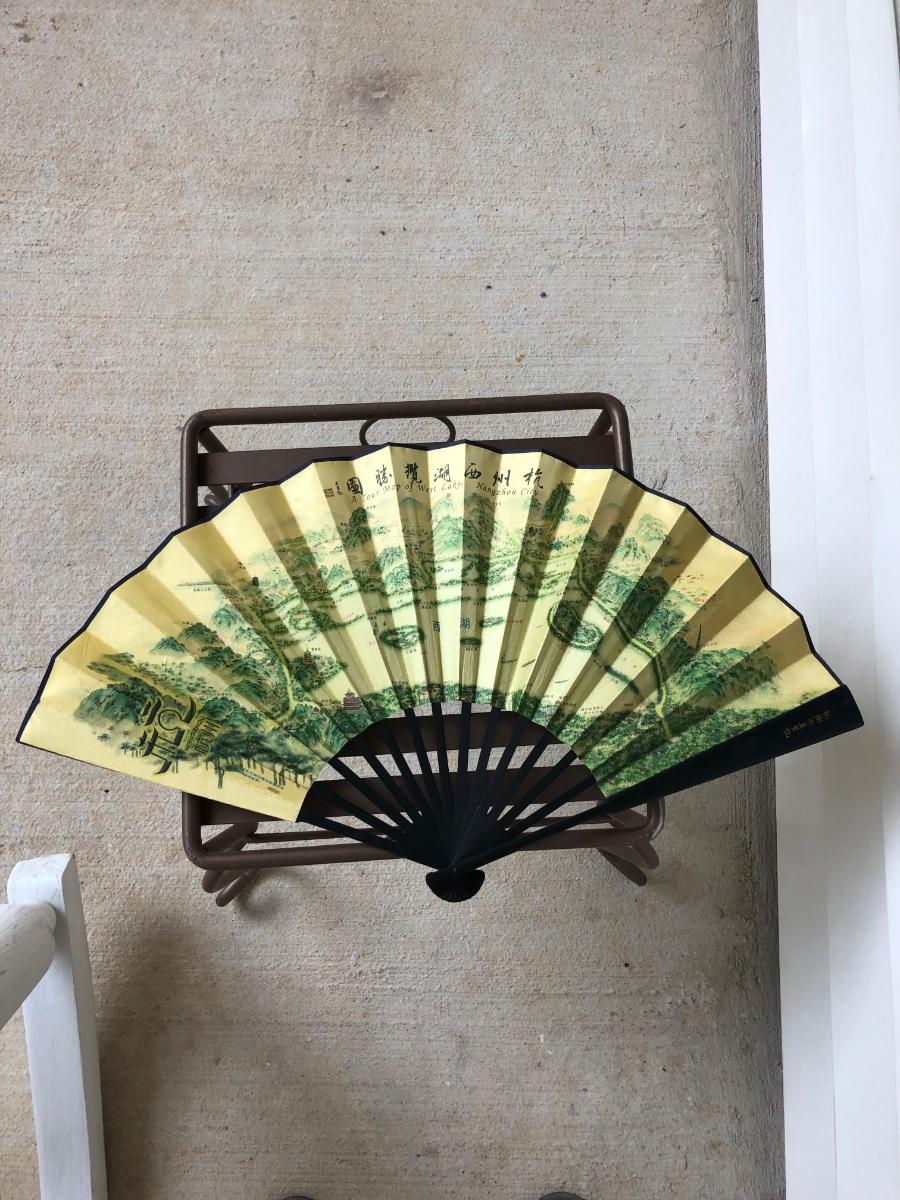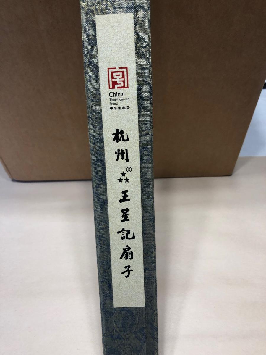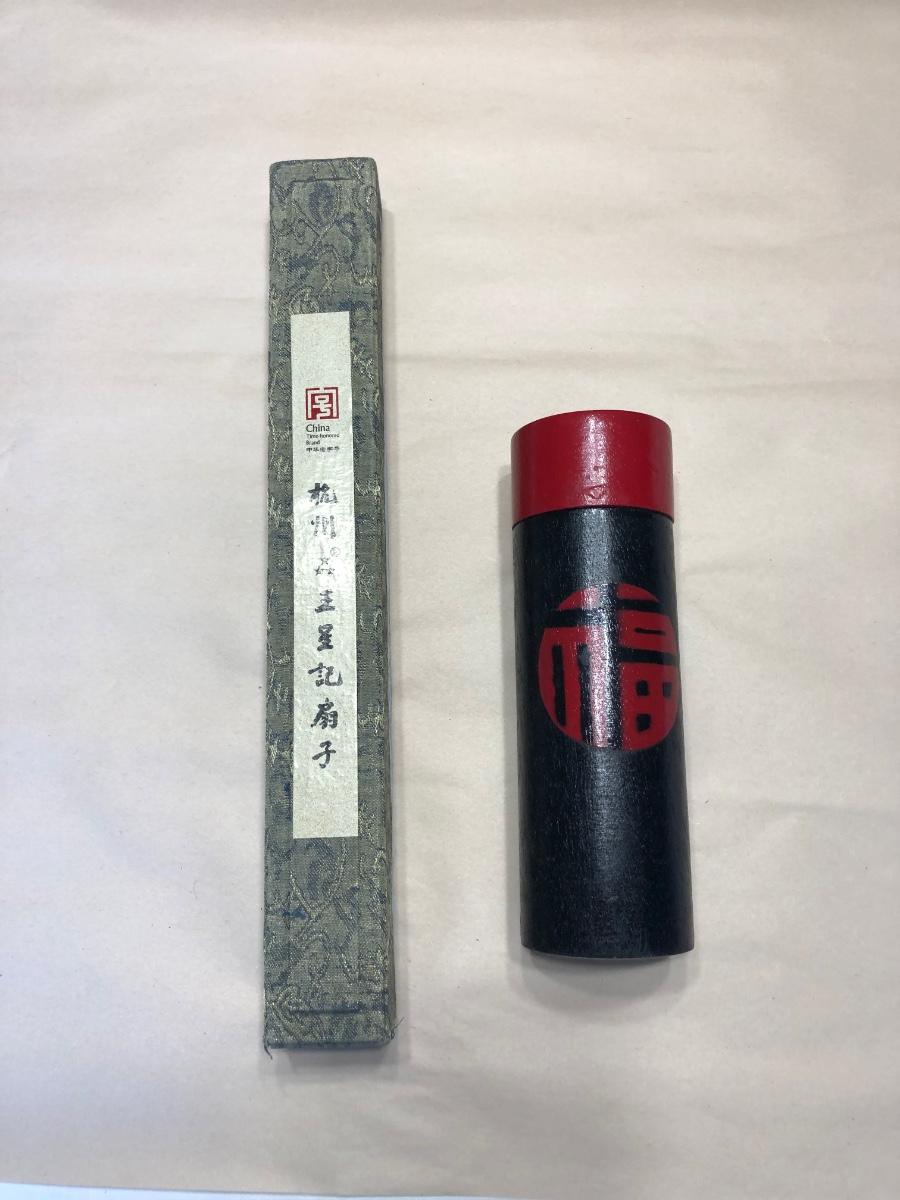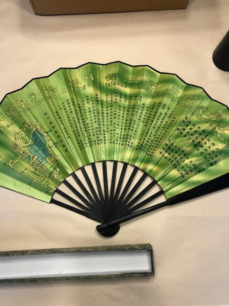 Beautiful light green “A Tour Map of West Lake” folding fan with sleeve in box. “Chien Tung” Chinese fortune sticks in wooden case.
