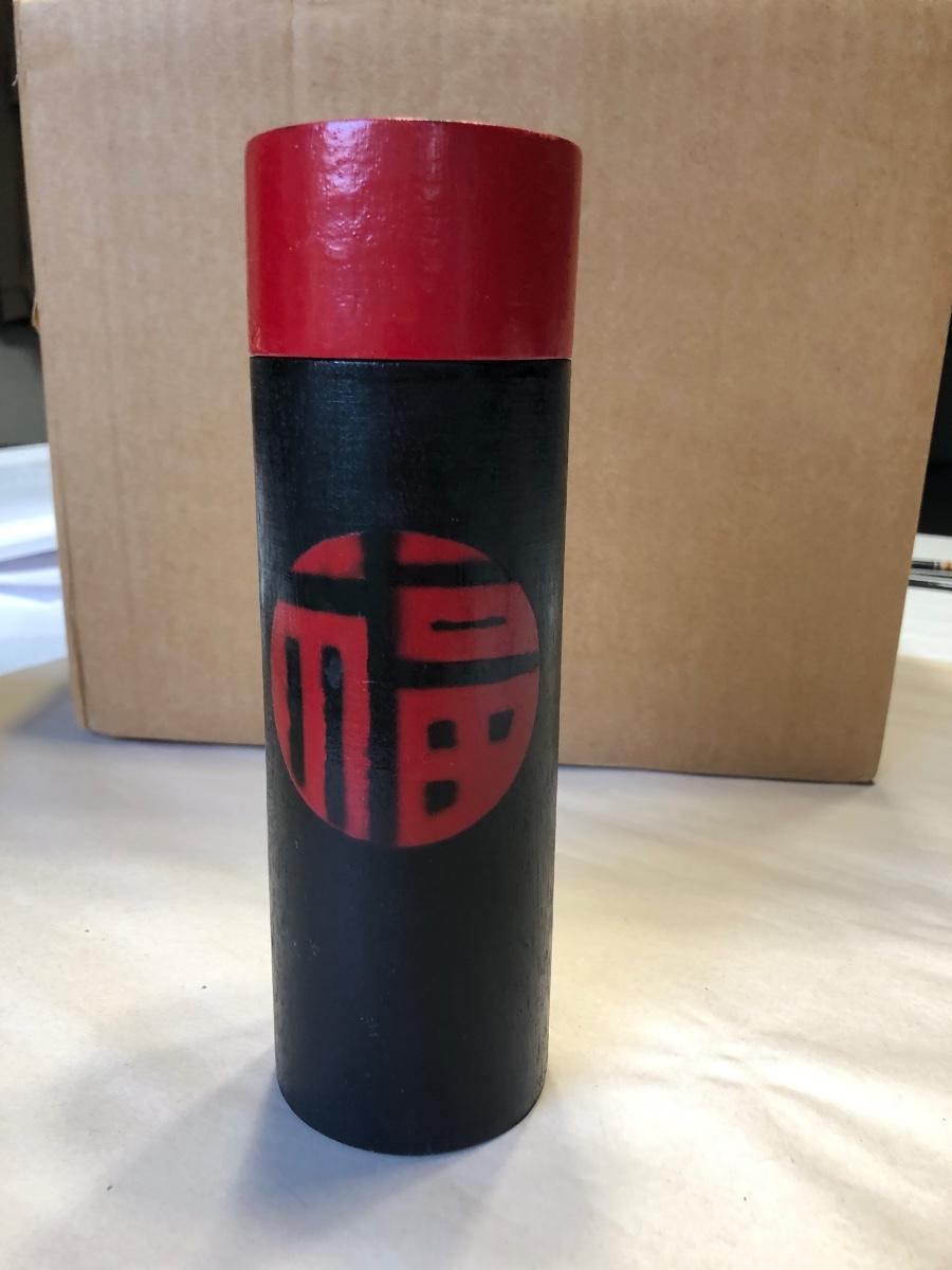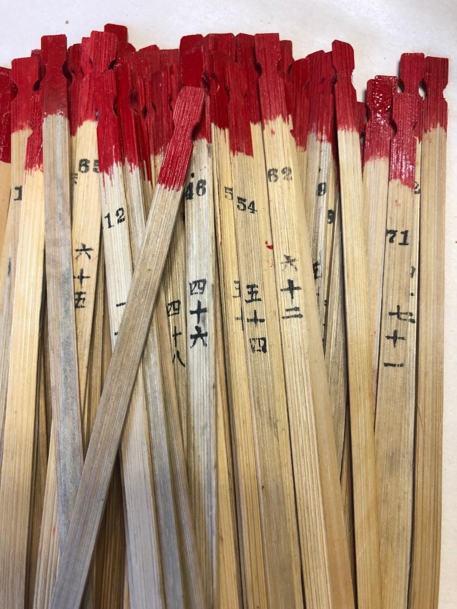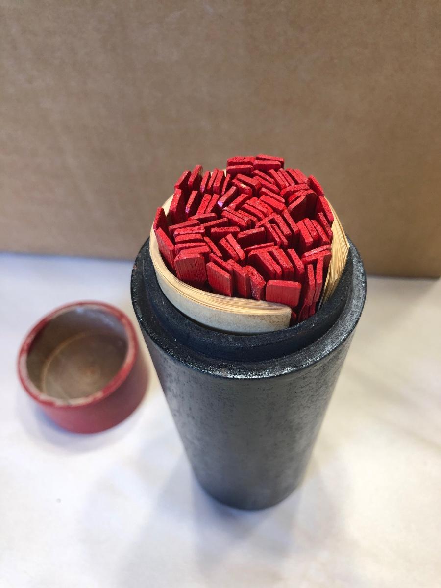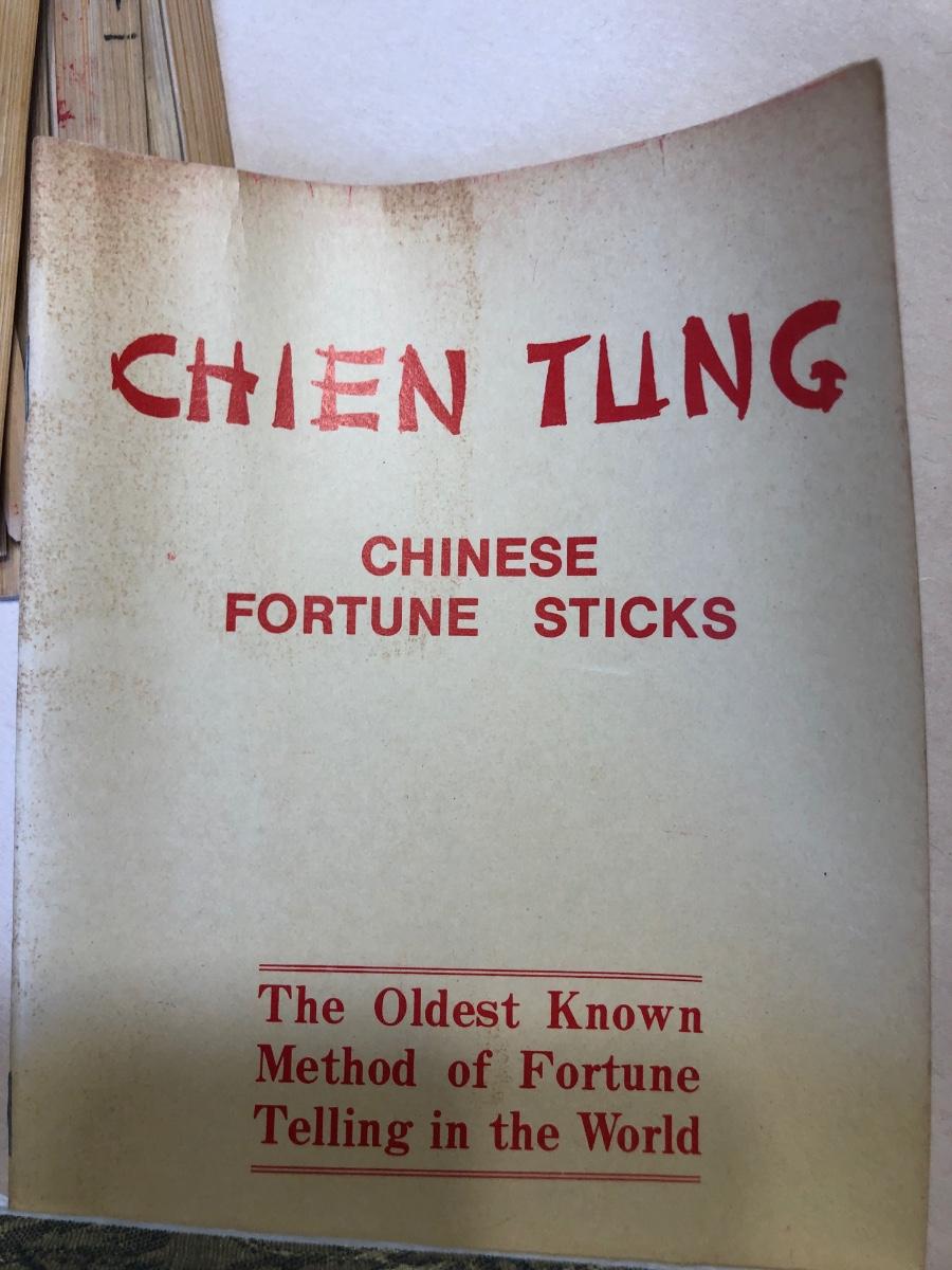 Beautiful light green “A Tour Map of West Lake” folding fan with sleeve in box. “Chien Tung” Chinese fortune sticks in wooden case.