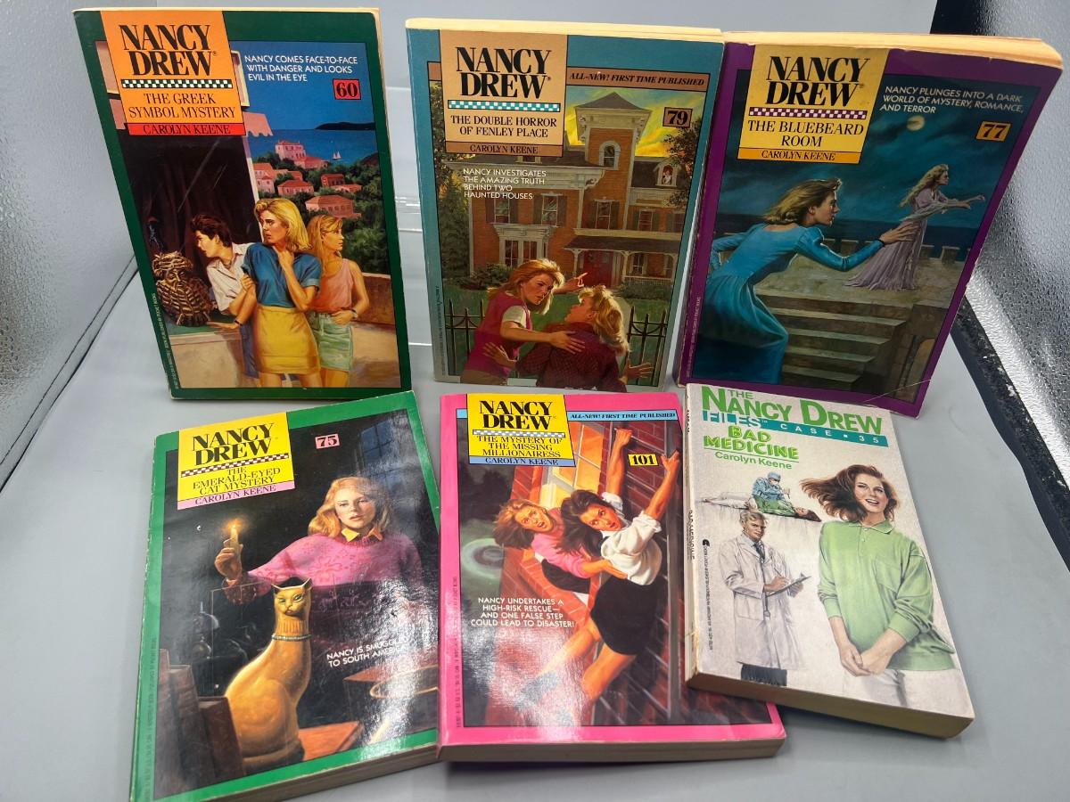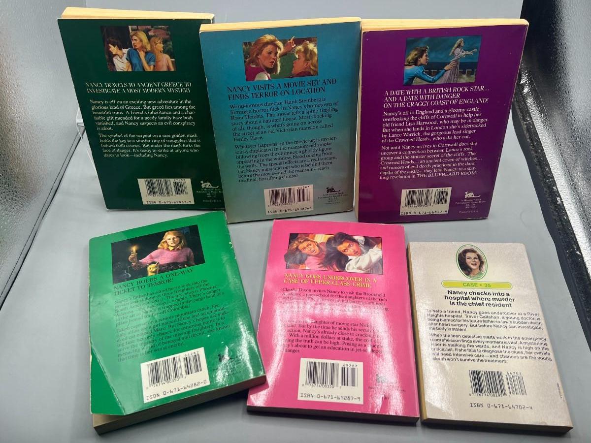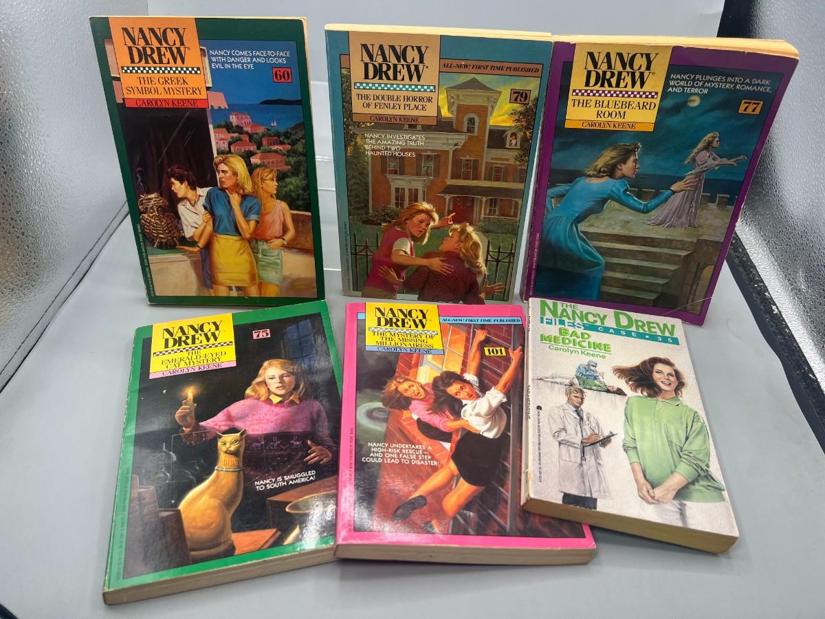 Set of 6 Nancy Drew Mysteries Young Adult Paperback Novel Books. Good previously read condition.