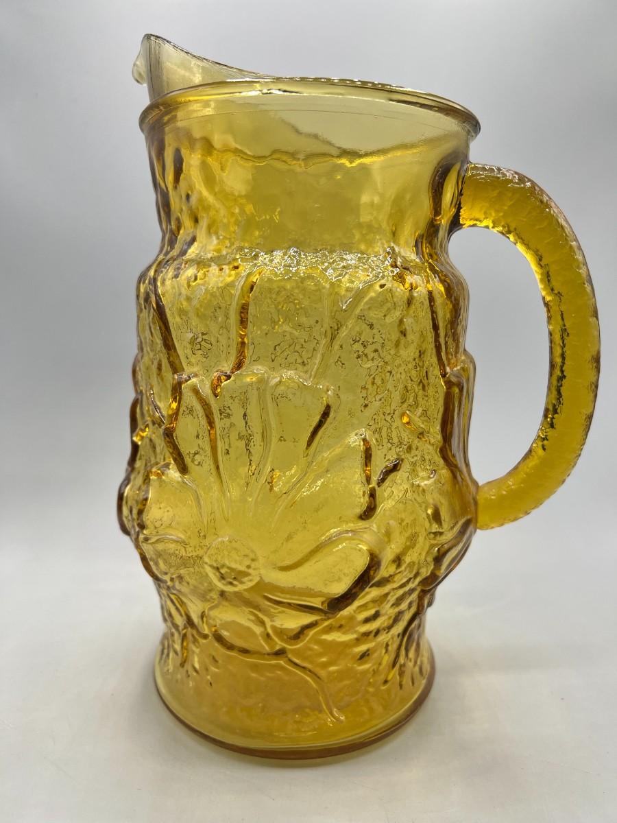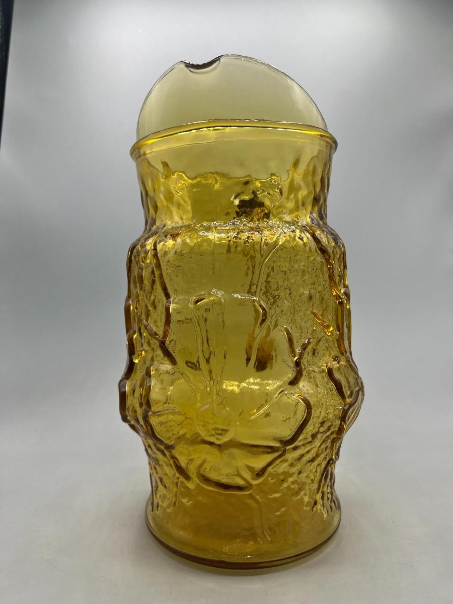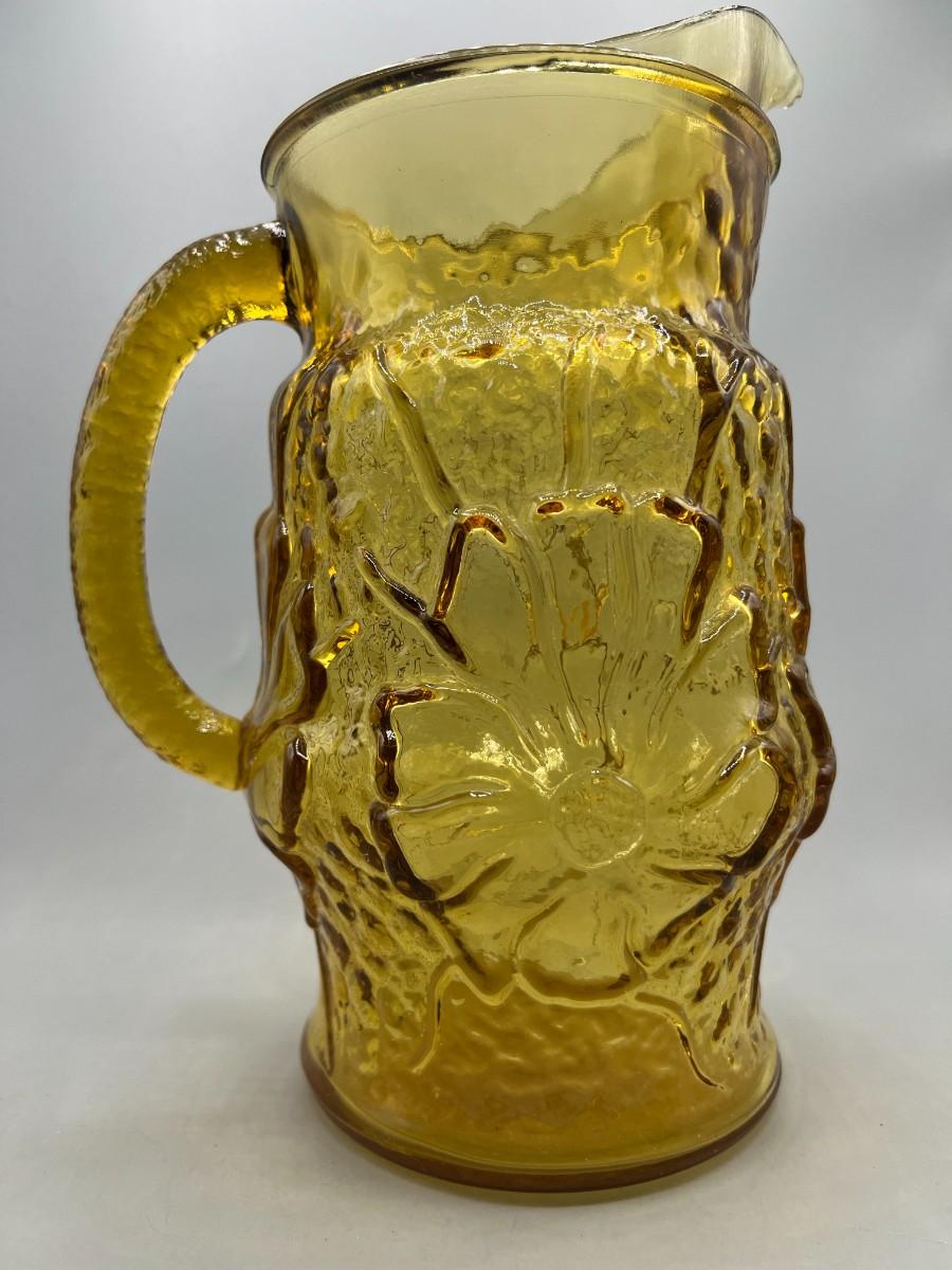 Vintage Retro Anchor Hocking Rainflower Gold Yellow Flower Embossed Glass Water Iced Tea Pitcher. In good condition.