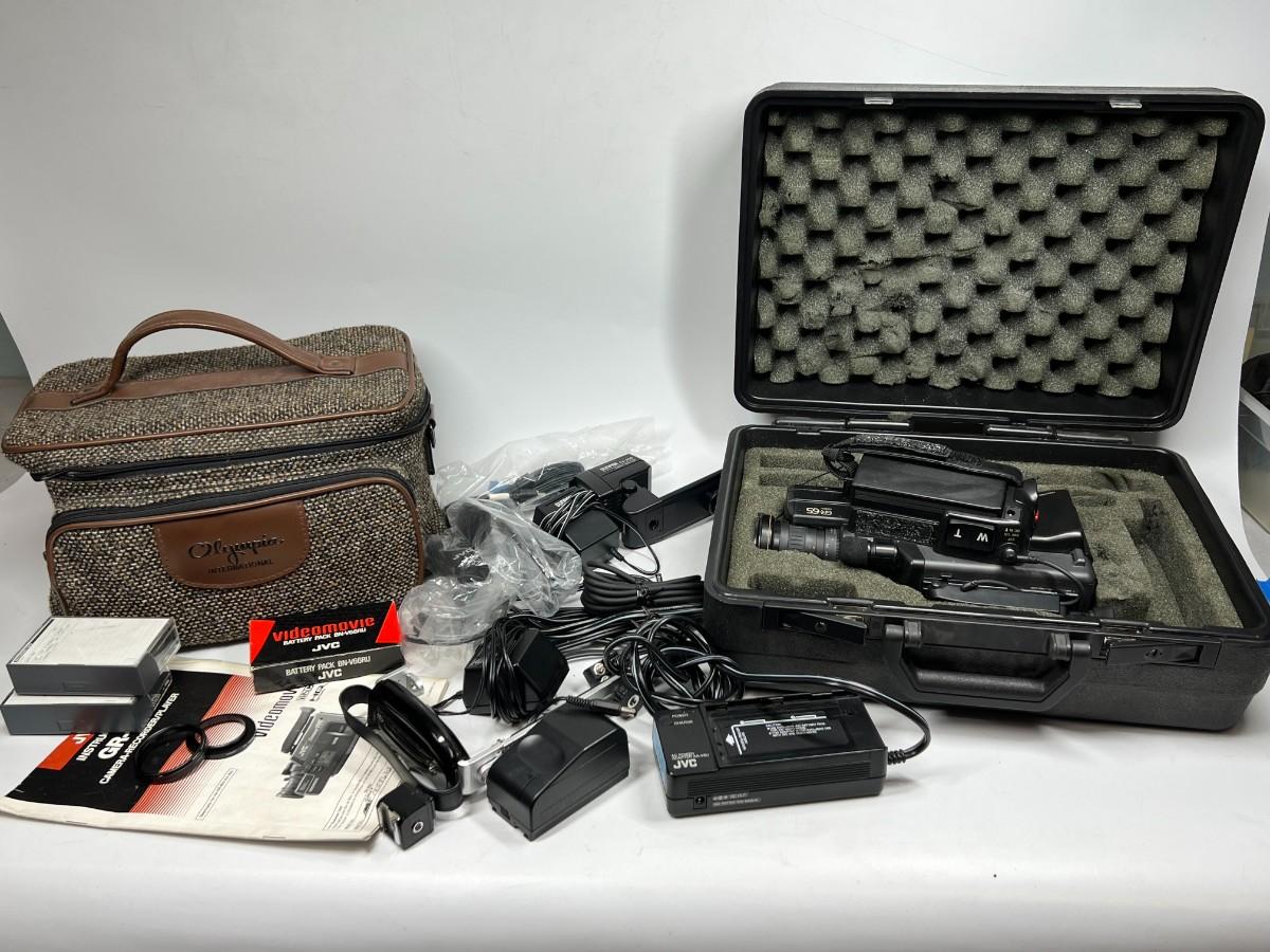 Retro JVC Videomovie Compact VHS Camcorder Camera with Accessories. Comes with everything shown. Untested.