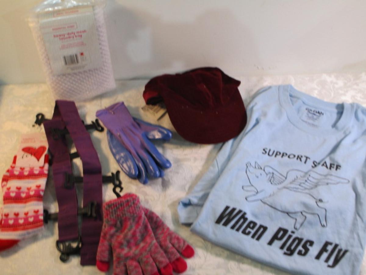Laundry bag, flip-flop hanger, garden gloves, winter gloves, velveteen ball cap, new men's t-shirt size XL, socks