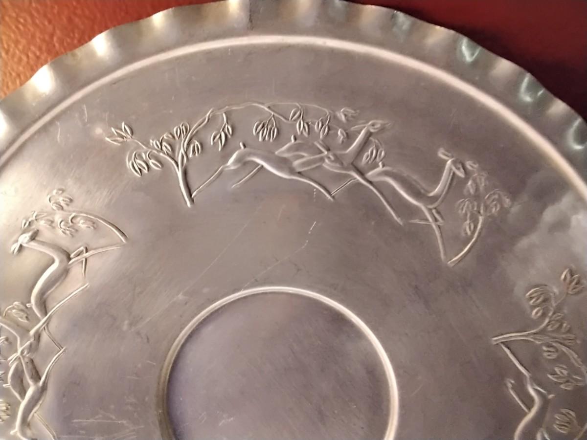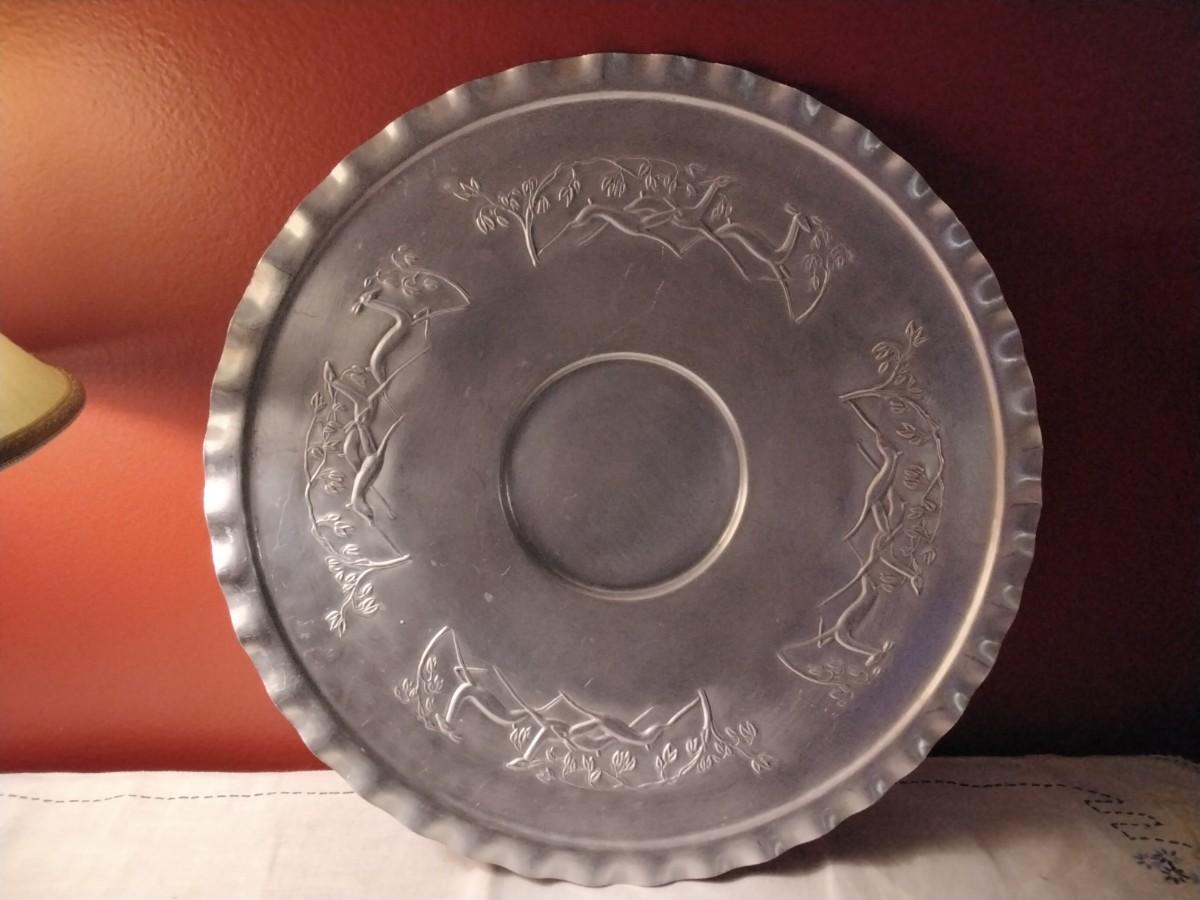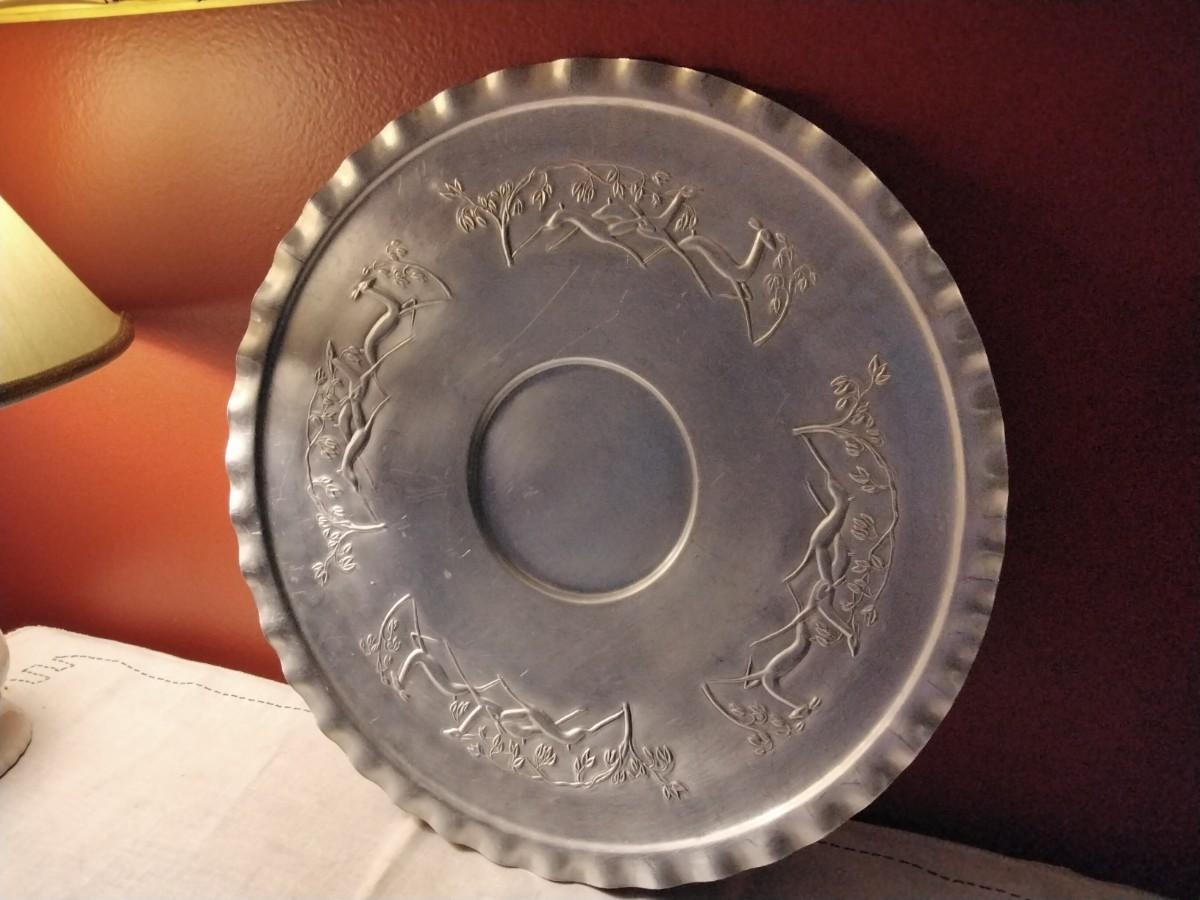 Everlast hand-forged large 18” round aluminum tray with ruffled edge and decorated with leaping gazelle. In 1932 Everlast Metal Products Corporation of New York began producing high-quality, hand-forged aluminum giftware and closed in 1961.