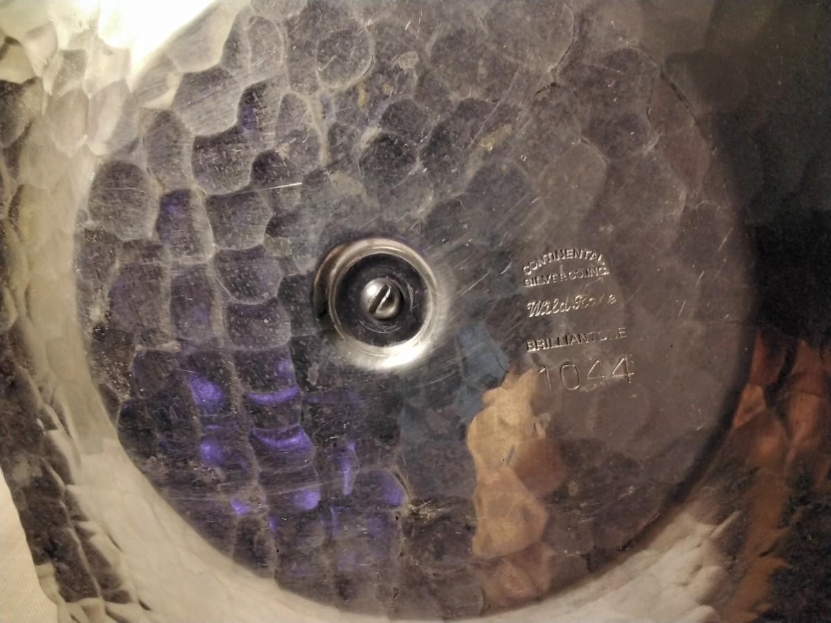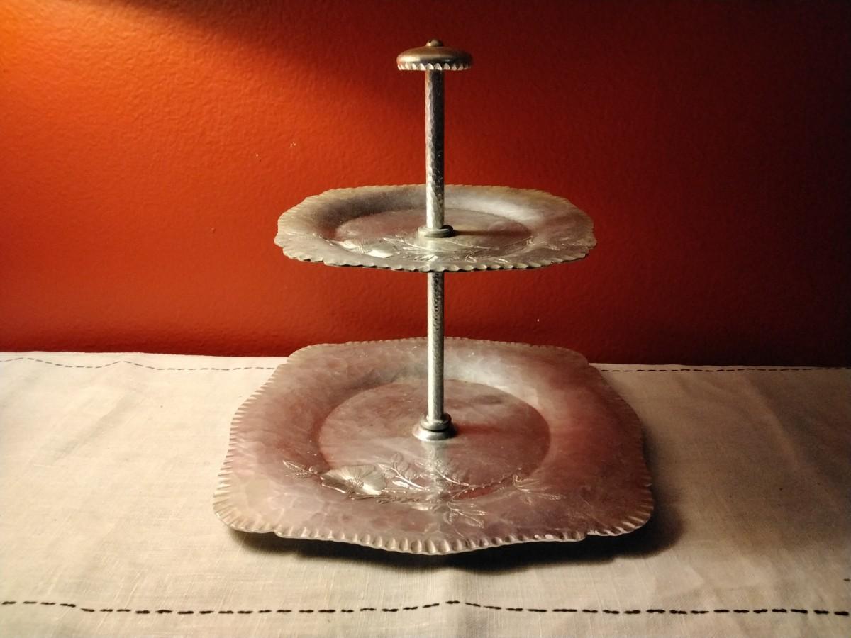 Measures 9" tall × 9" bottom tray × 6". This is a vintage Continental Silver Corp Wild Rose pattern Brilliantone hammered aluminum two tiered tidbit or snack serving tray. It is in excellent condition.