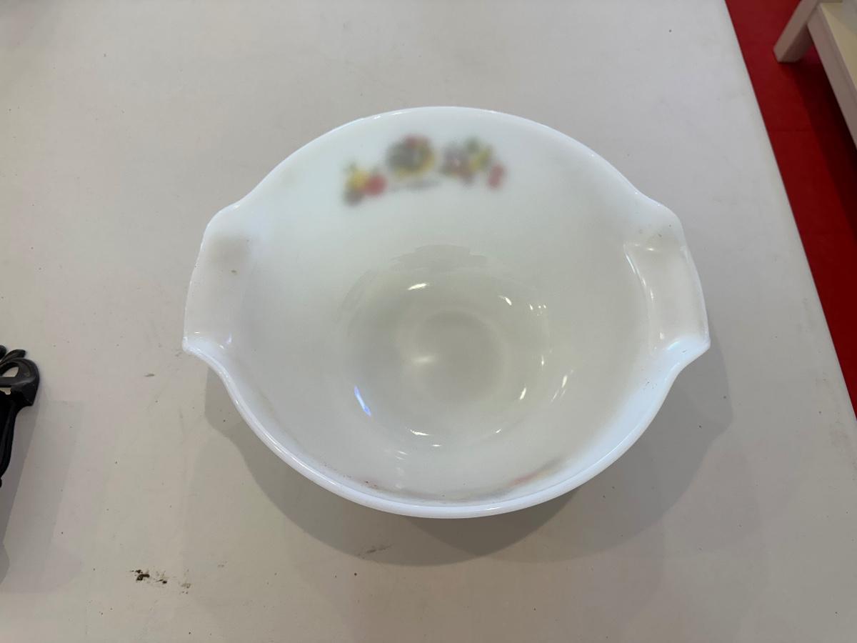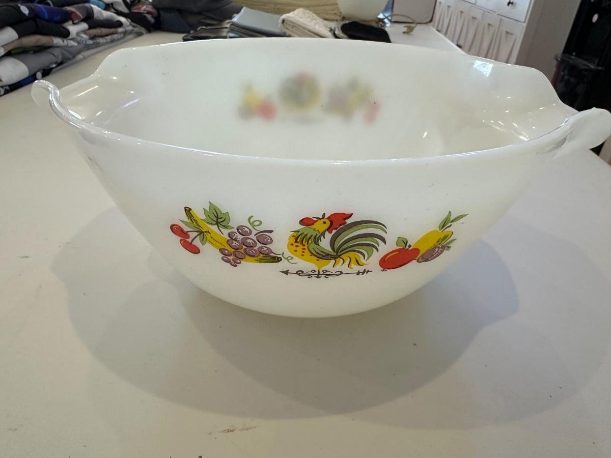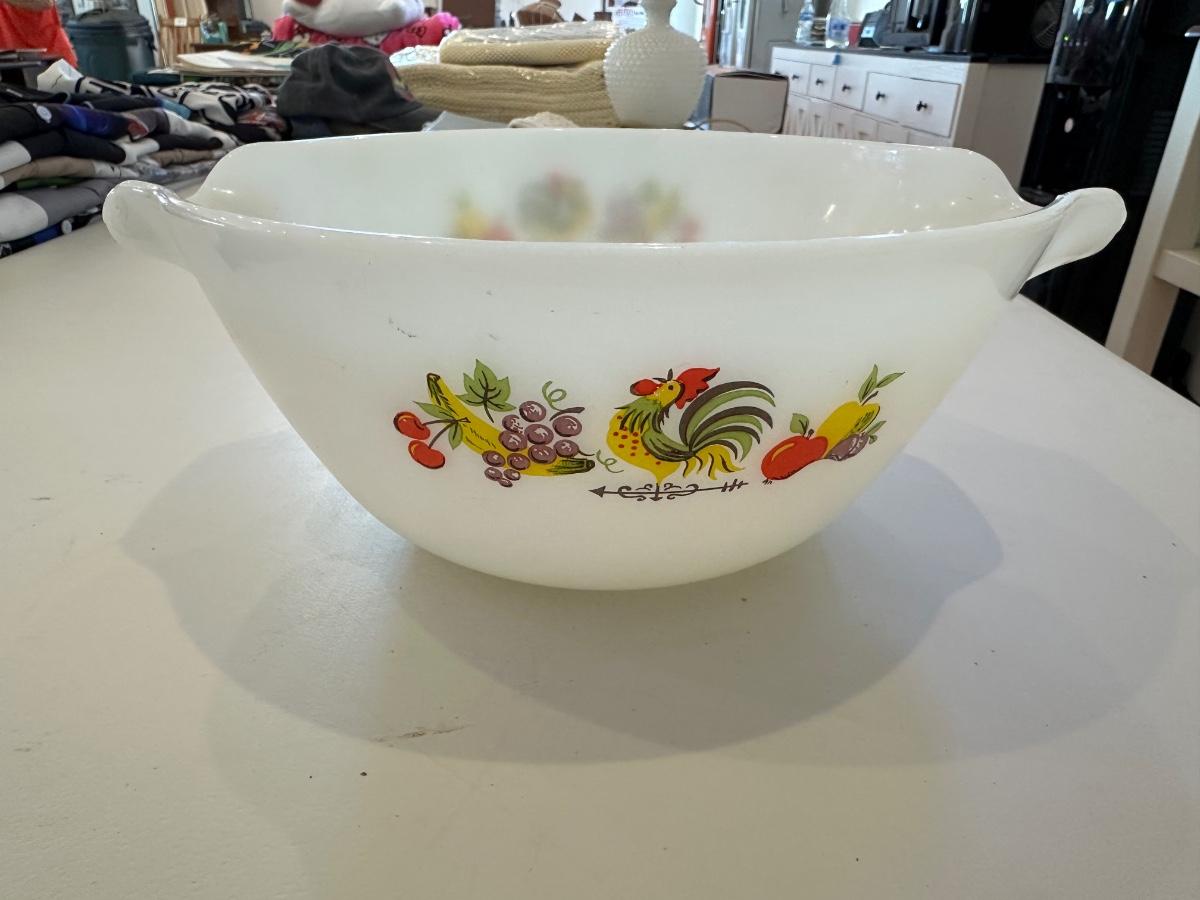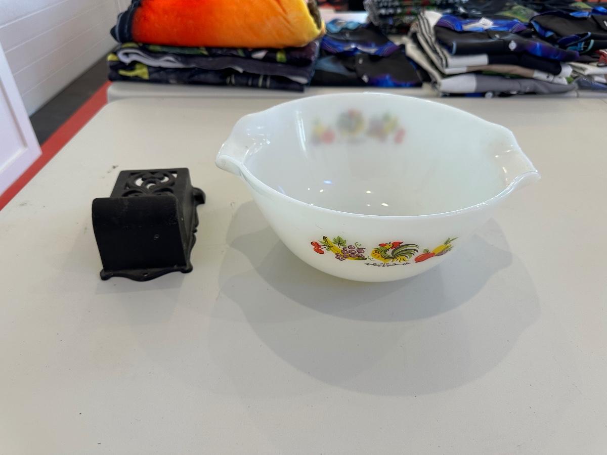 ANCHOR HOCKING SERVING BOWL AND CAST IRON MATCH HOLDER