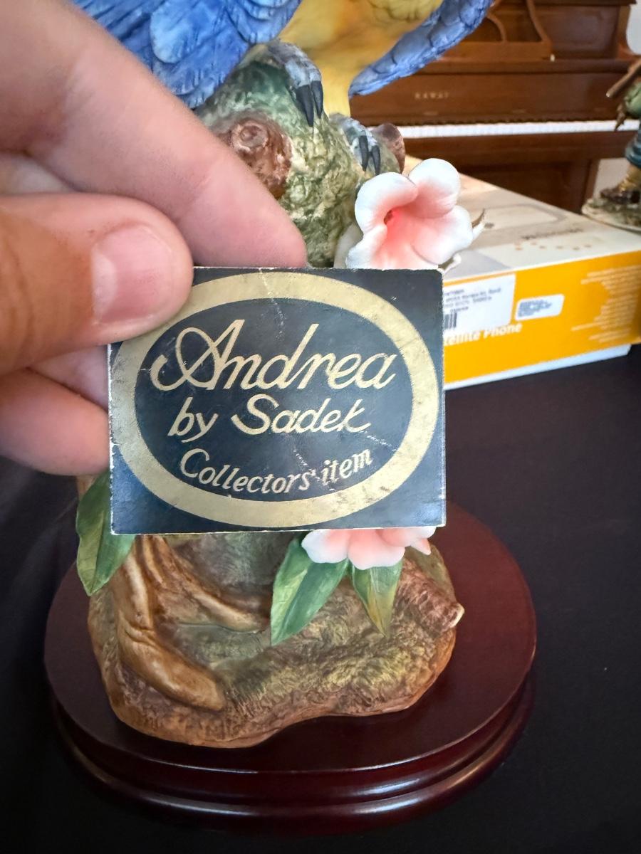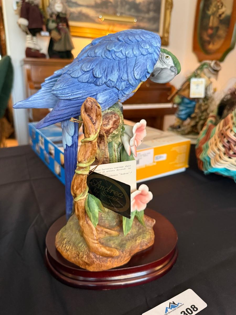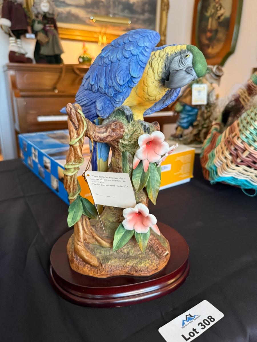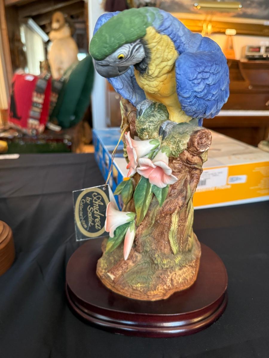 Andrea by Sadek porcelain Gold & Blue Macaw statue w/tag