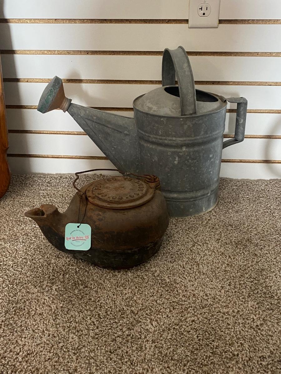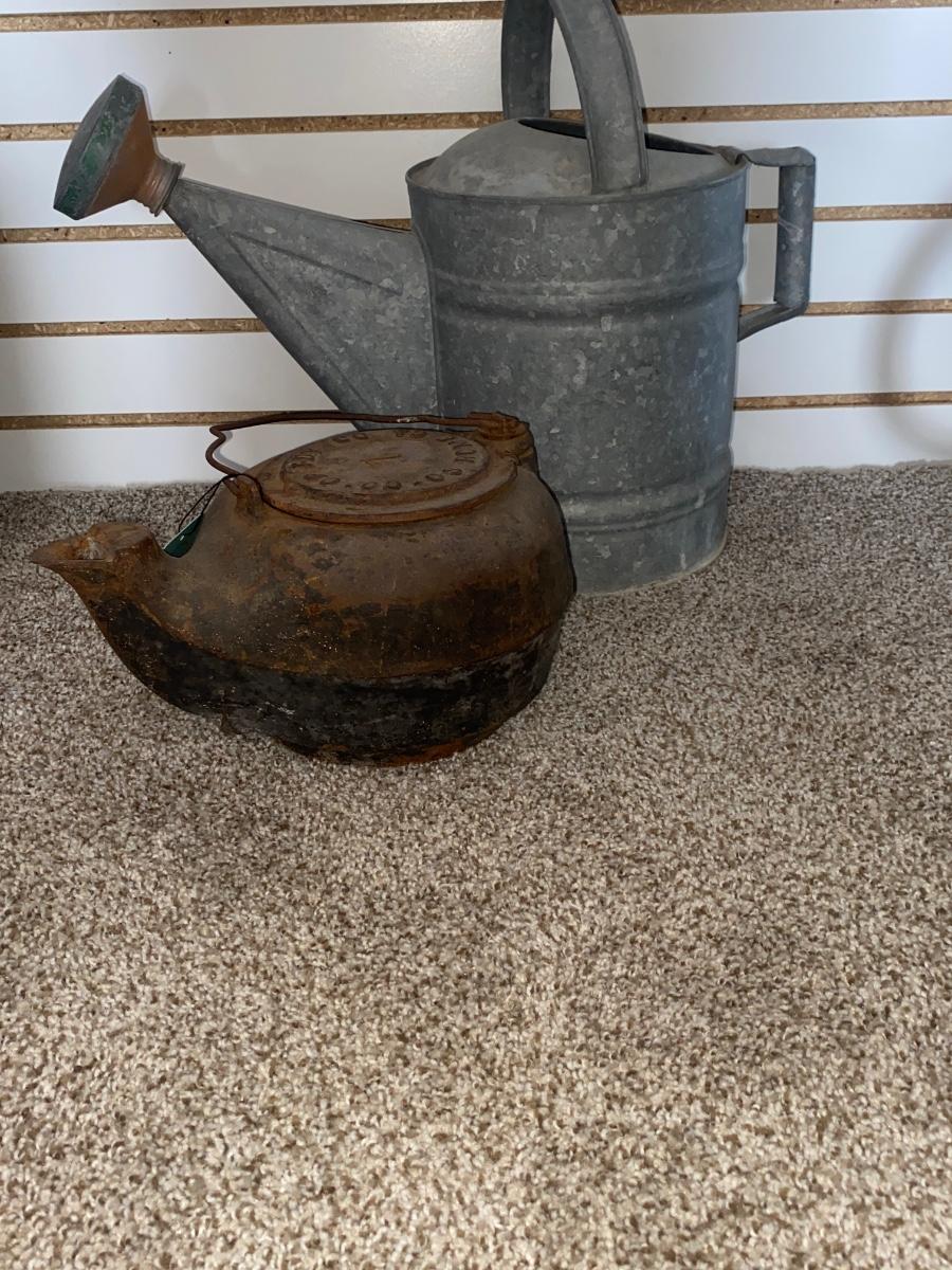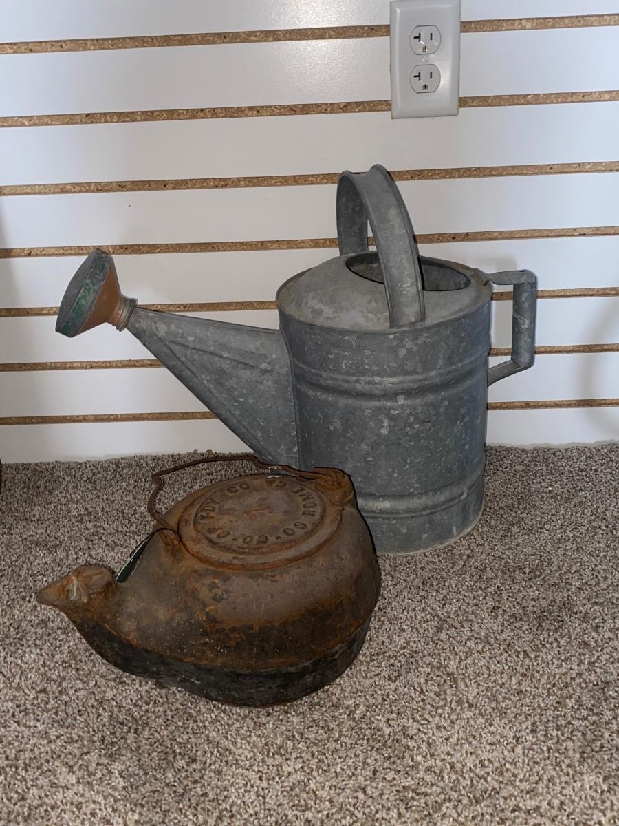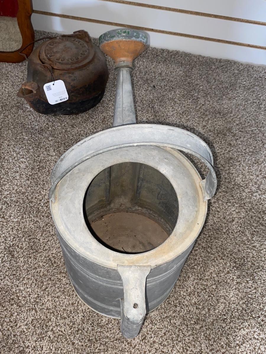 ANTIQUE CAST IRON KETTLE AND VINTAGE GALVANIZED WATERING PAIL