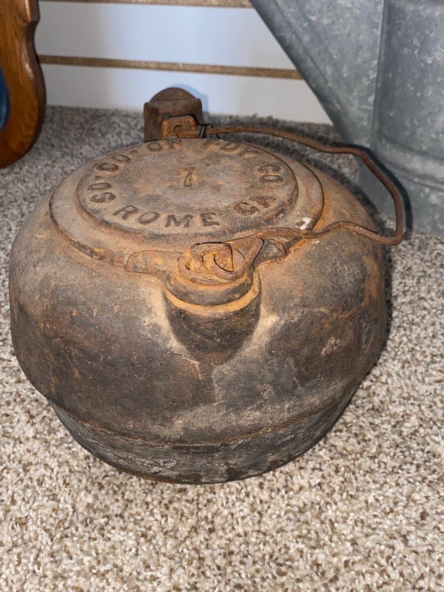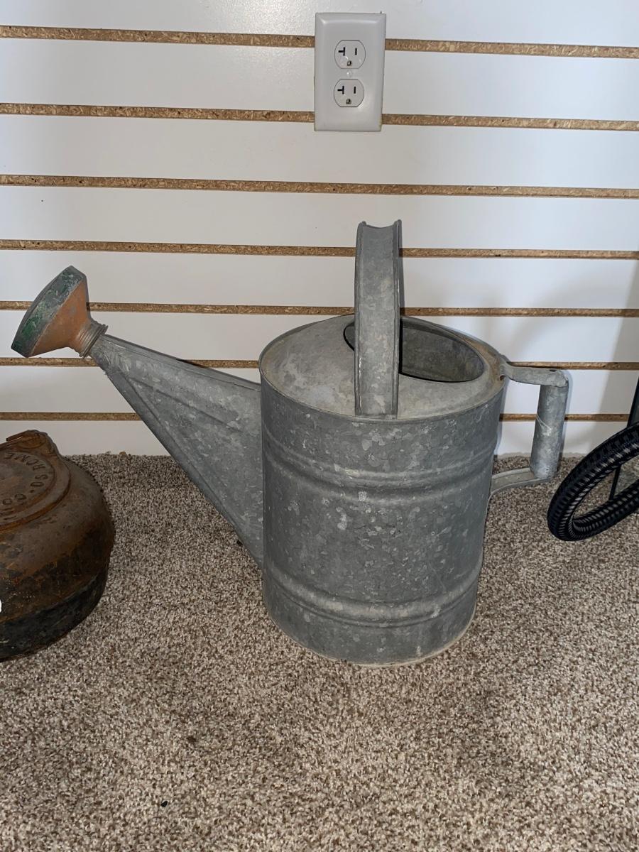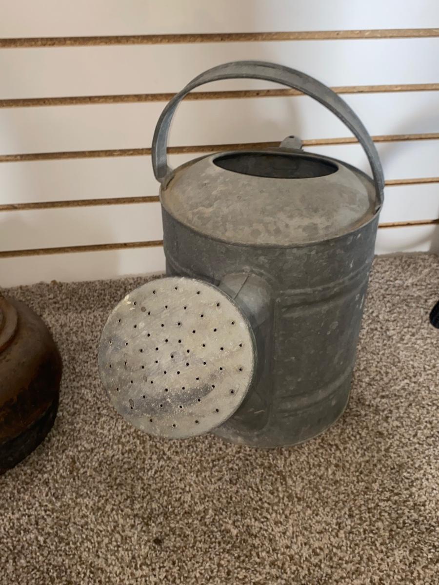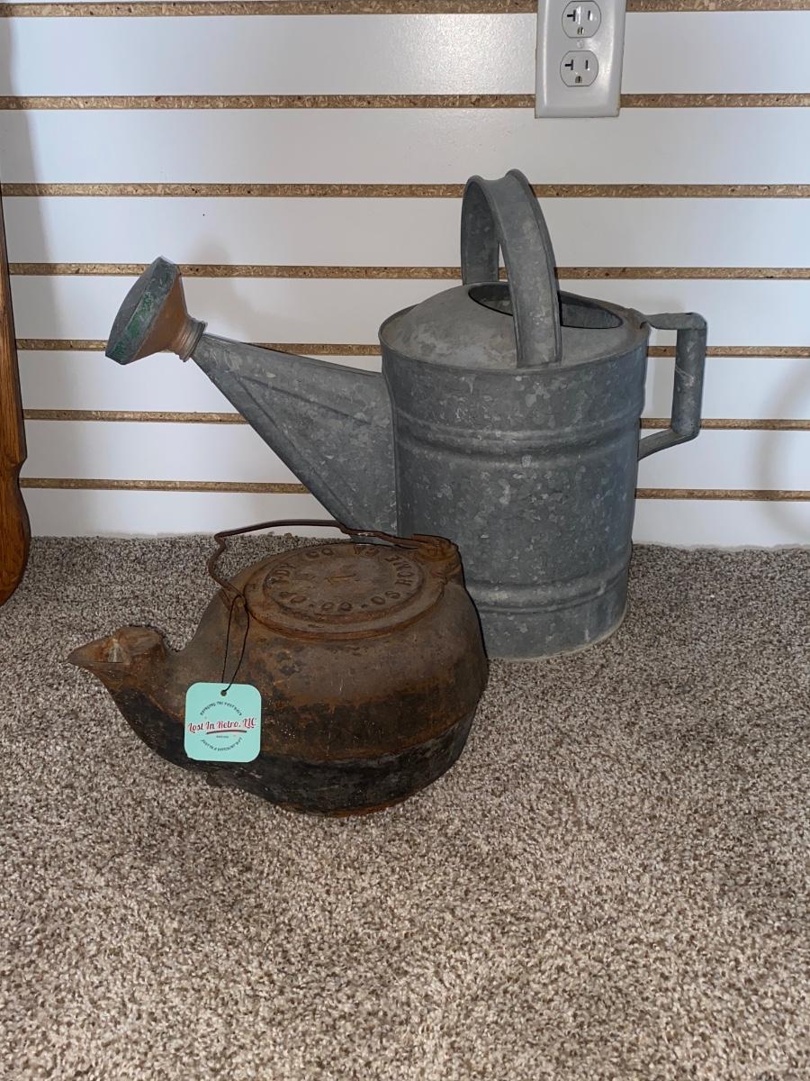 ANTIQUE CAST IRON KETTLE AND VINTAGE GALVANIZED WATERING PAIL