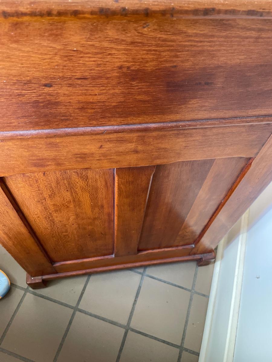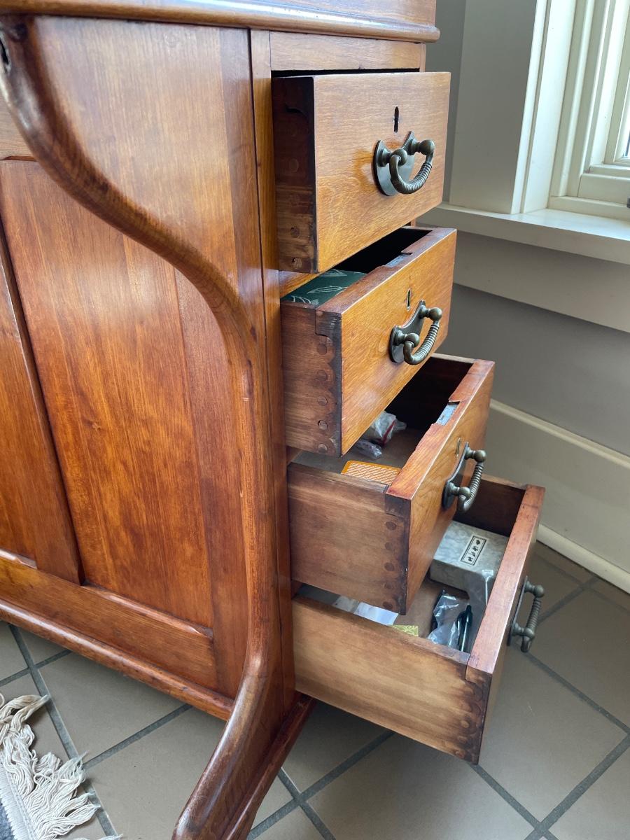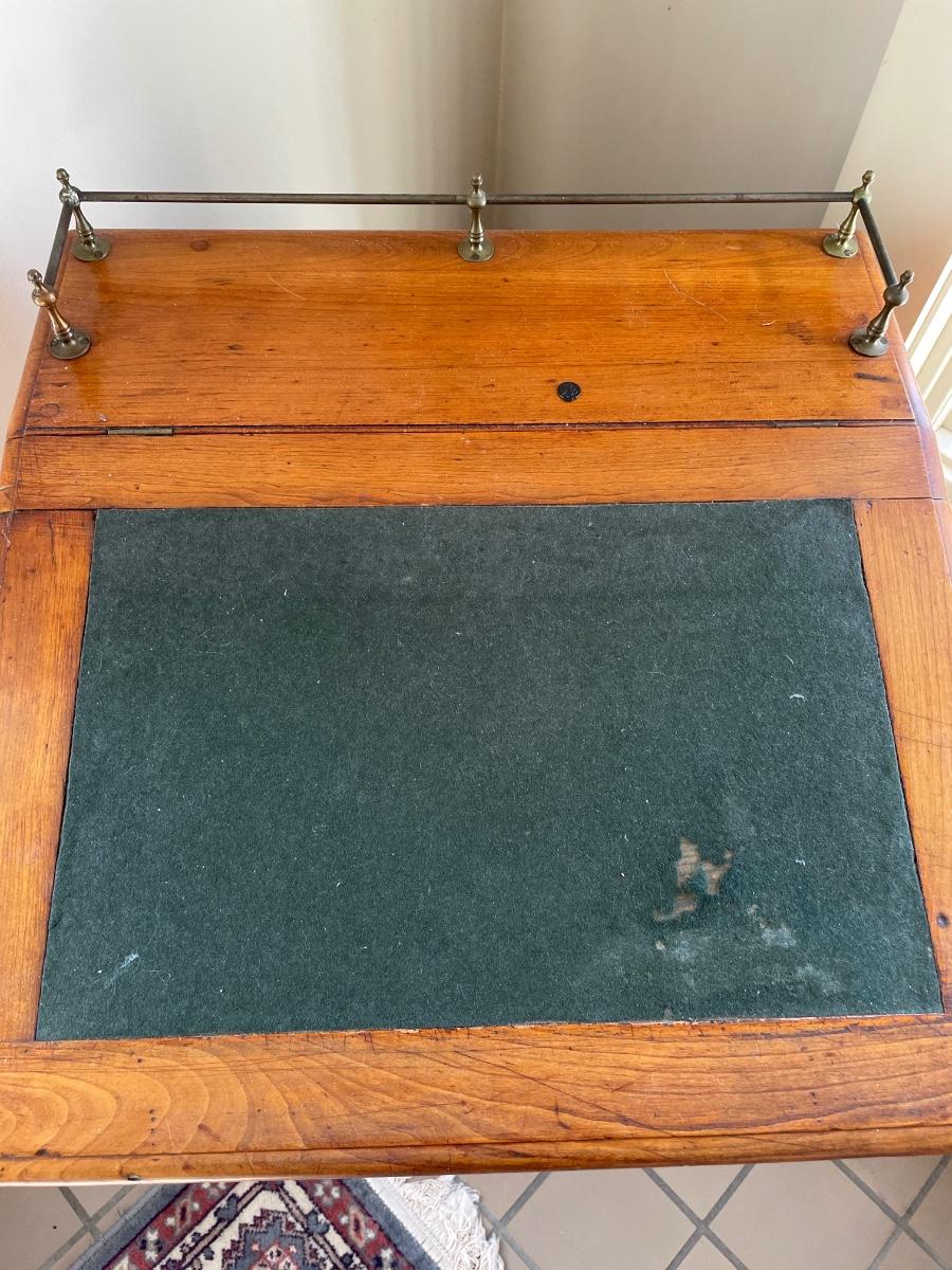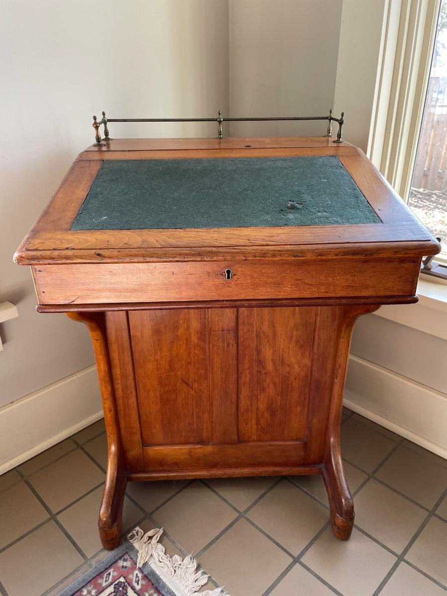 Beautiful! Has slanted top that lifts for additional storage, 4 drawers on side as well. 23”w x 23”d x 32”h