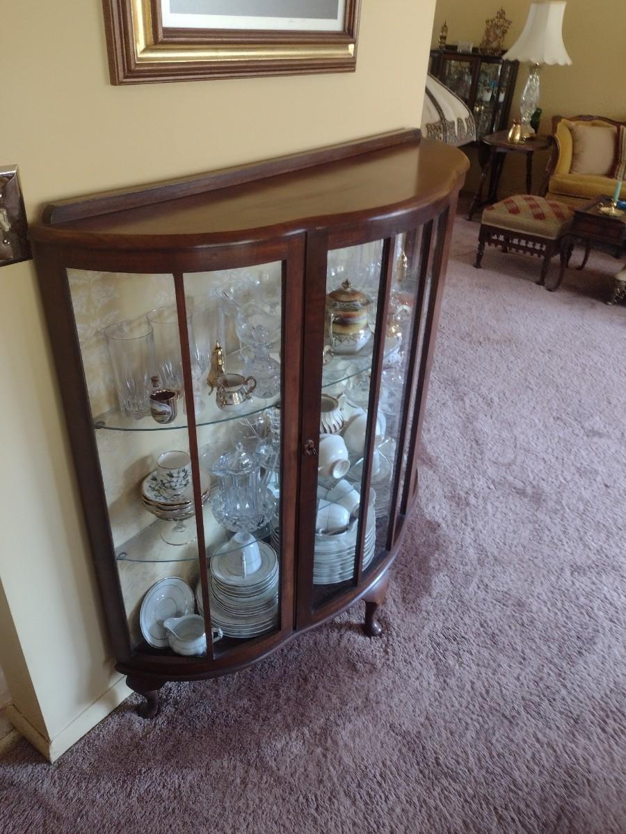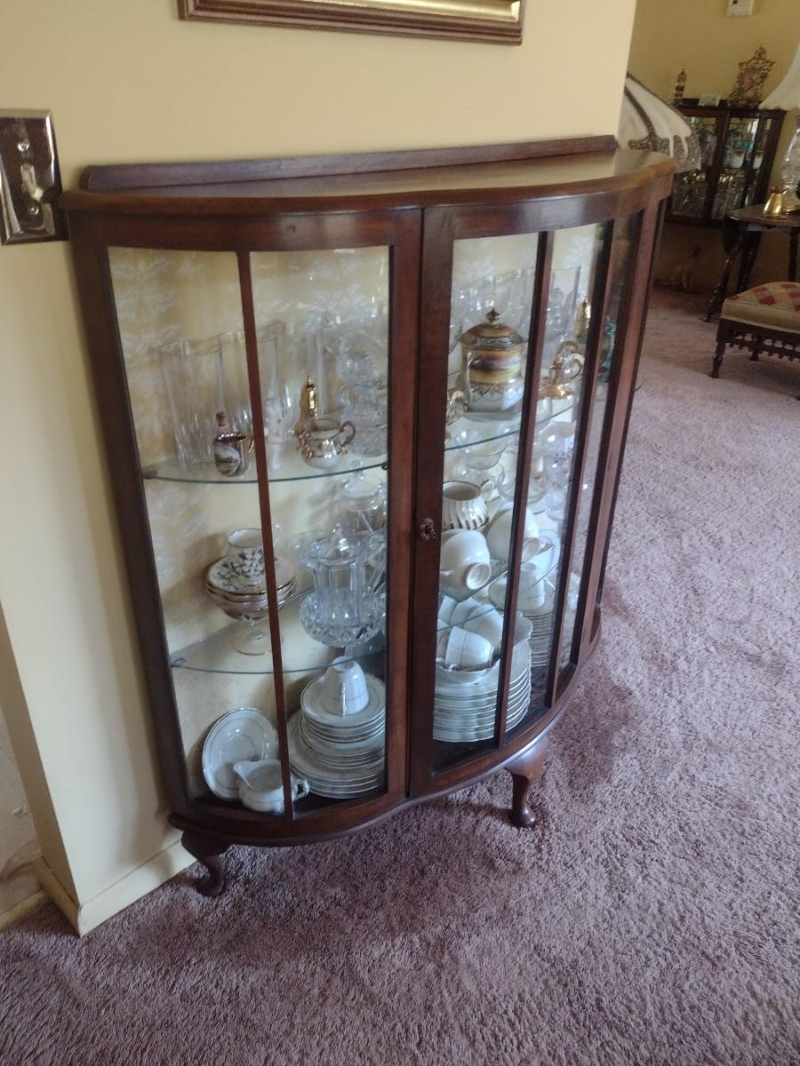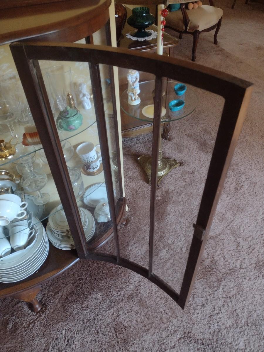 Antique Mahogany Bowfront Curio Display Cabinet with Glass Shelves (No Contents), Right side back glass cracked