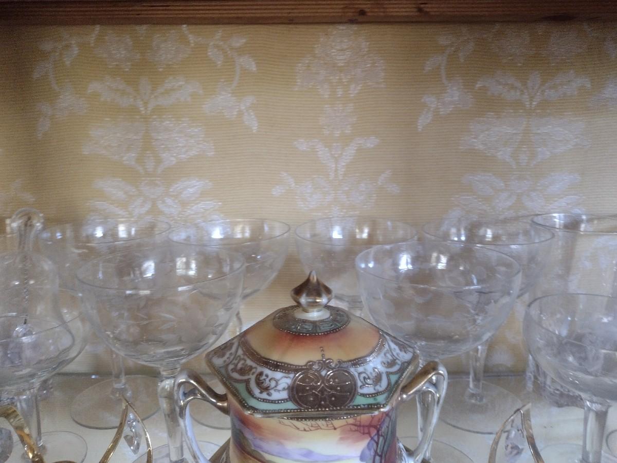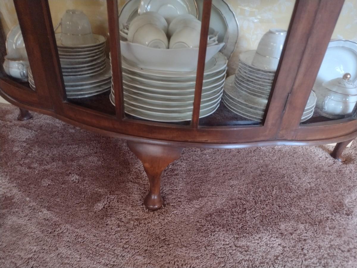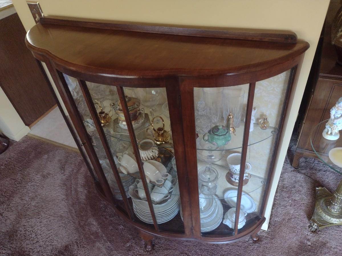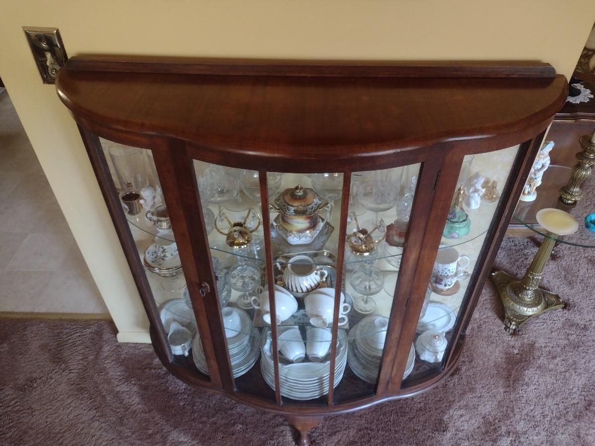Antique Mahogany Bowfront Curio Display Cabinet with Glass Shelves (No Contents), Right side back glass cracked