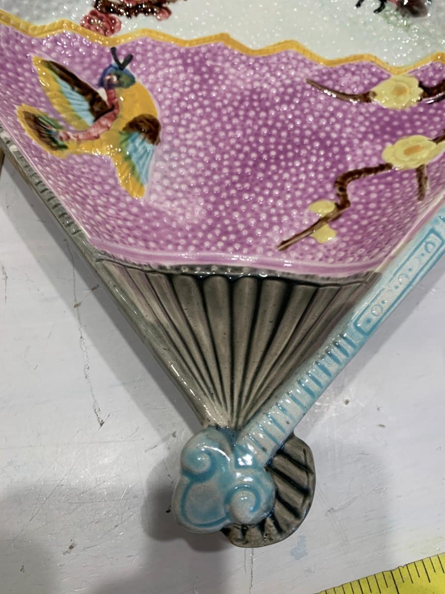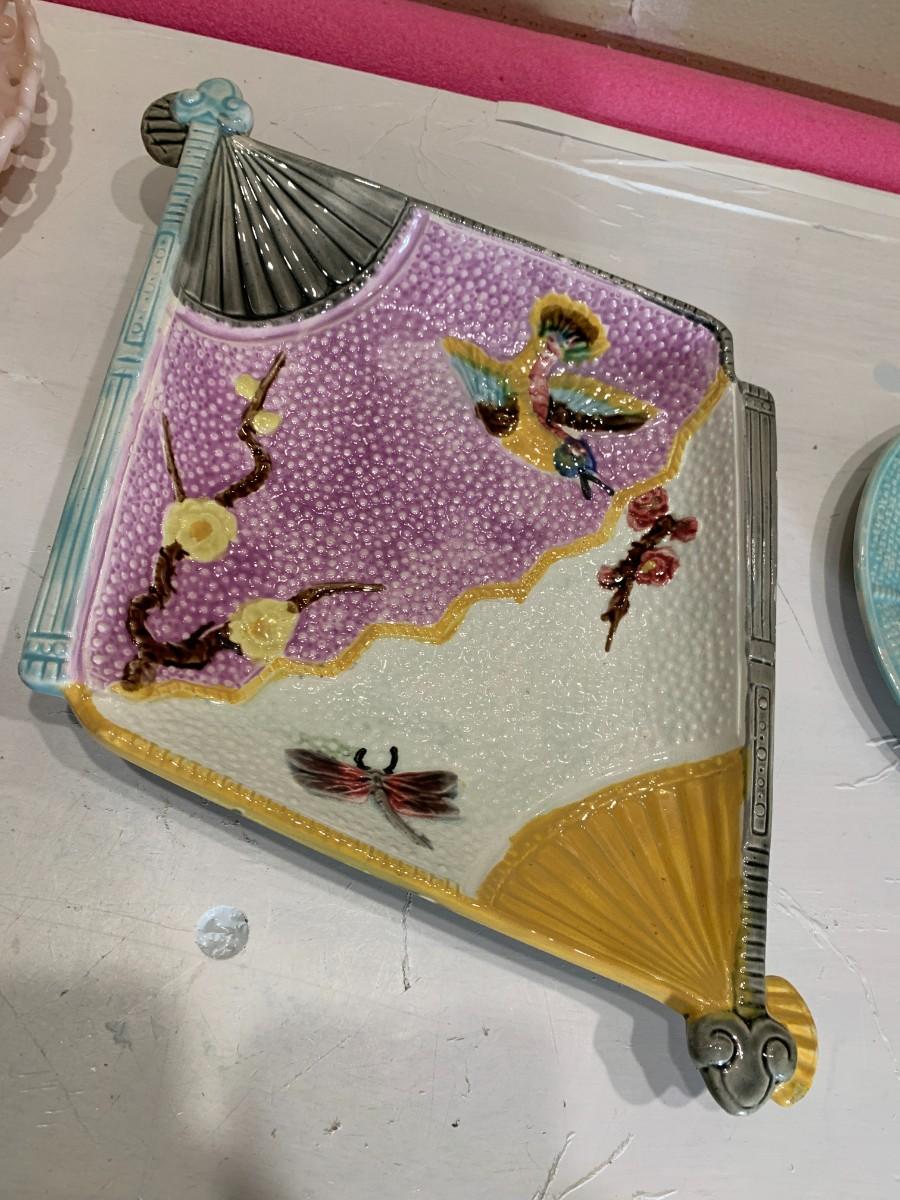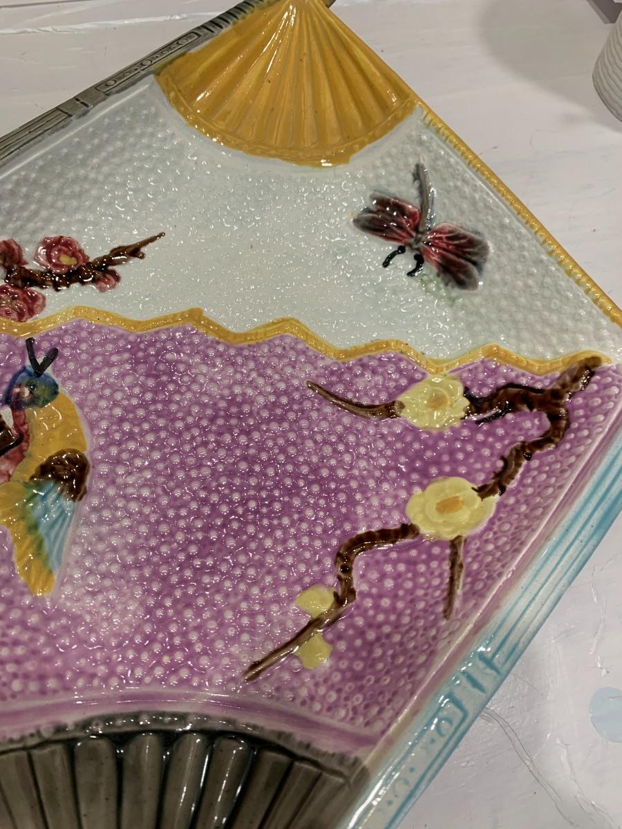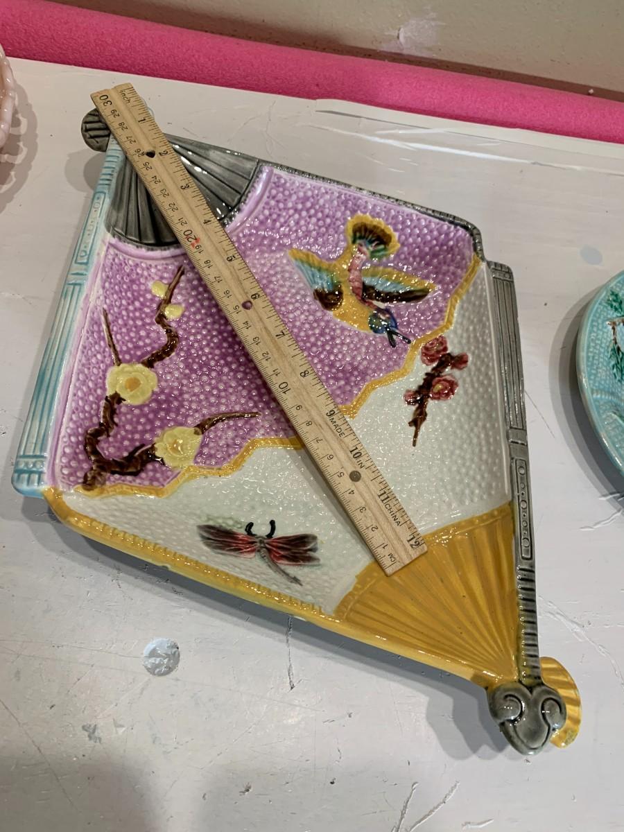 Antique Majolica 2 Fans Platter with Bird and Dragonfly c. 1800's
