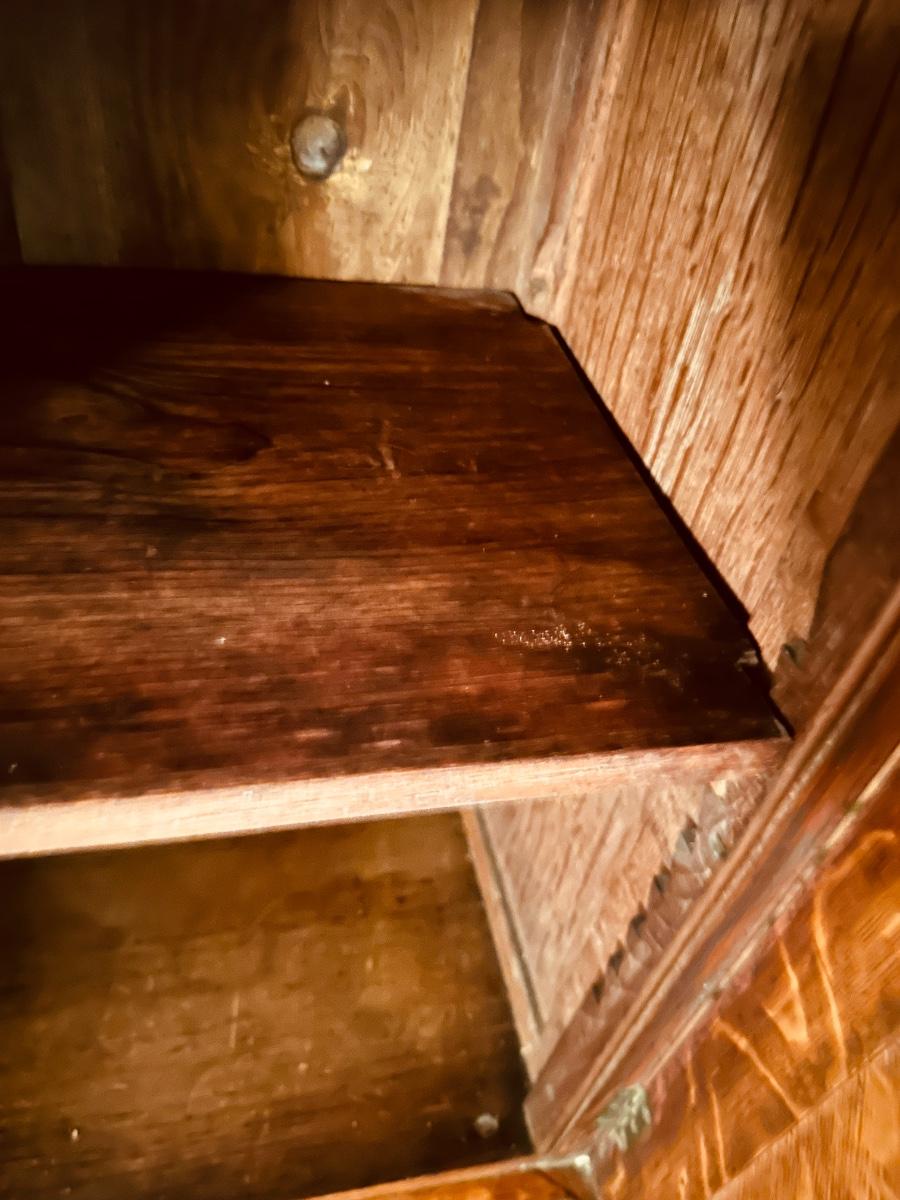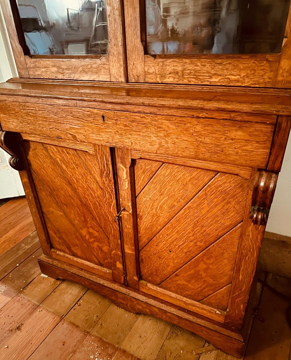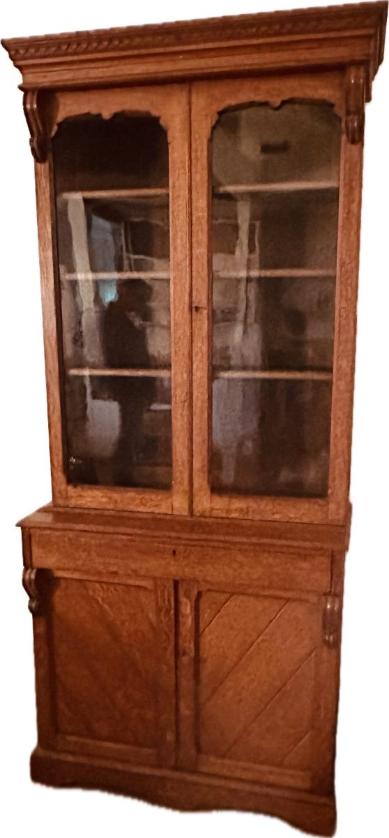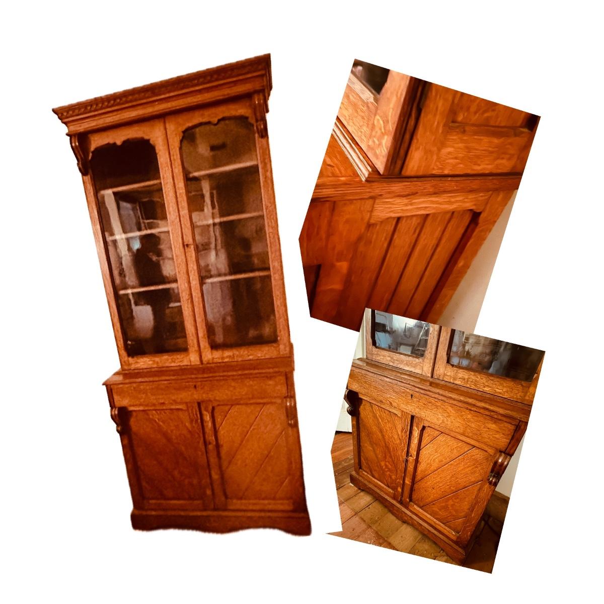 Beautiful piece! Two glass doors with adjustable shelves.Top is separate, easy to move