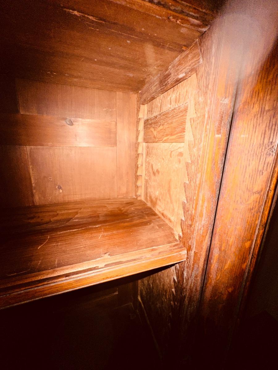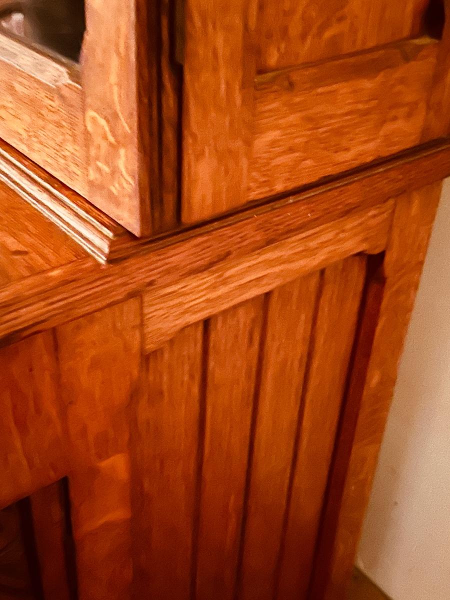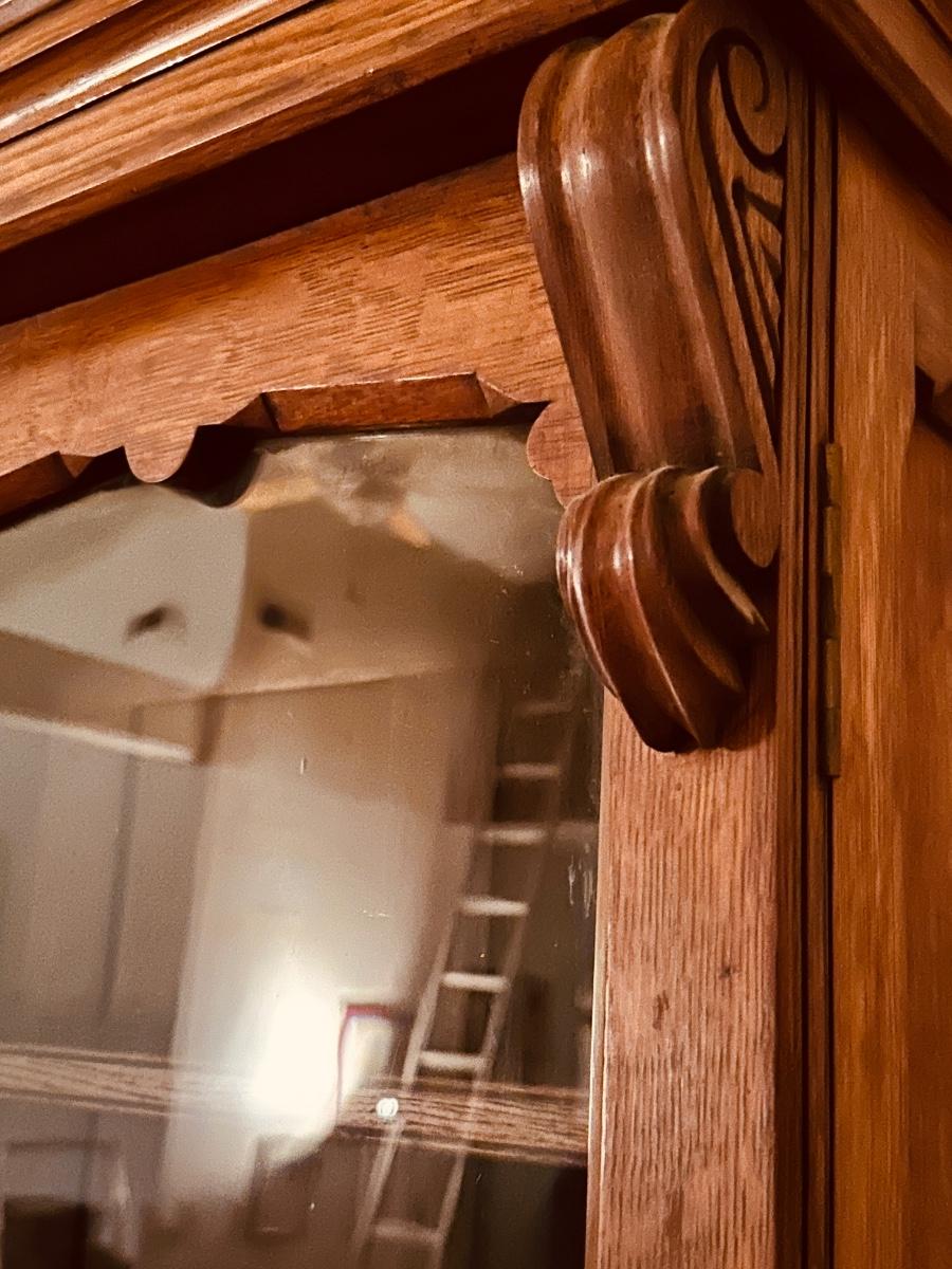 Beautiful piece! Two glass doors with adjustable shelves.Top is separate, easy to move