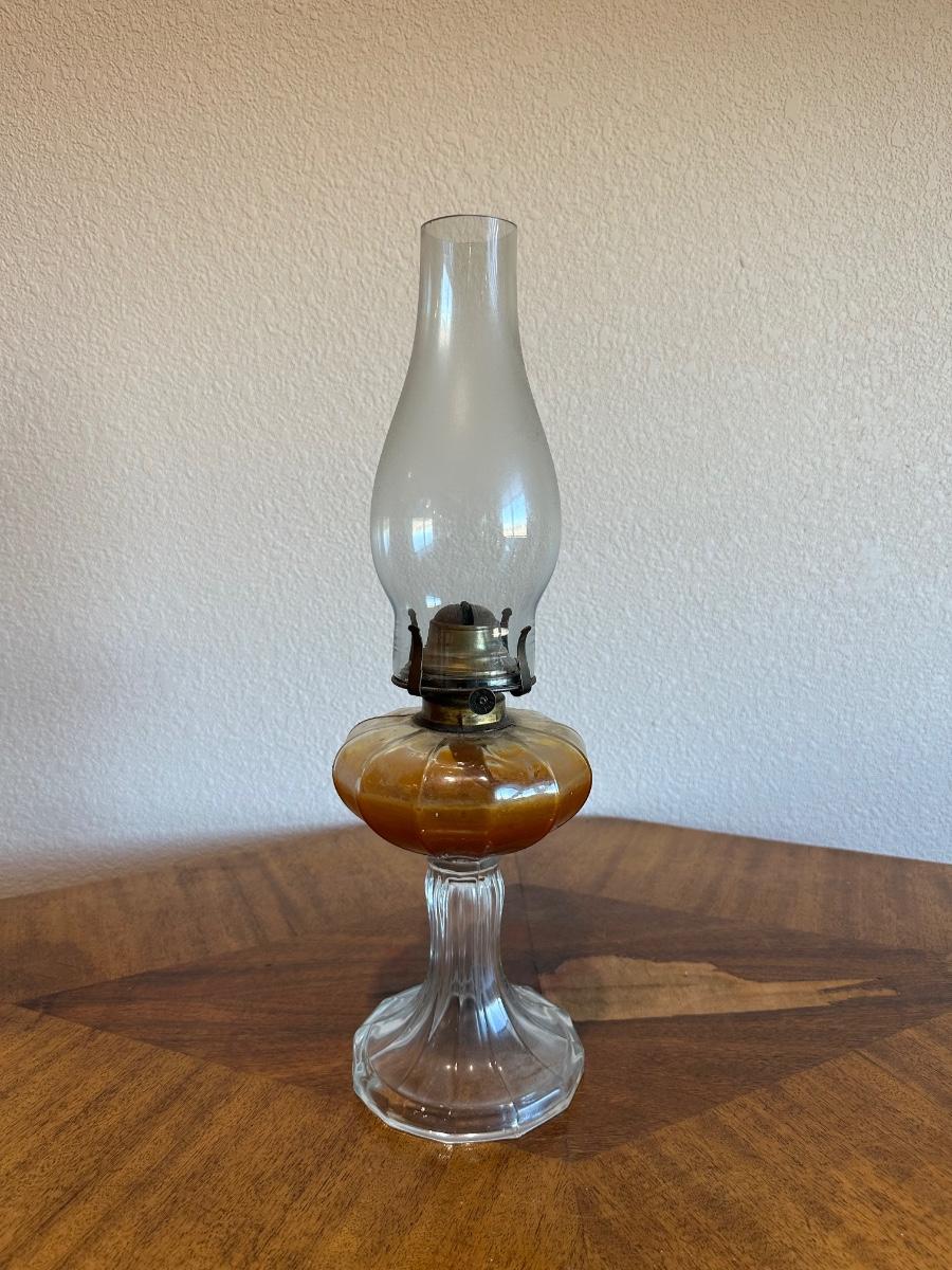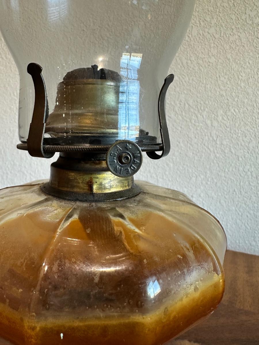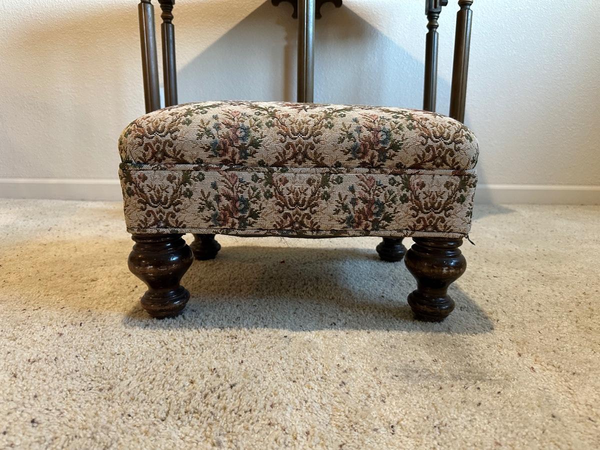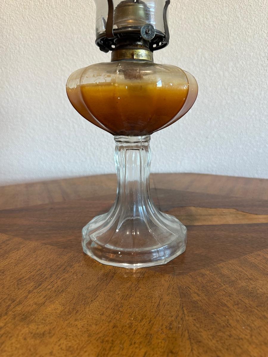 ANTIQUE SIDE TABLE, OIL LAMP AND UPHOLSTERED OTTOMAN