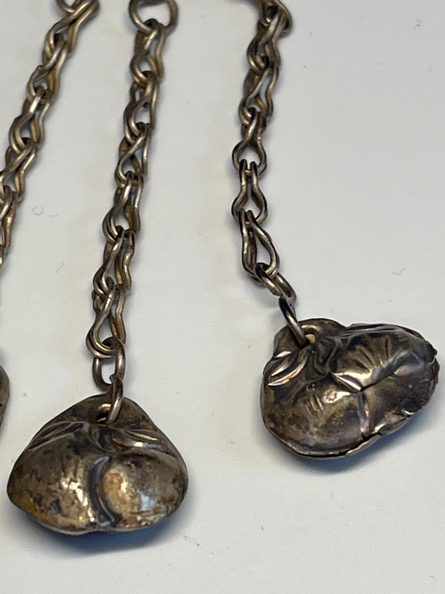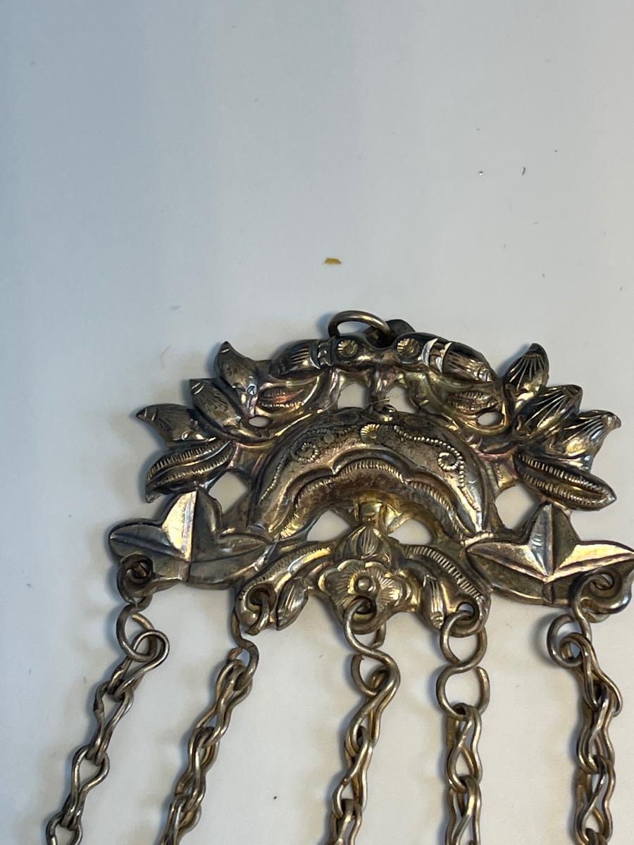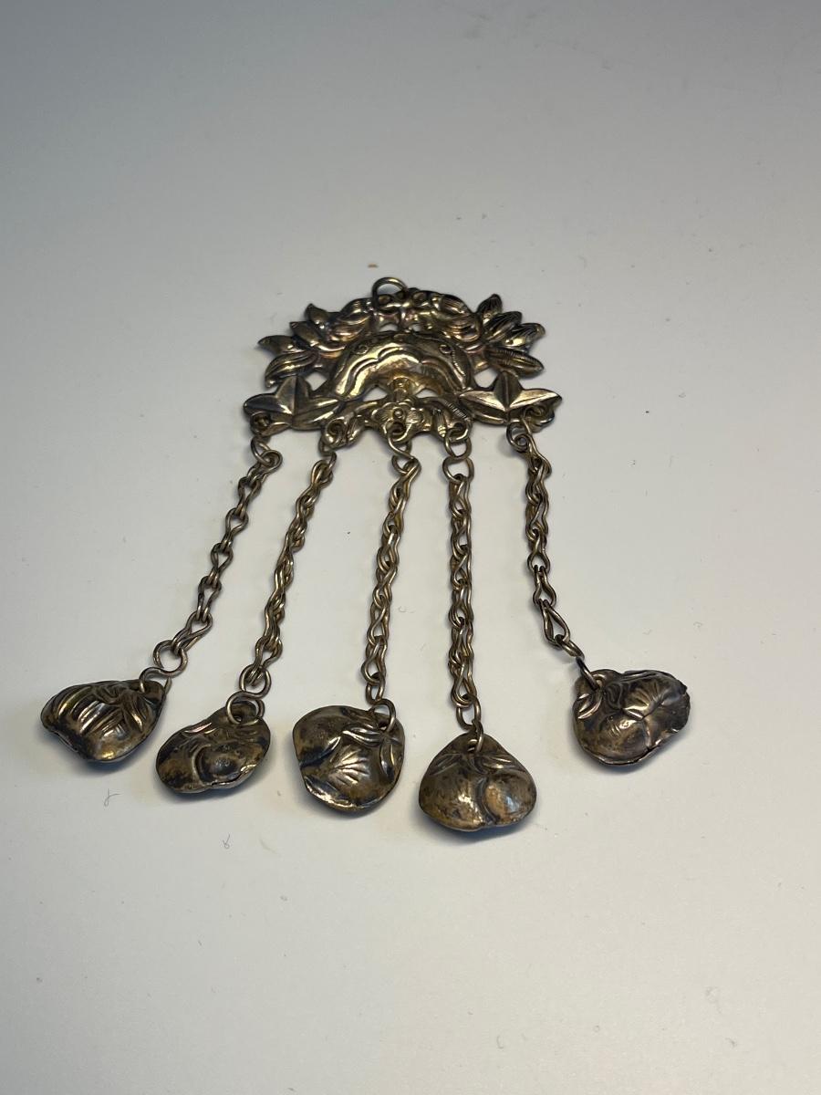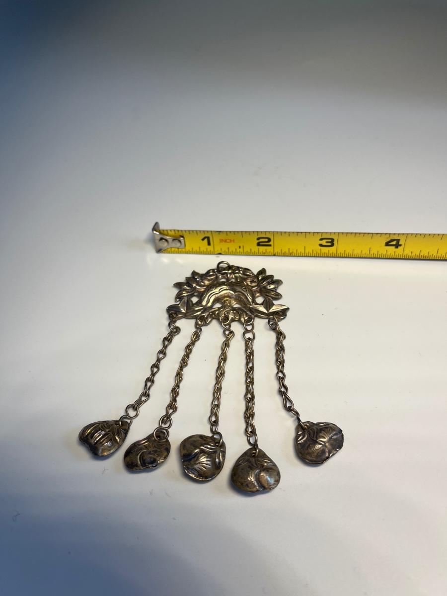 Believed to be silver but no markings found. Bells hanging jingle. Cool piece!