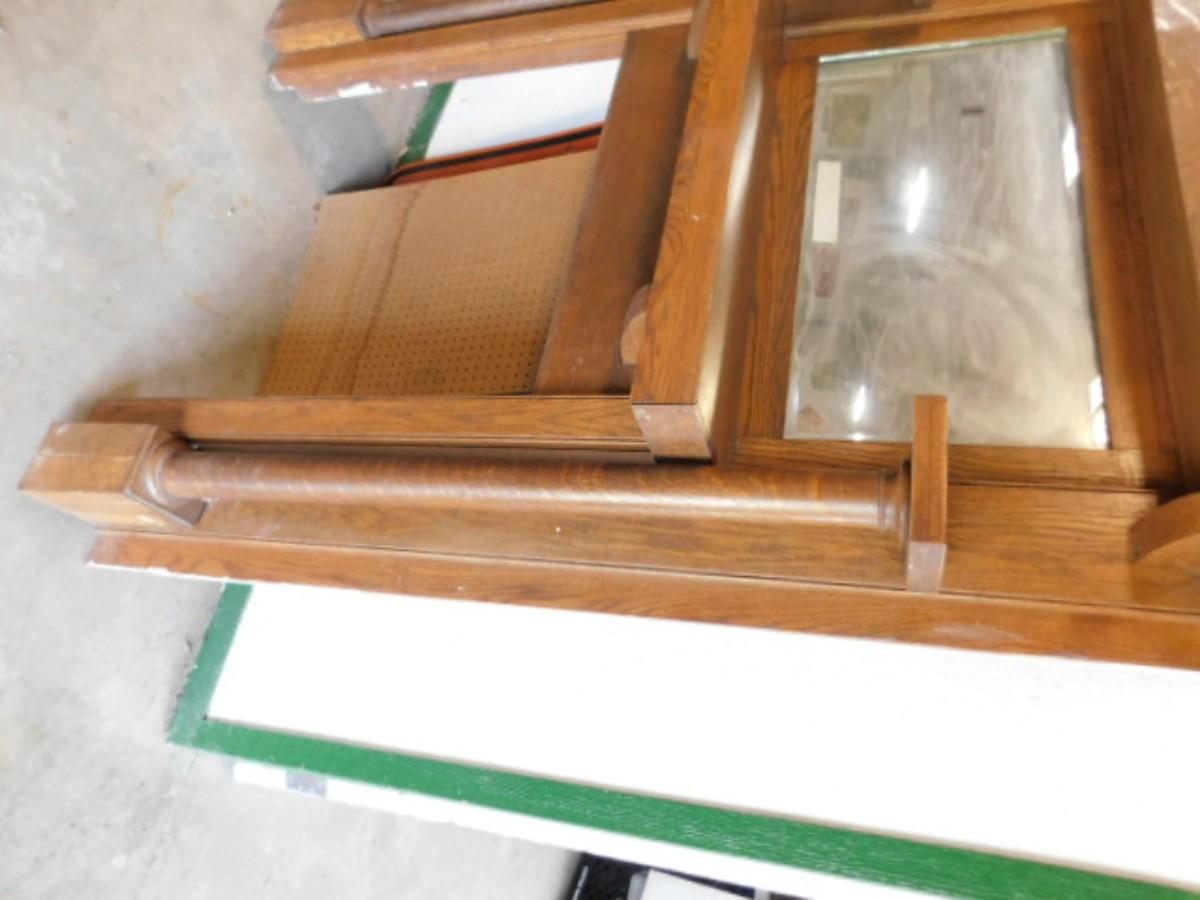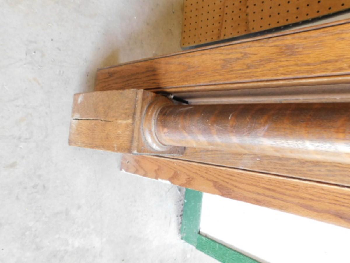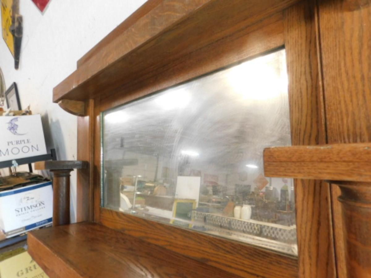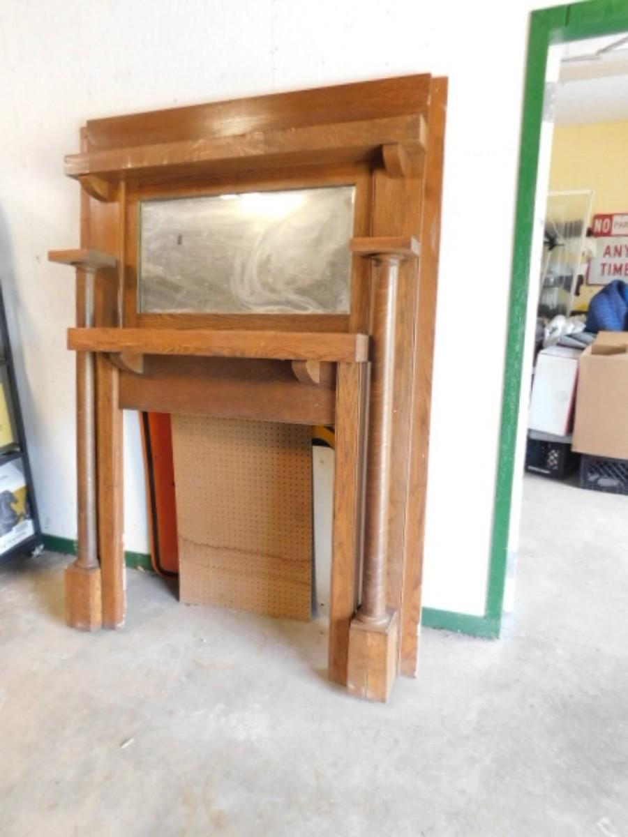 Antique Tiger Oak Mantle with Mirror has age-appropriate wear and scratches.