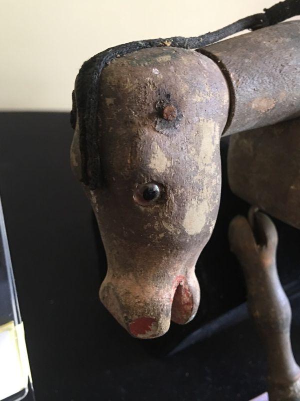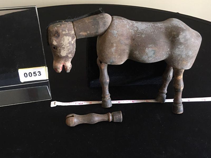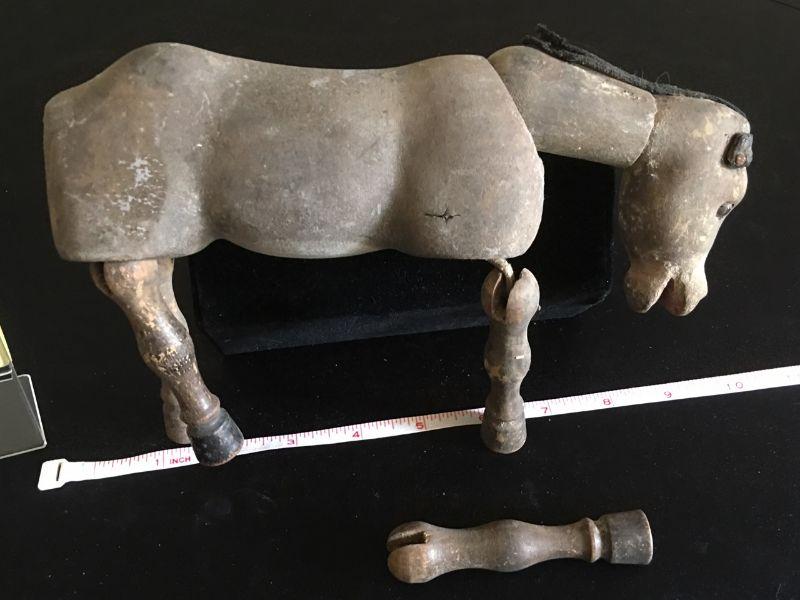 Antique Wooden Donkey with moving legs. Lots of charm on this fella. One legs needs to be reattached to the rope holding the other leg. See photos