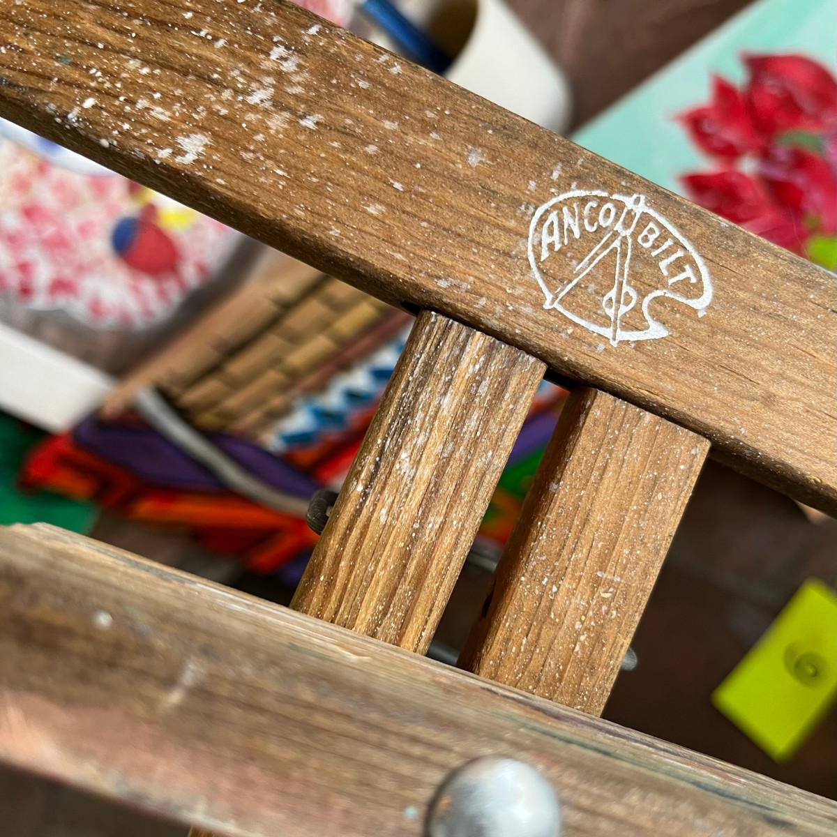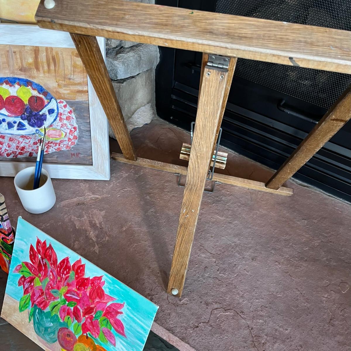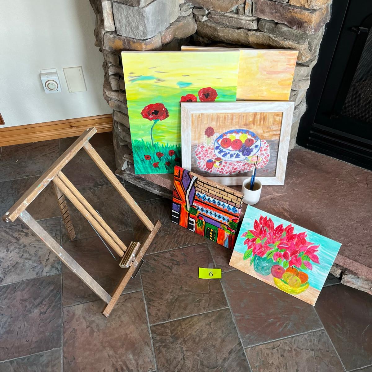 5 oil paintings, easel and a few brushes.