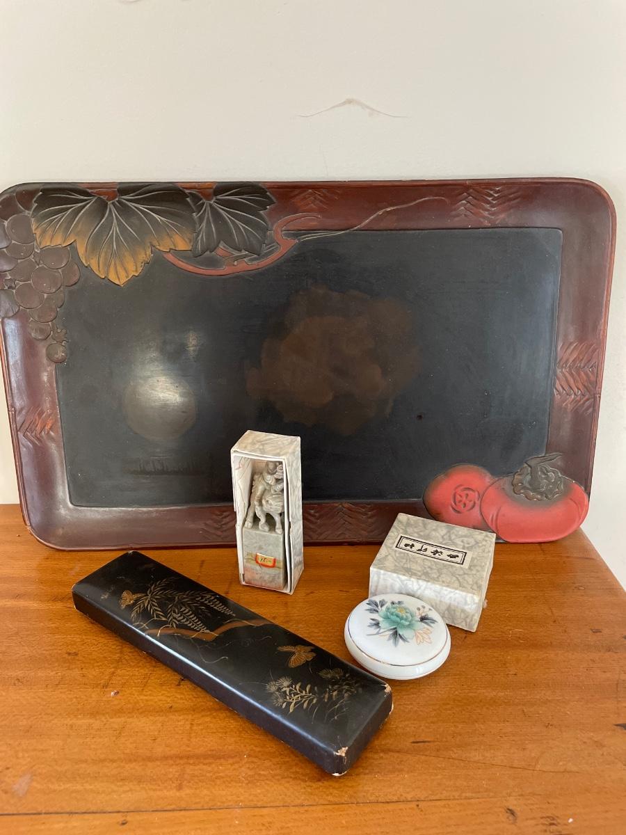 Beautiful marble stamp, trinket bowl, box and wood tray