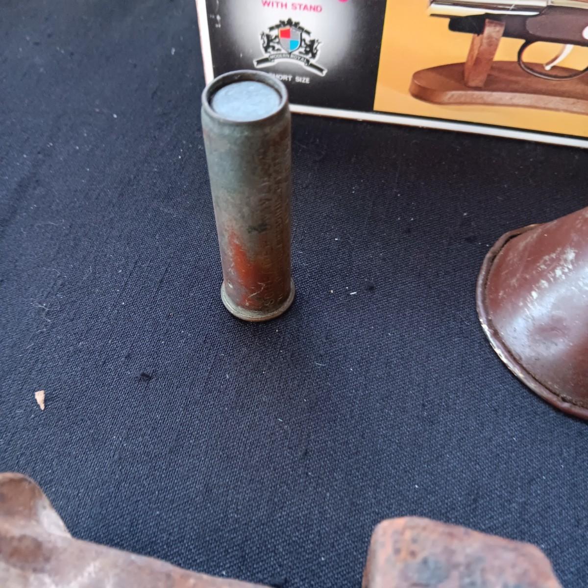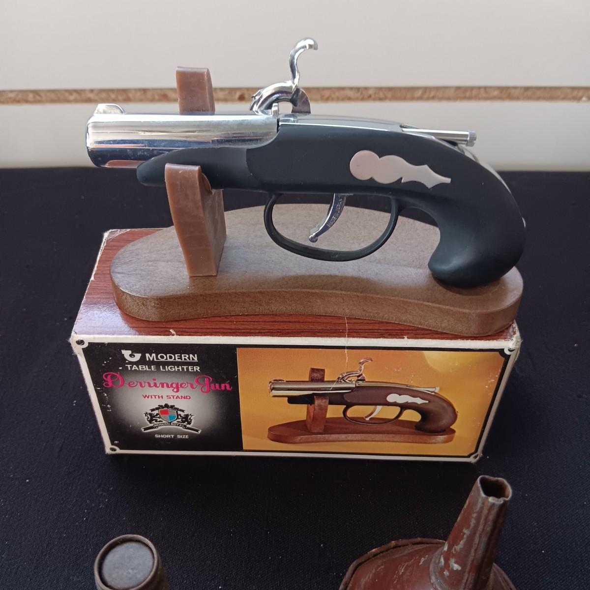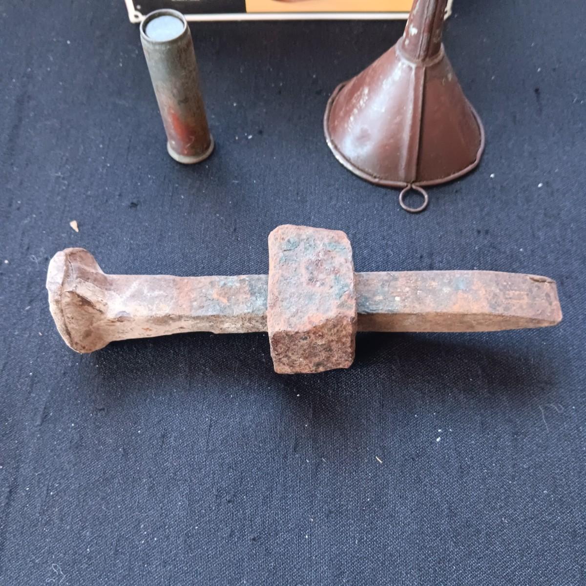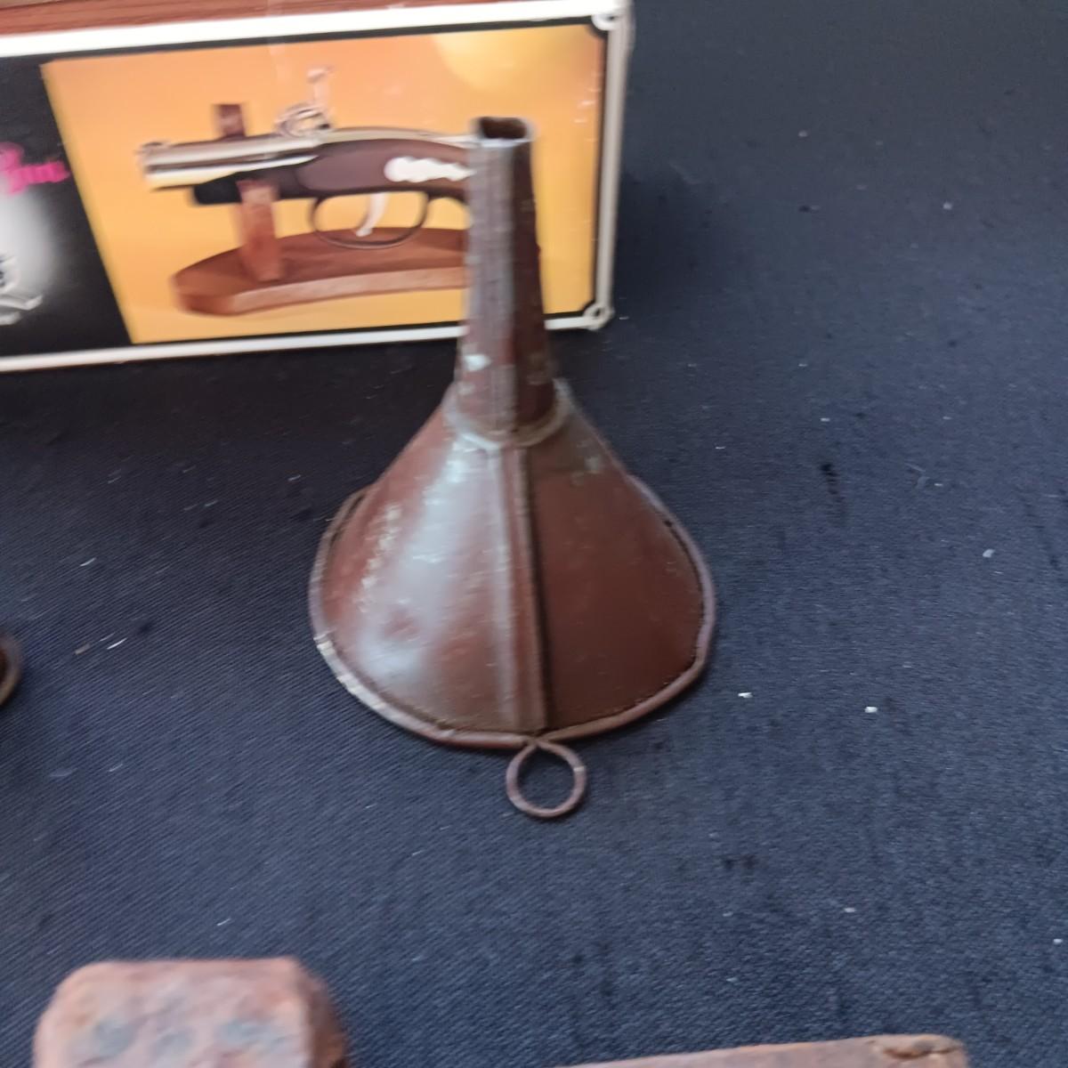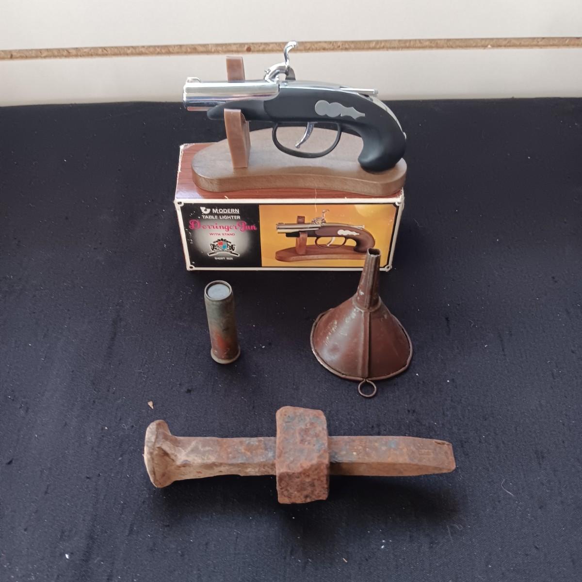AUTO BRASS TIRE PRESSURE GAUGE, RAILROAD SPIKE AND NUT, DERRINGER LIGHTER AND FUNNEL