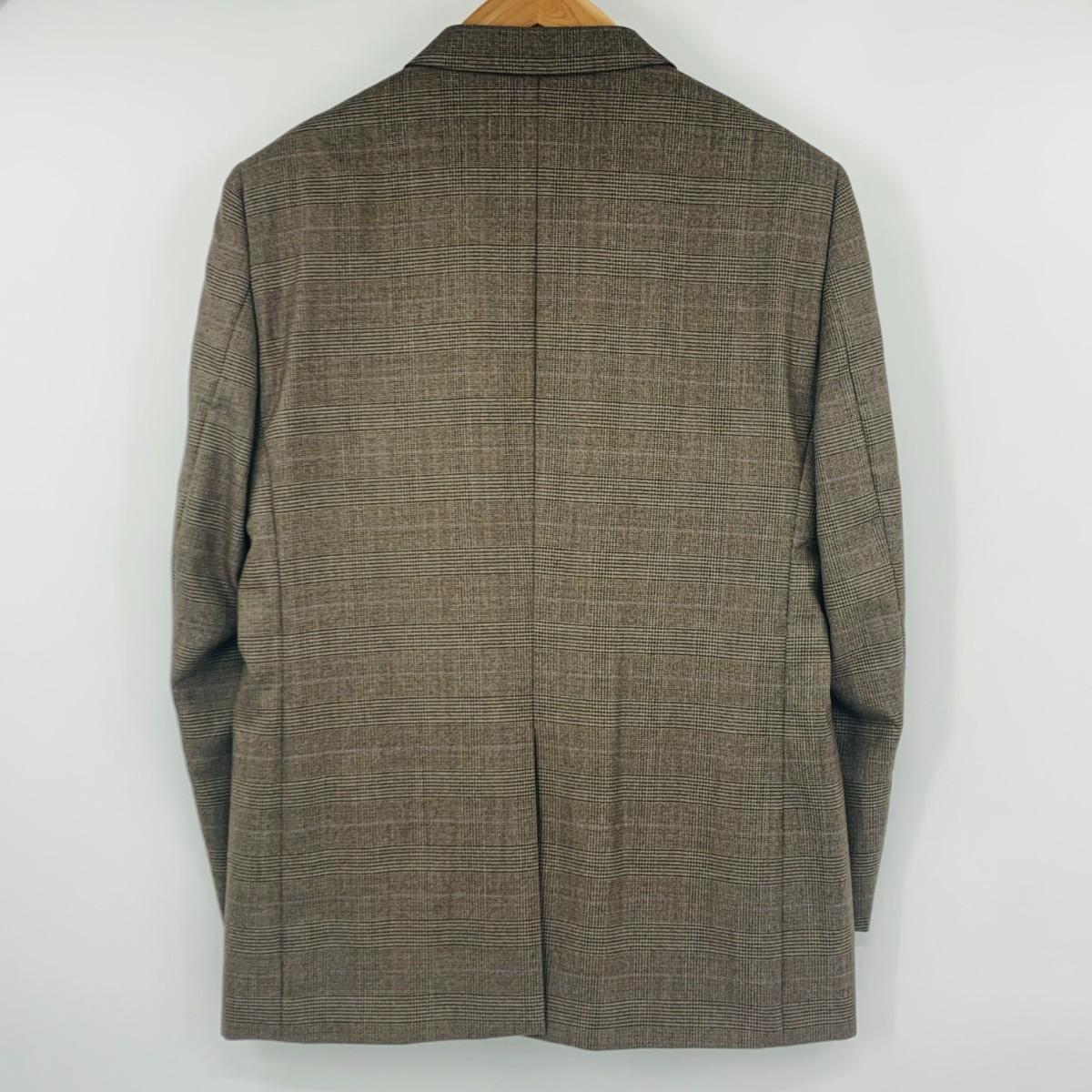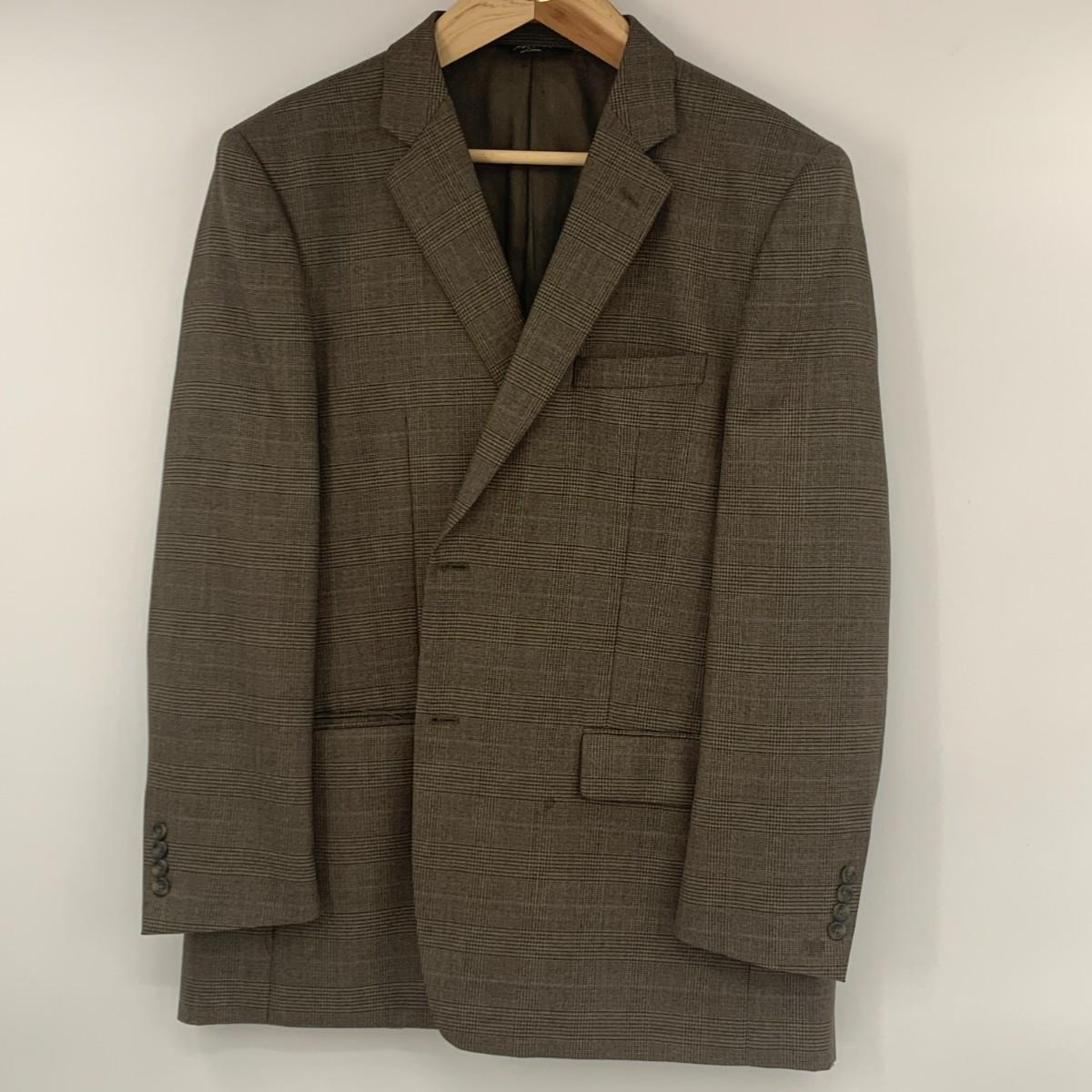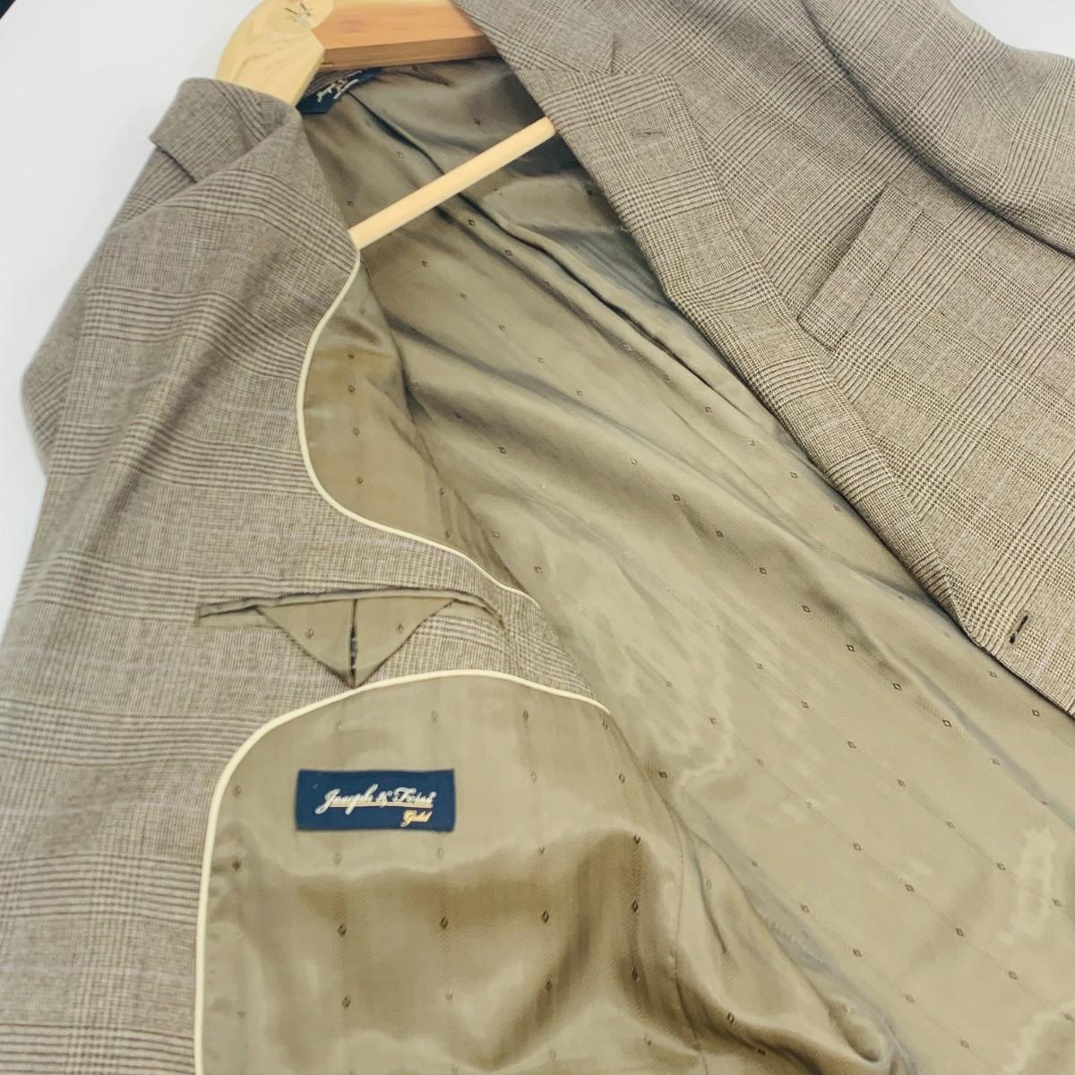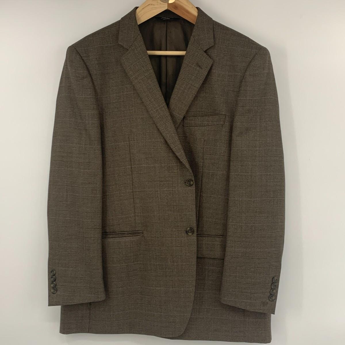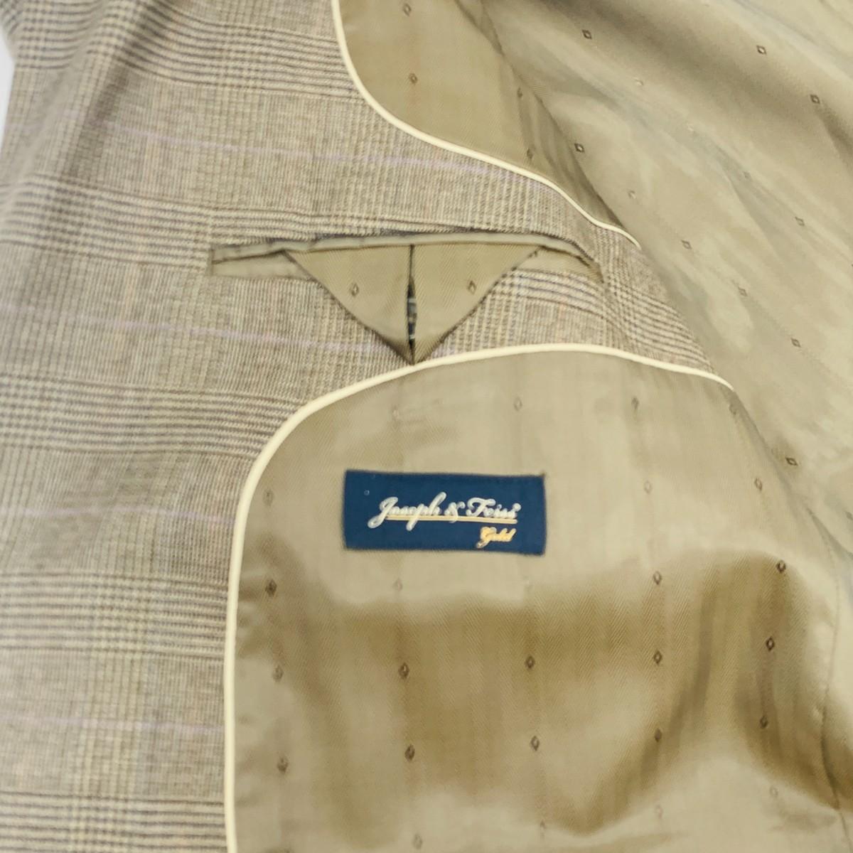 Jodeph & Feiss Brown Glen check vector houndstooth plaid print. Inside satin lined with white piping. Inside fastneing and jetted pockets. Outside flap pockets with jetted breast pocket.