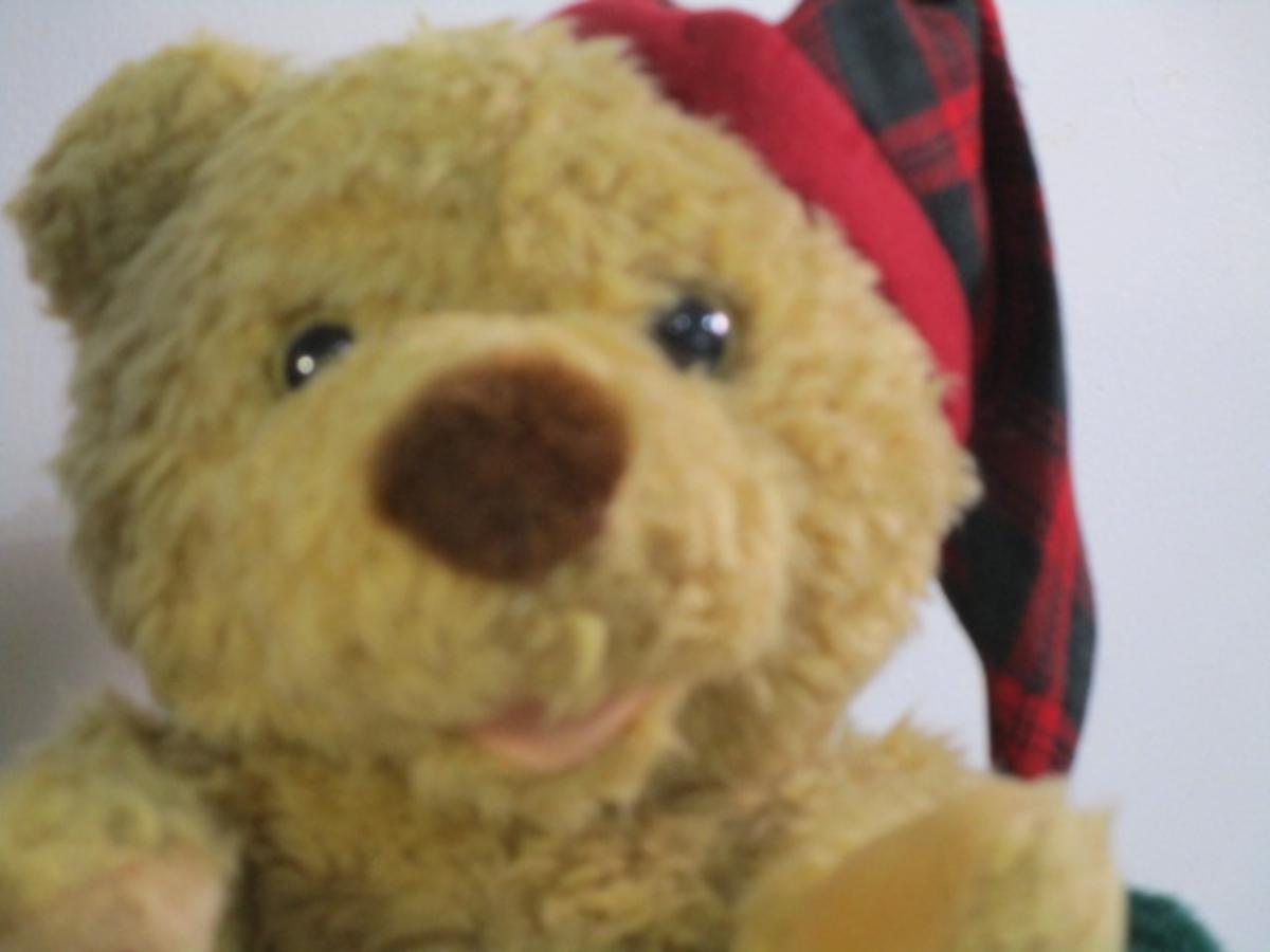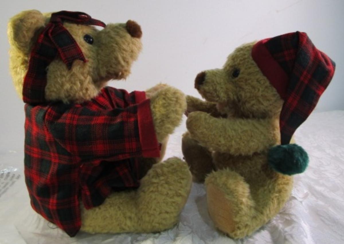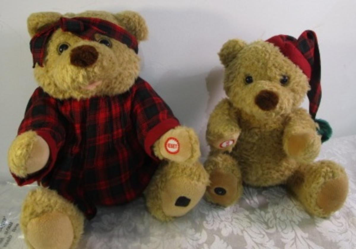 Bears talk to one another. Mommy bear tells "The Night Before Christmas" & then bears sing, mouths move, Each bear takes 3 AA batteries not included. Batteries must be in both bears to work. Mommy bear is 11", baby is 9" tall (both sitting).