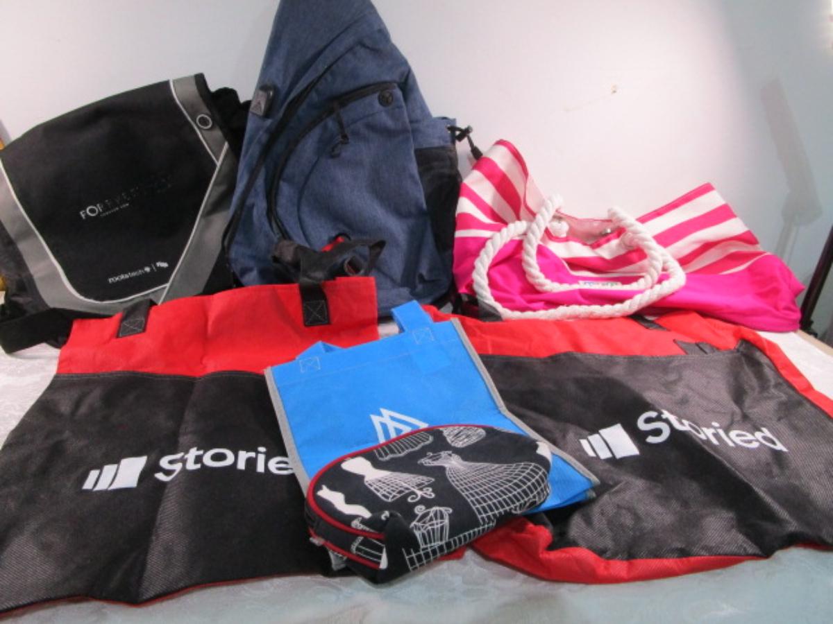 2 shopping bags, 1 backpack, 1 messenger bag, 1 small shopping bag, 1 makeup bag, 1 beach bag