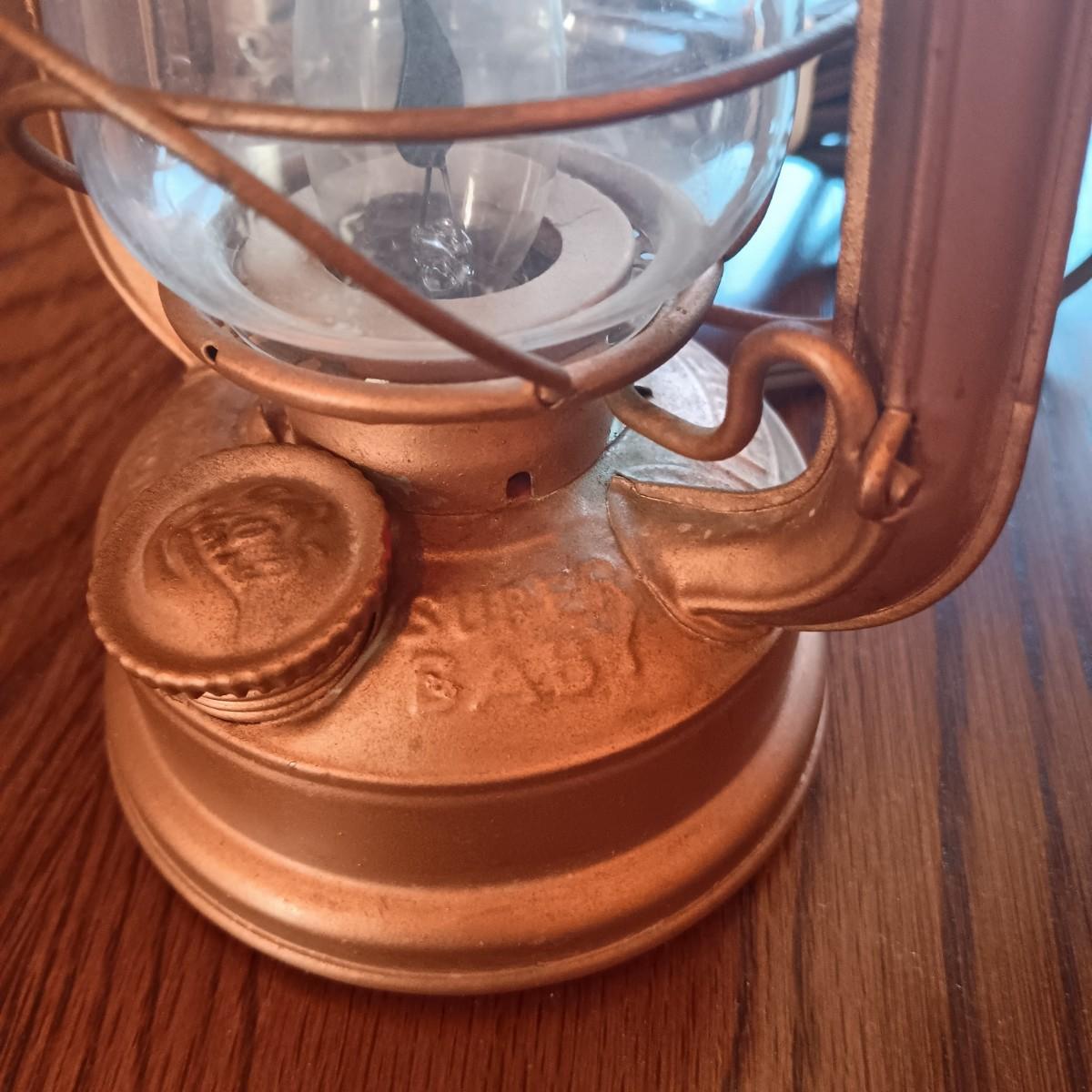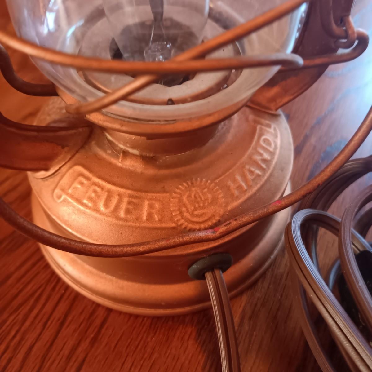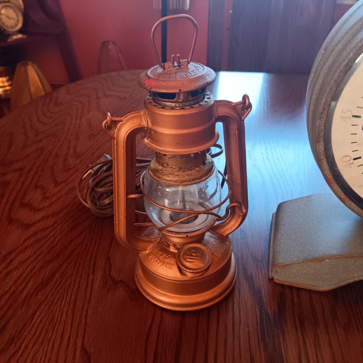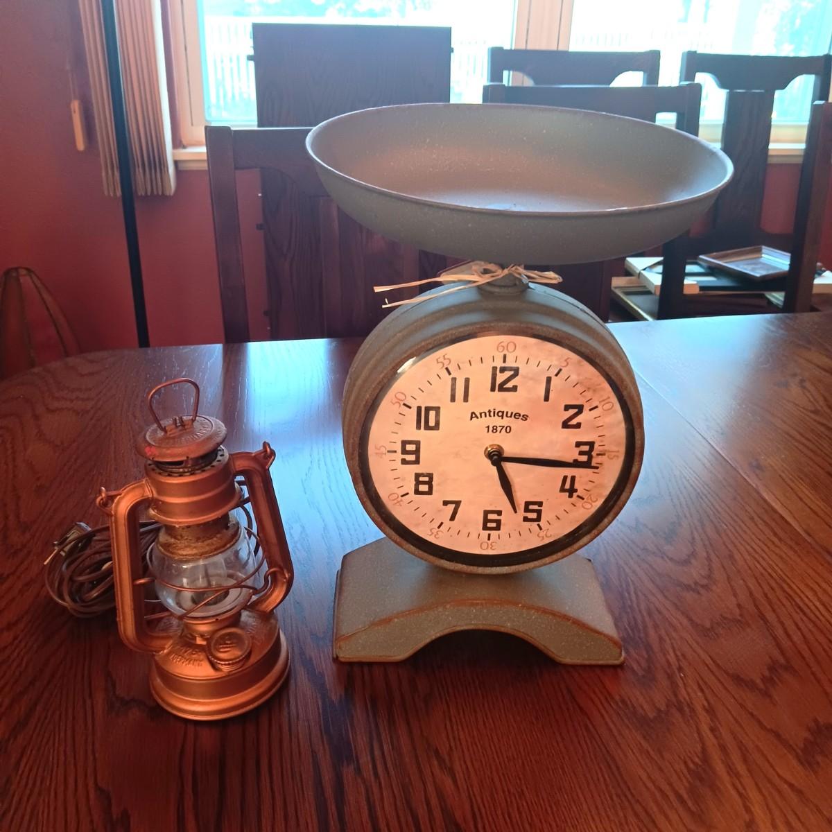 BATTERY OPERATED CLOCK THAT LOOKS LIKE OLD SCALE & A SUPER BABY FEUERHAND LANTERN MADE INTO A LAMP