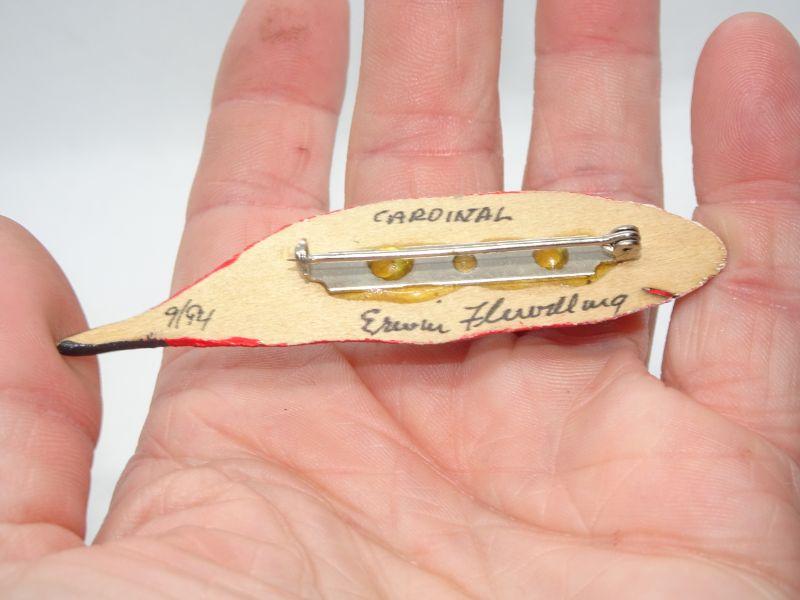 Beautiful Cardinal Hand Painted, Carved Feather Brooch - Signed