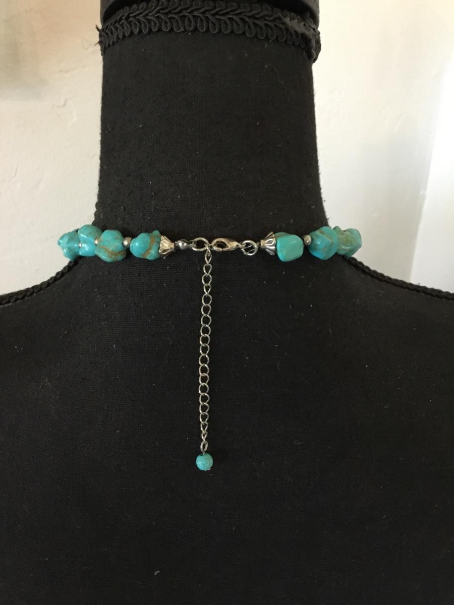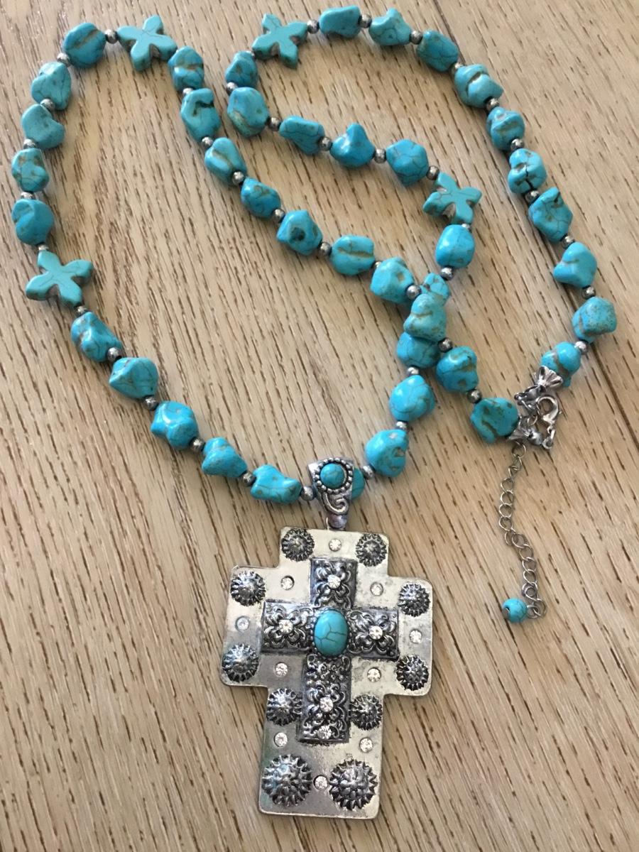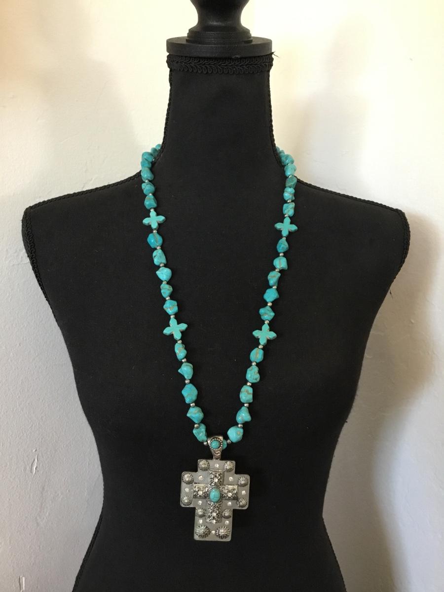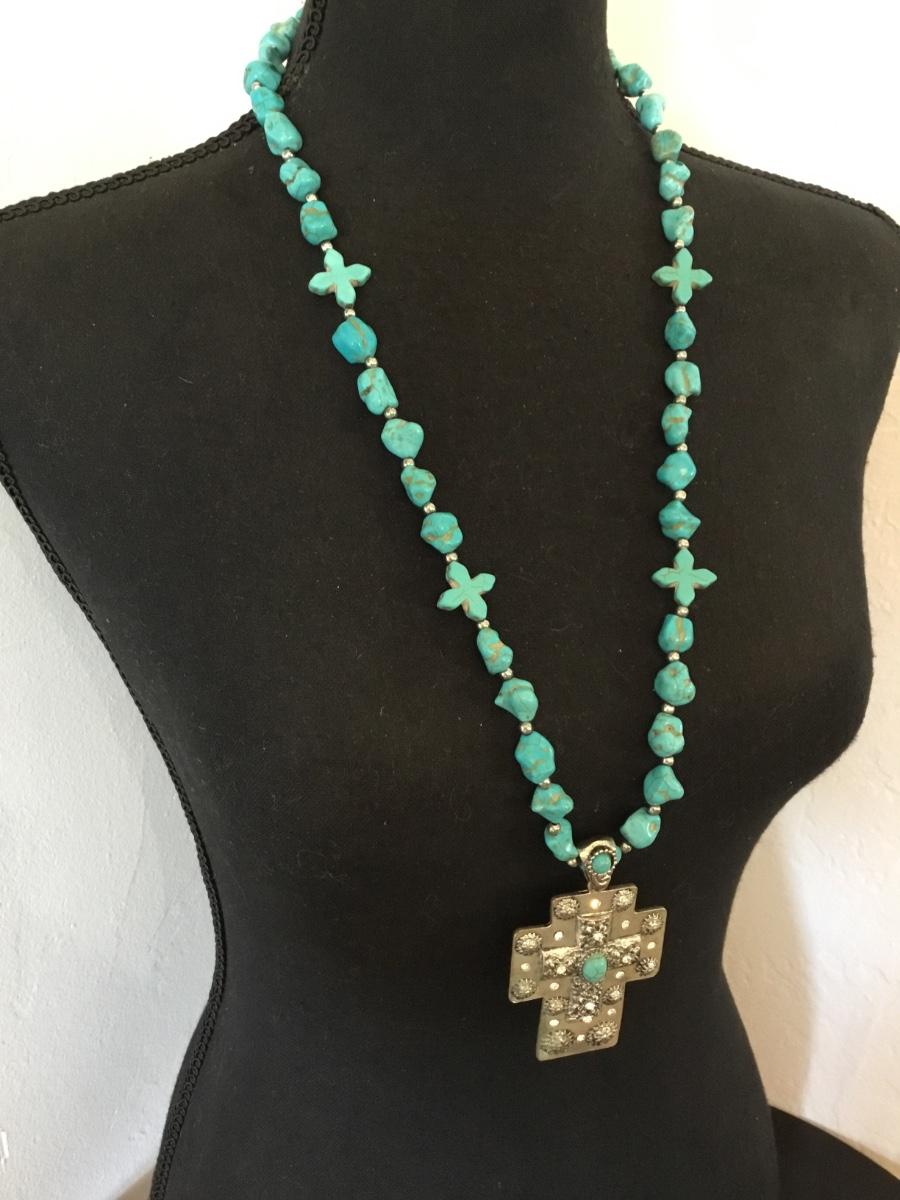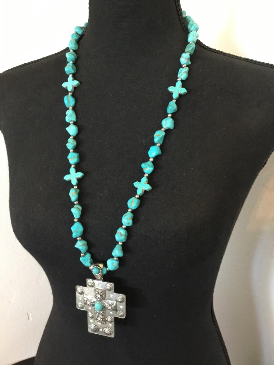 Beautiful South western faux turquoise Silver tone, cross statement, long statement, necklace.