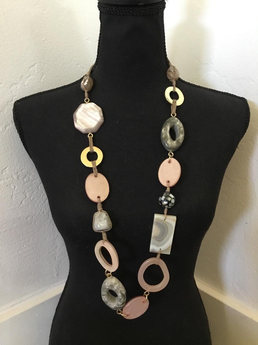 Beautiful stone and shell and acrylic. Beaded statement necklace. Very nice quality,