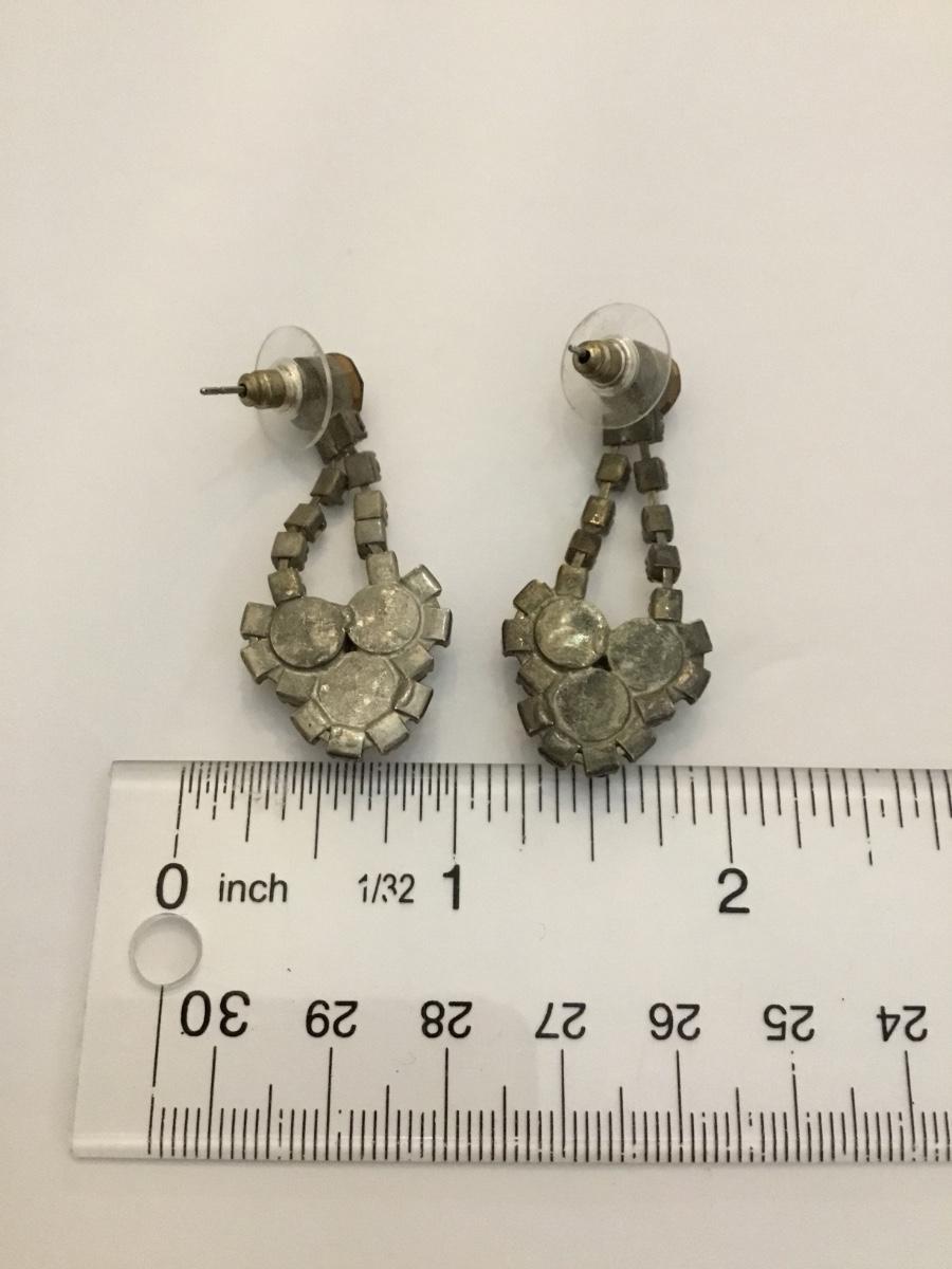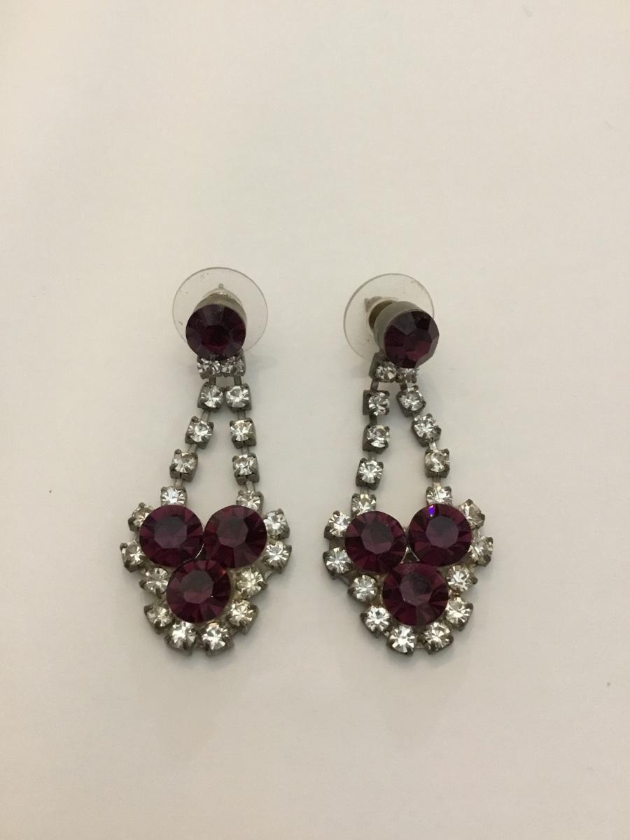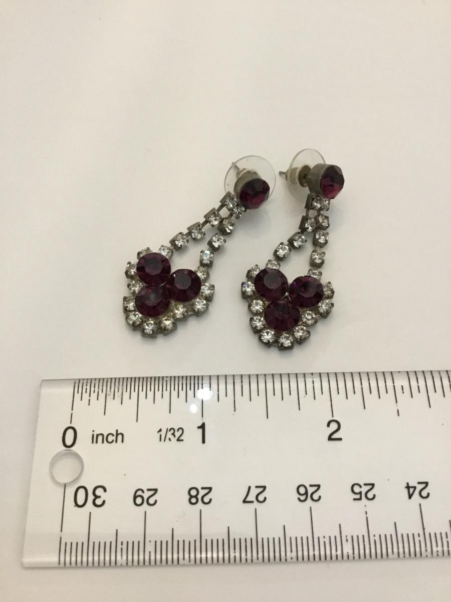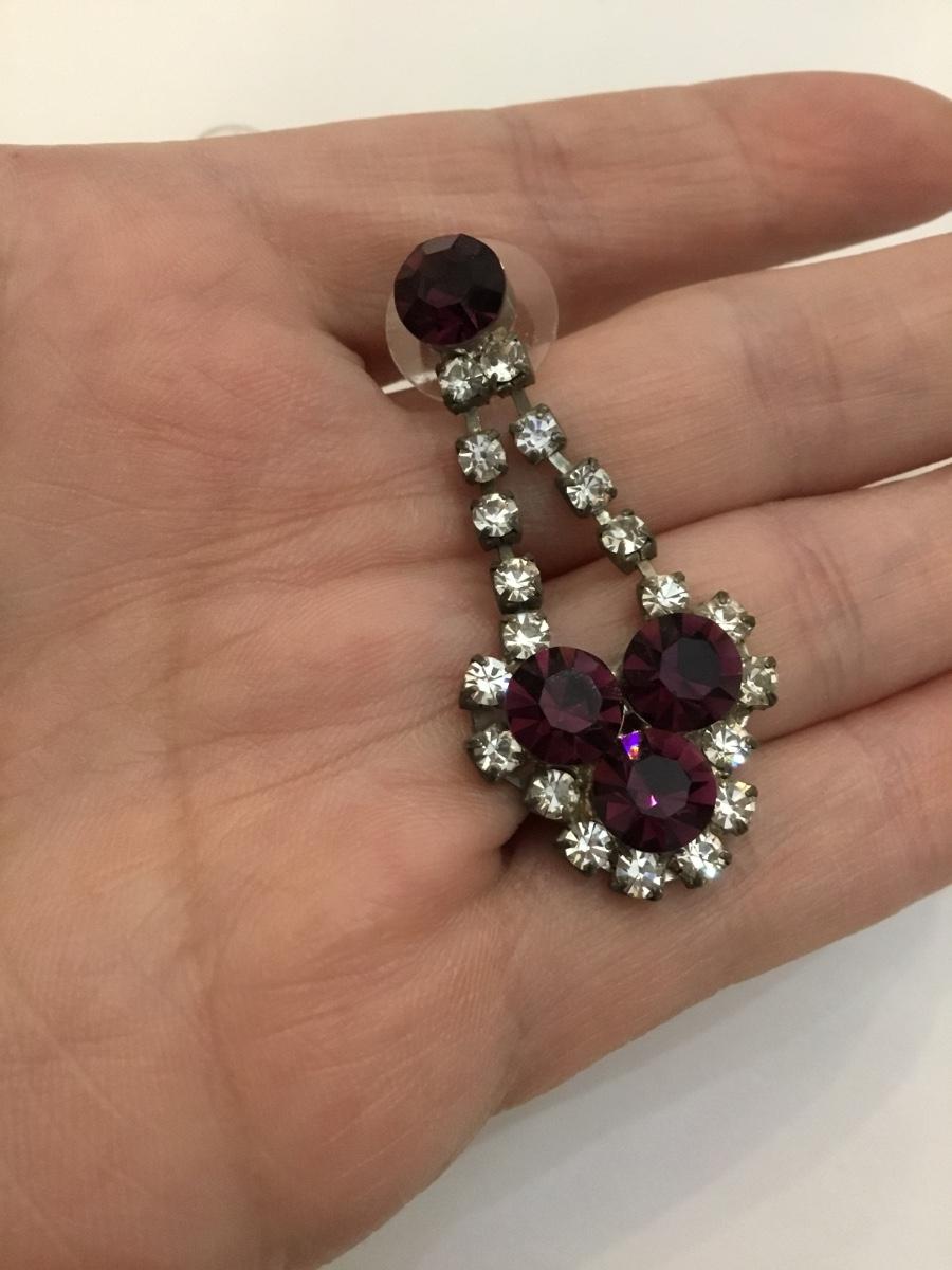 Beautiful, vintage, silver toned, crystal rhinestone, dark plum, purple drop dangle earrings