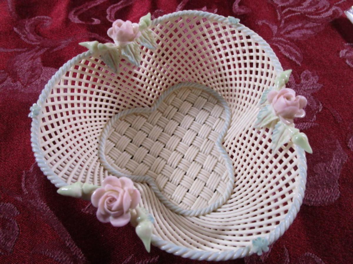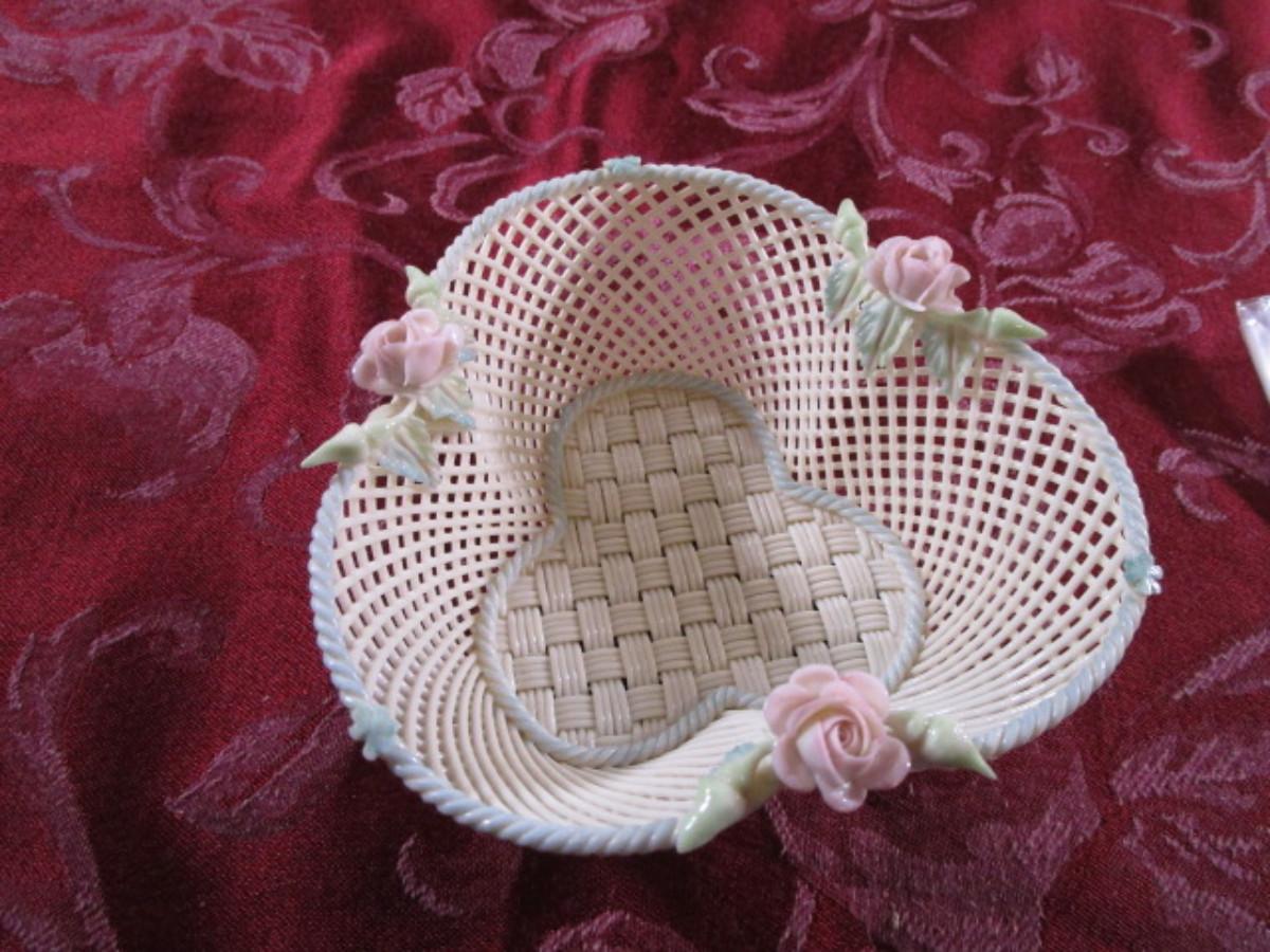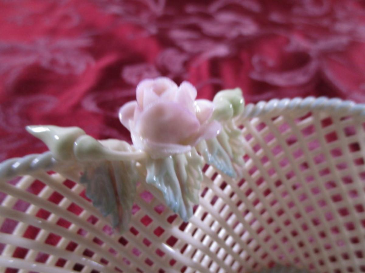 Has pink roses, 2 roses have small chips (have pieces), basket is cream colored, 2" tall x 5" across