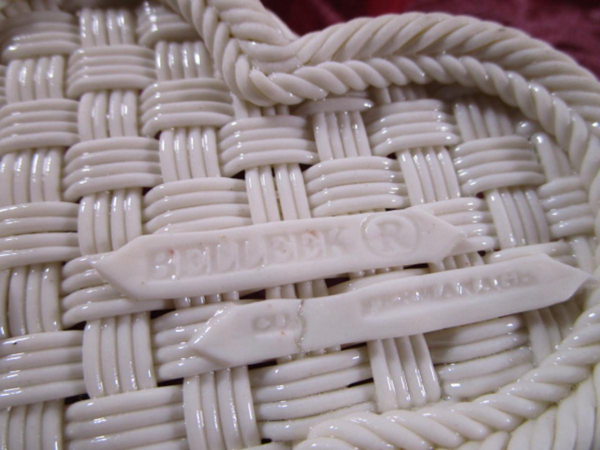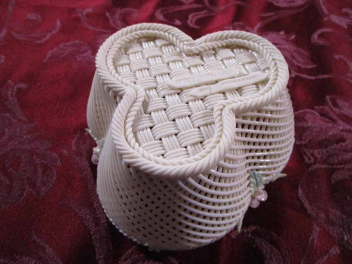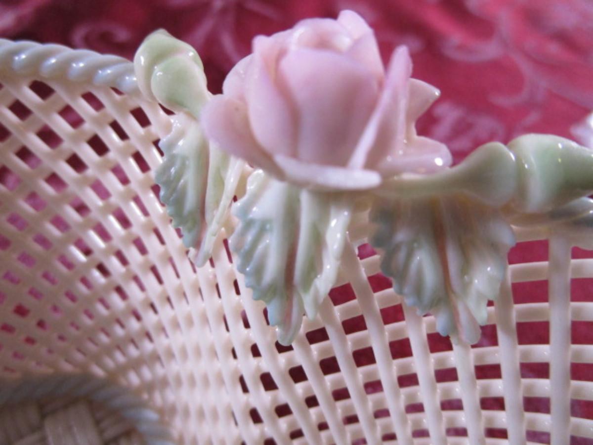 Has pink roses, 2 roses have small chips (have pieces), basket is cream colored, 2" tall x 5" across