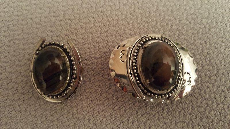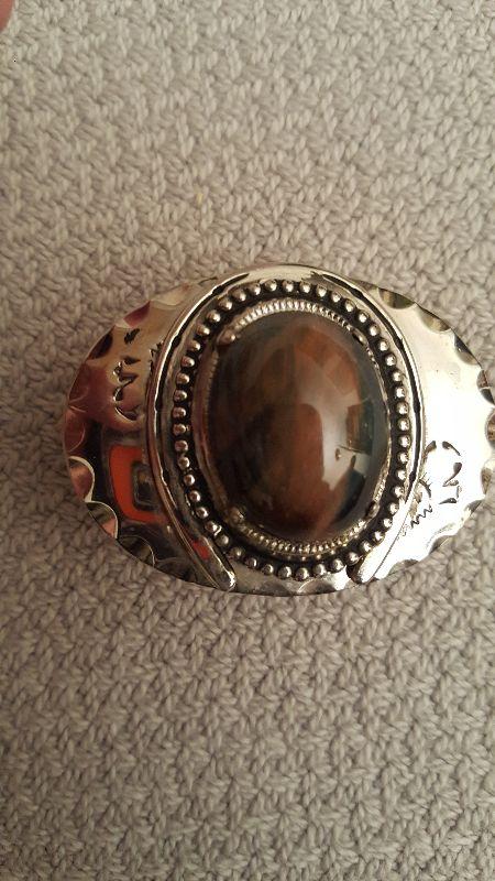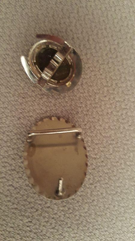This auction lot is for a nifty matching Belt Buckle & Bolo Tie Pin. Both items are silver-toned and have a showy stone inset. Great for western-style wear or any other use you can imagine. Donated by Oklahoman Kay Whitlock. The belt buckle