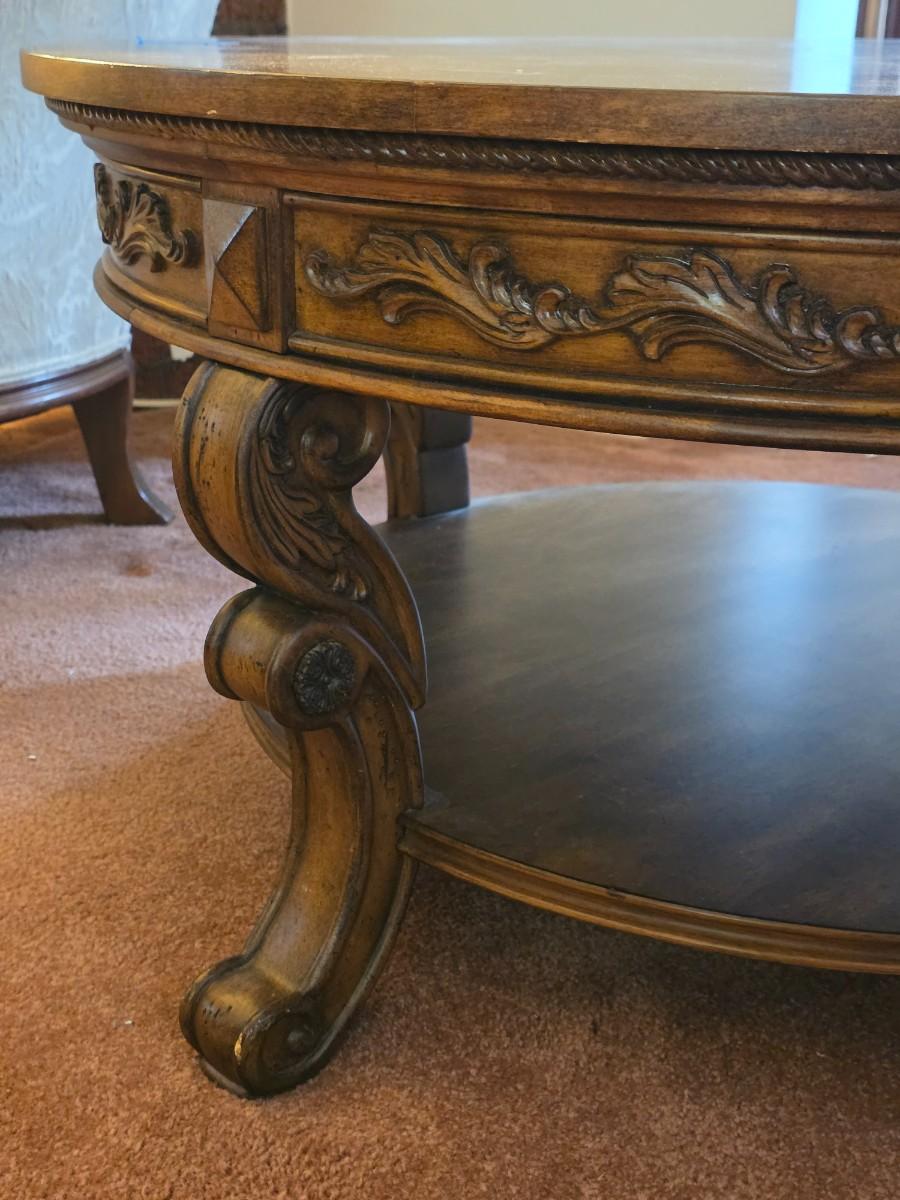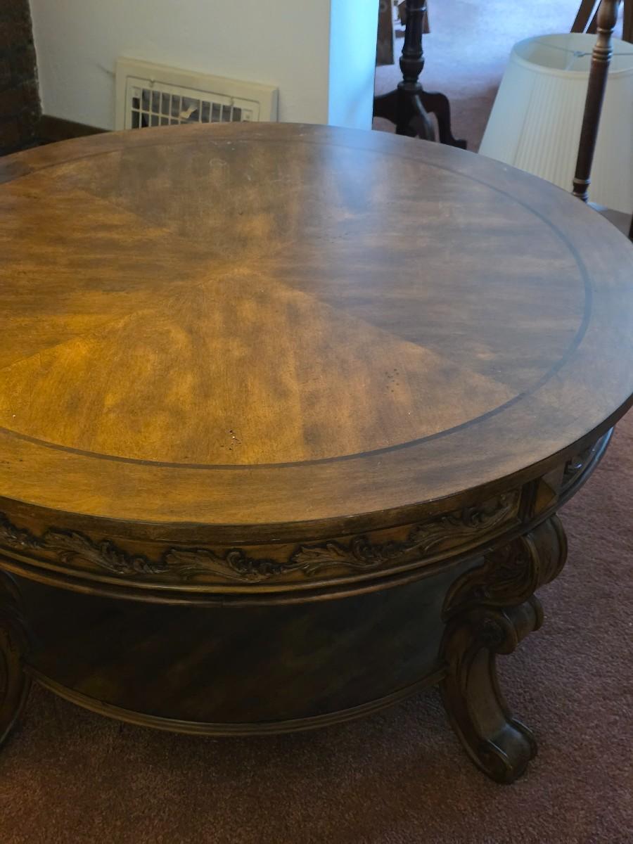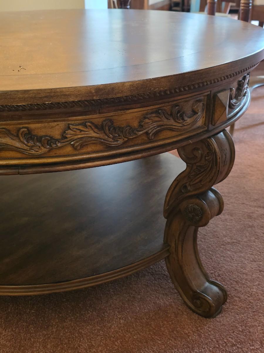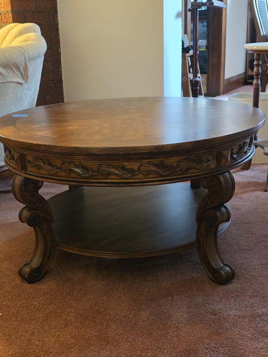 Beautifully carver round birch cocktail table. Measures 40" across 20" H. Located on main floor, bring help to remove