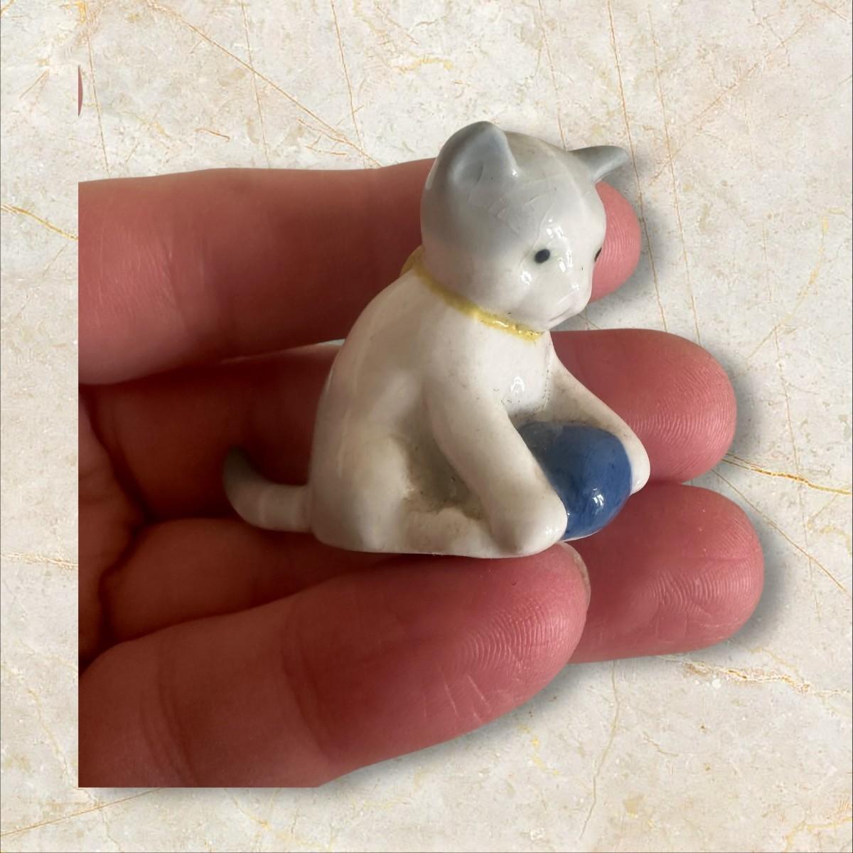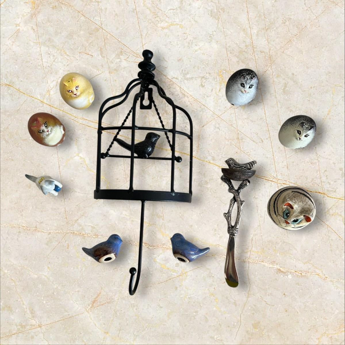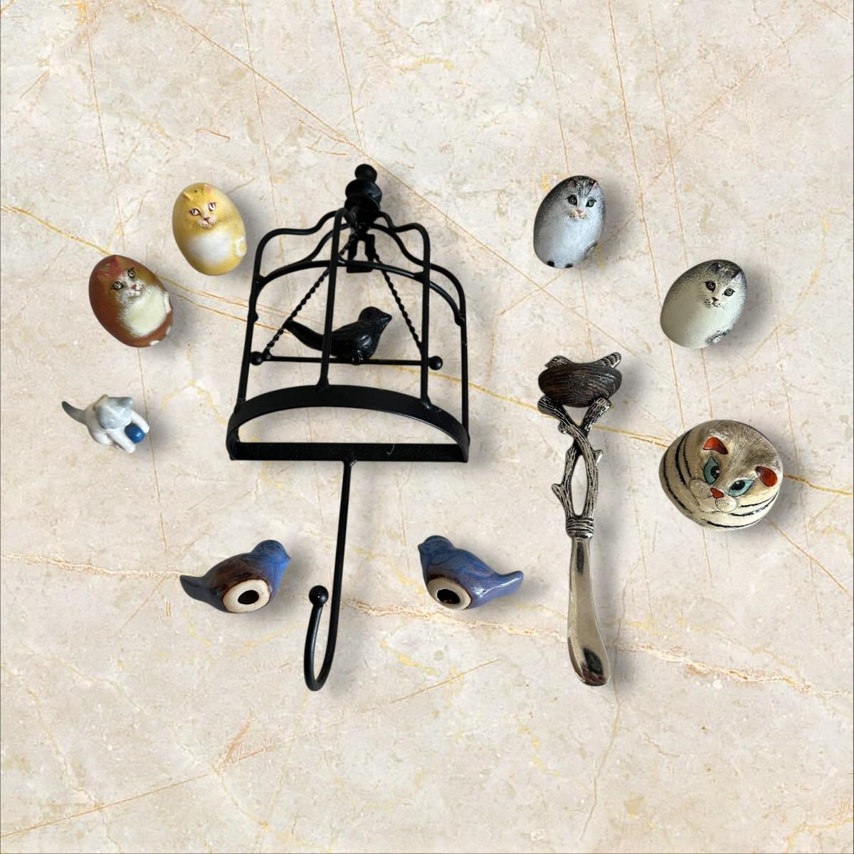 Birds and Kitties Cuteness Lot- small bluebirds appears to be handmade pottery and could be made into earrings or ornaments.