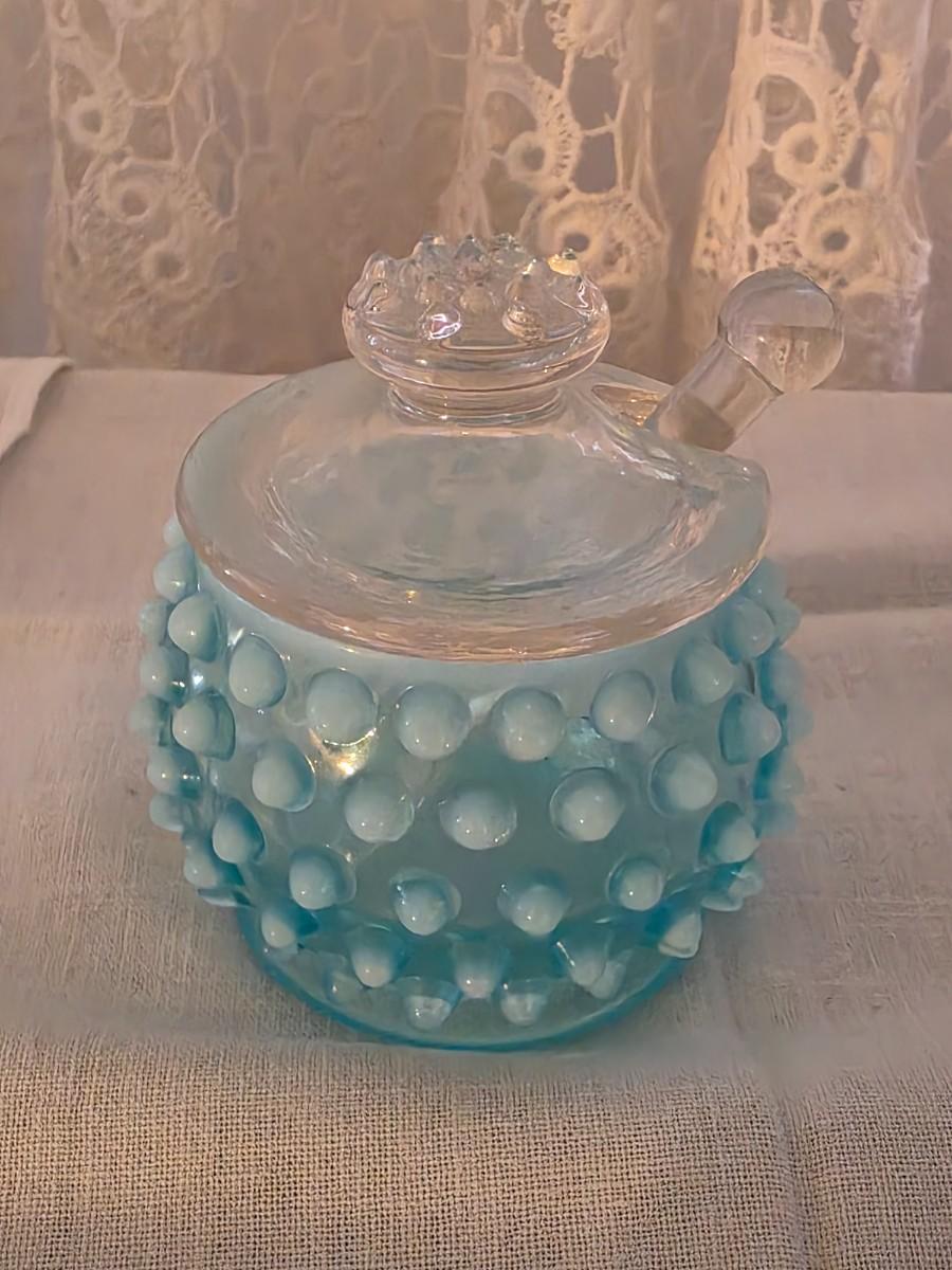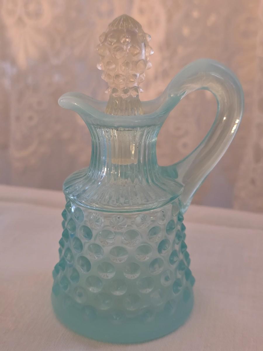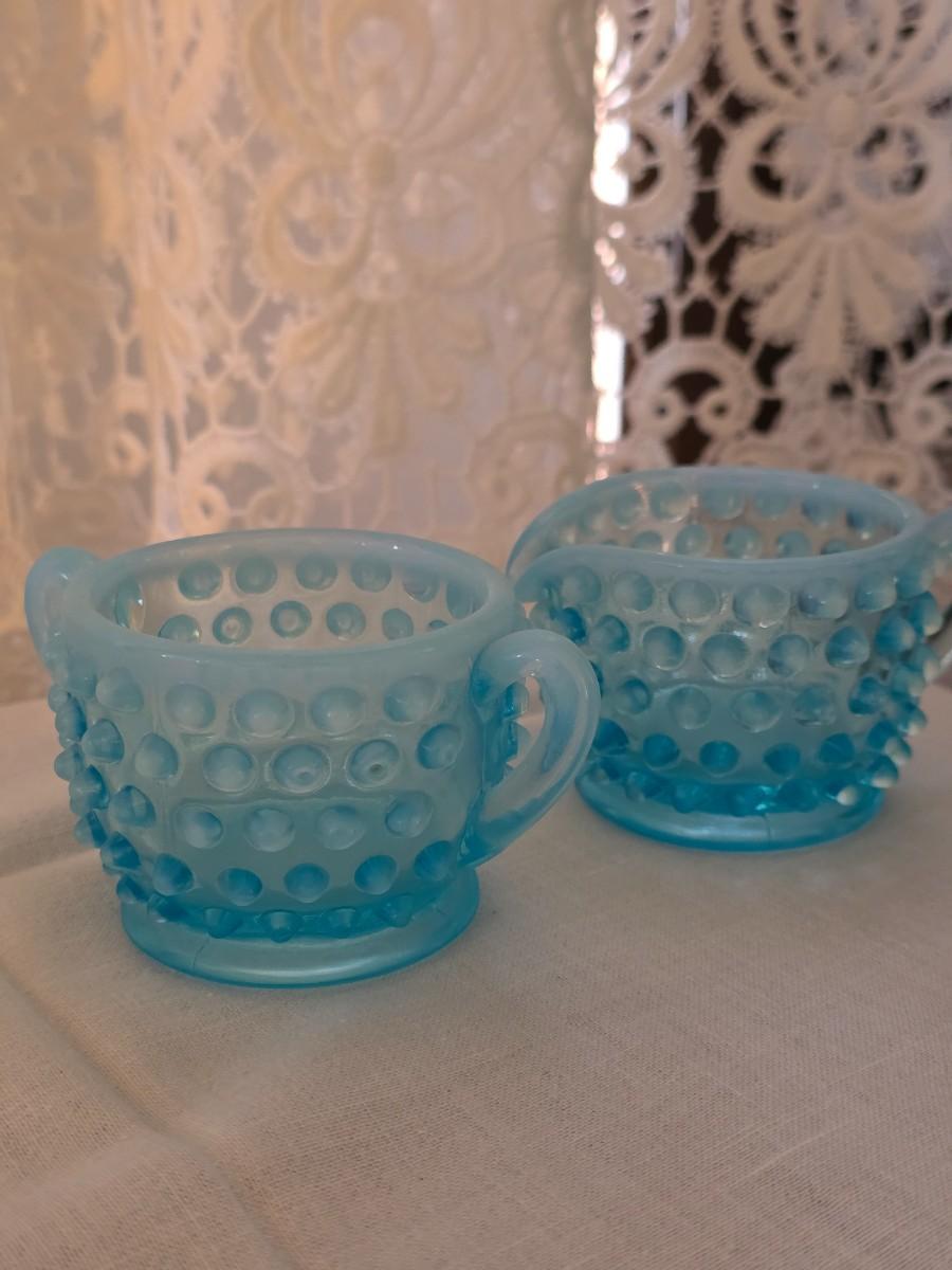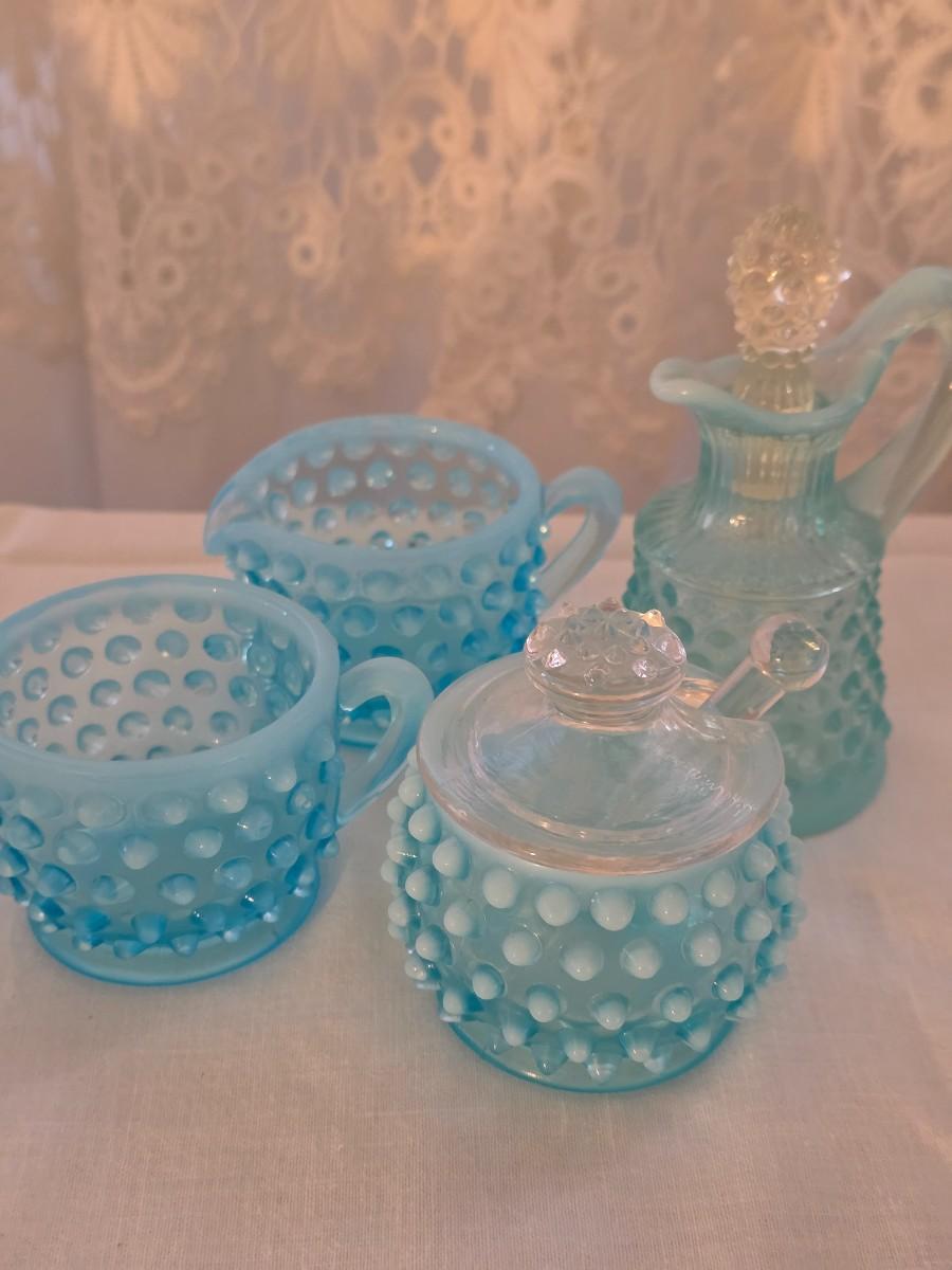 Great collection of blue hobnail, including cruet, condiment jar, and Creamer and sugar set.