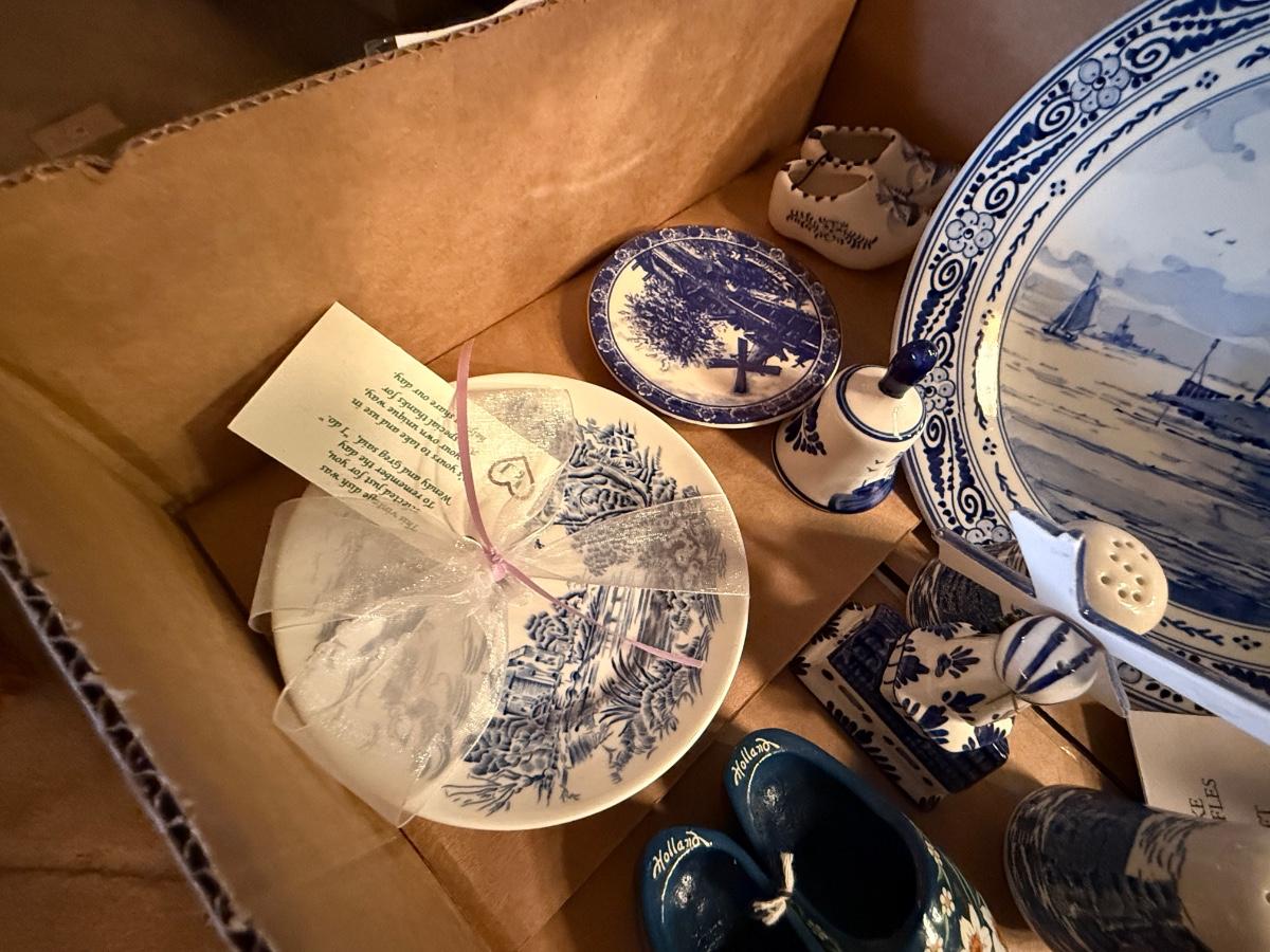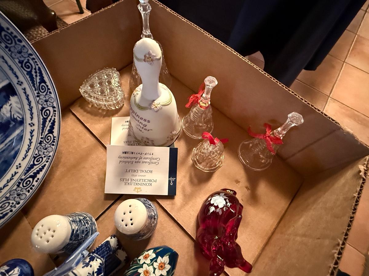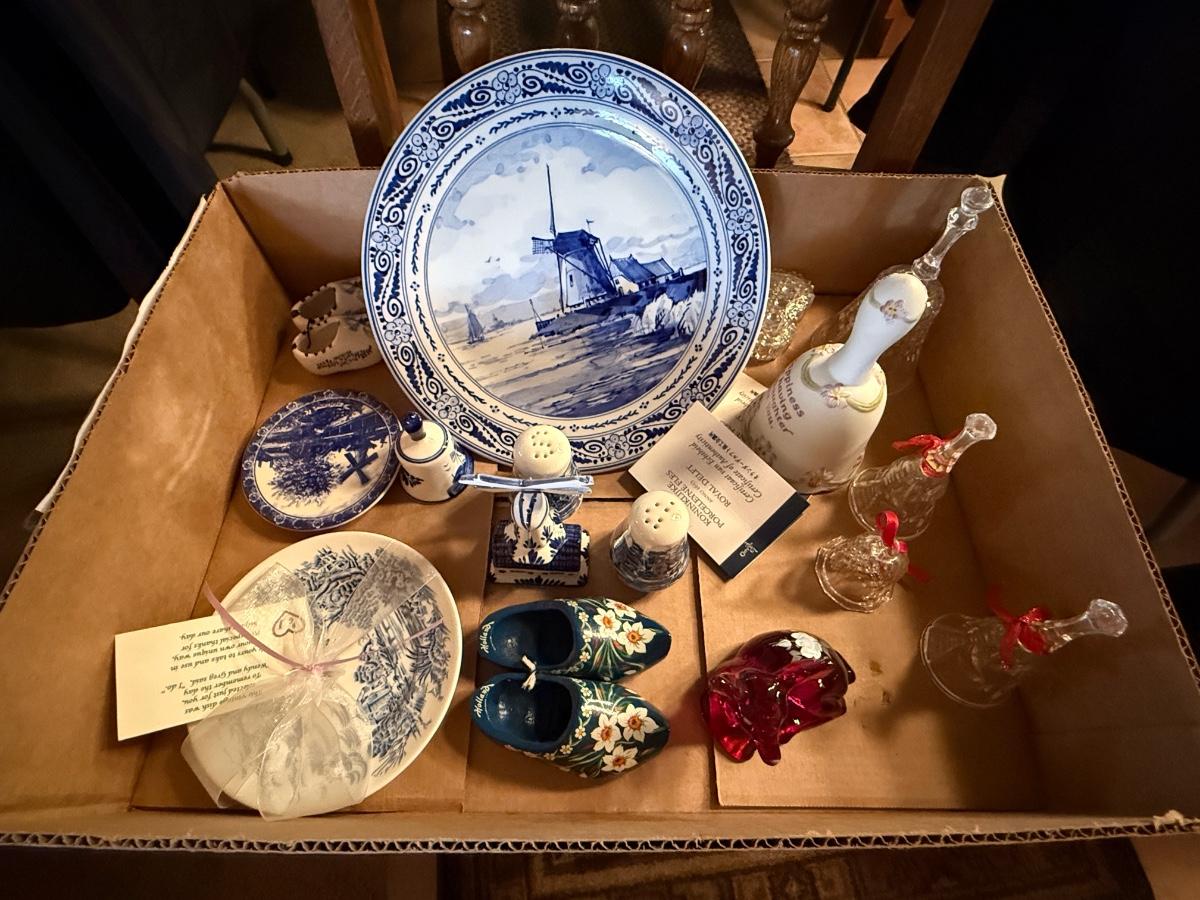 Box of collectible porcelain & 6 Bells/Salt & Pepper shakers/Dutch Clogs