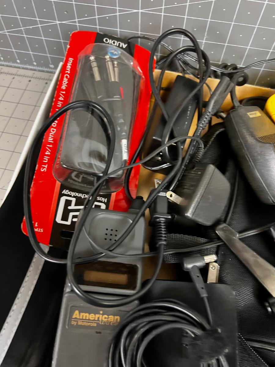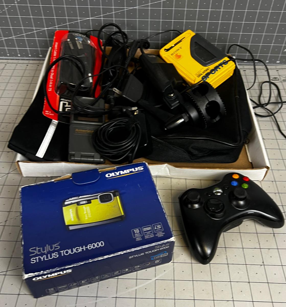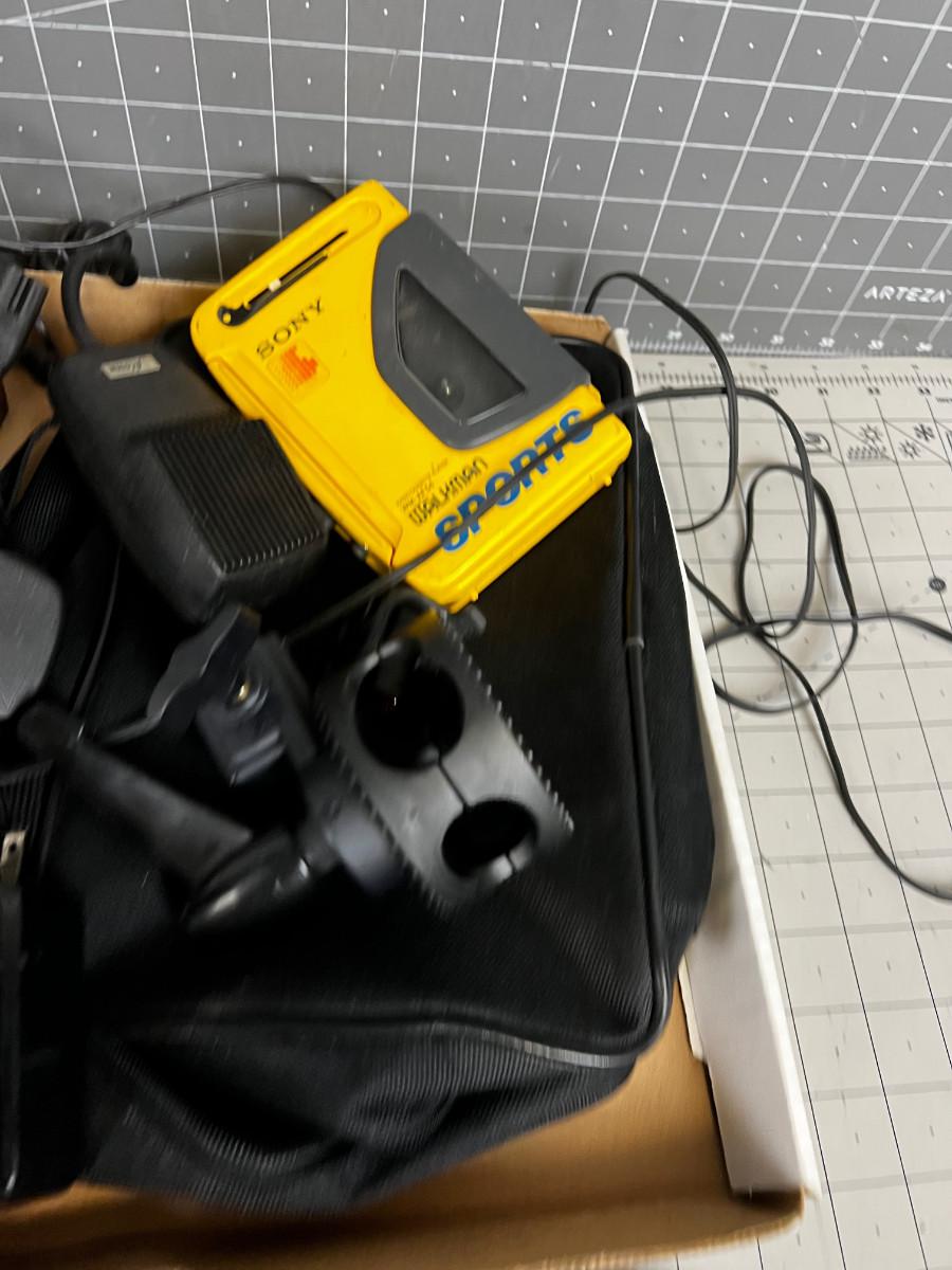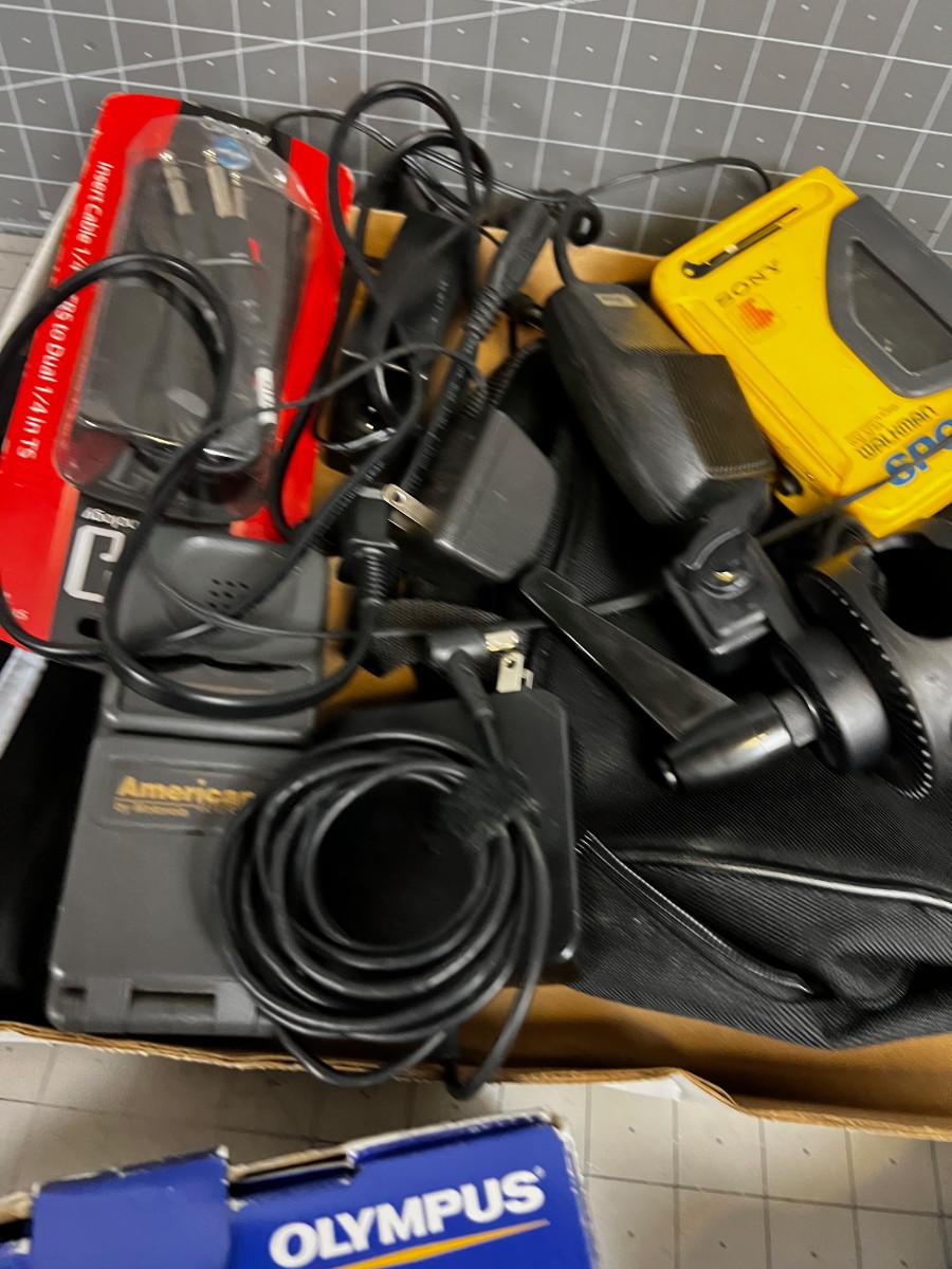 Box of Electronics and Accessories: Camera, Walkman, Game Controller